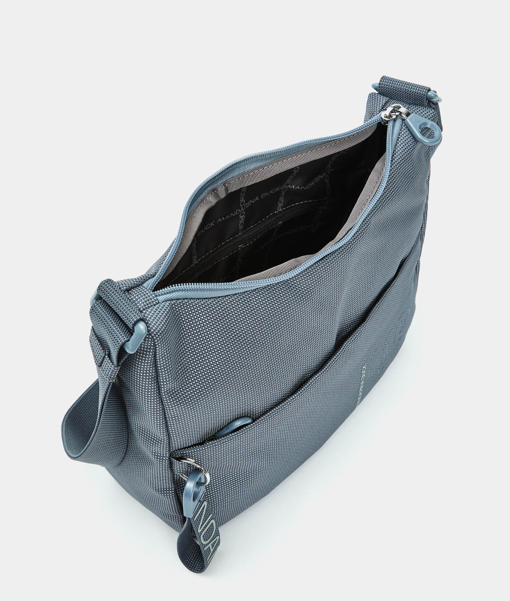 Medium crossbody bag with flat front pocket and zipper in fabric. Double portability, smart front and internal pockets, personalized detaills and adjustable jacquard shoulder strap.