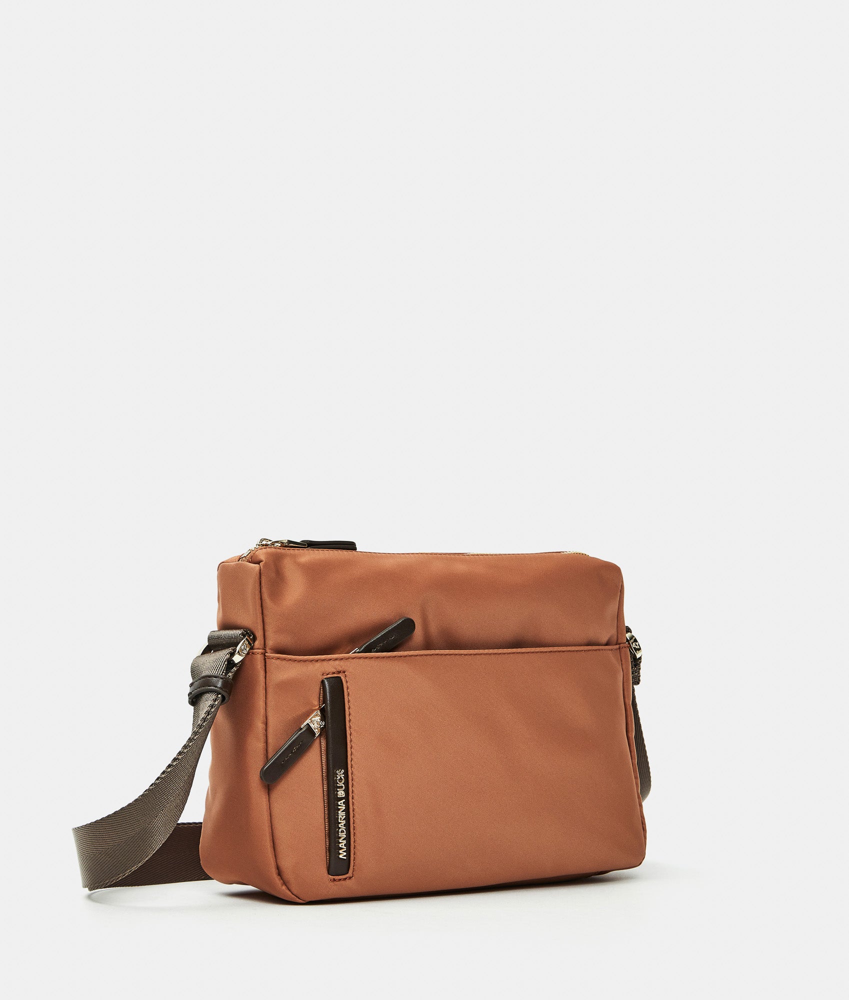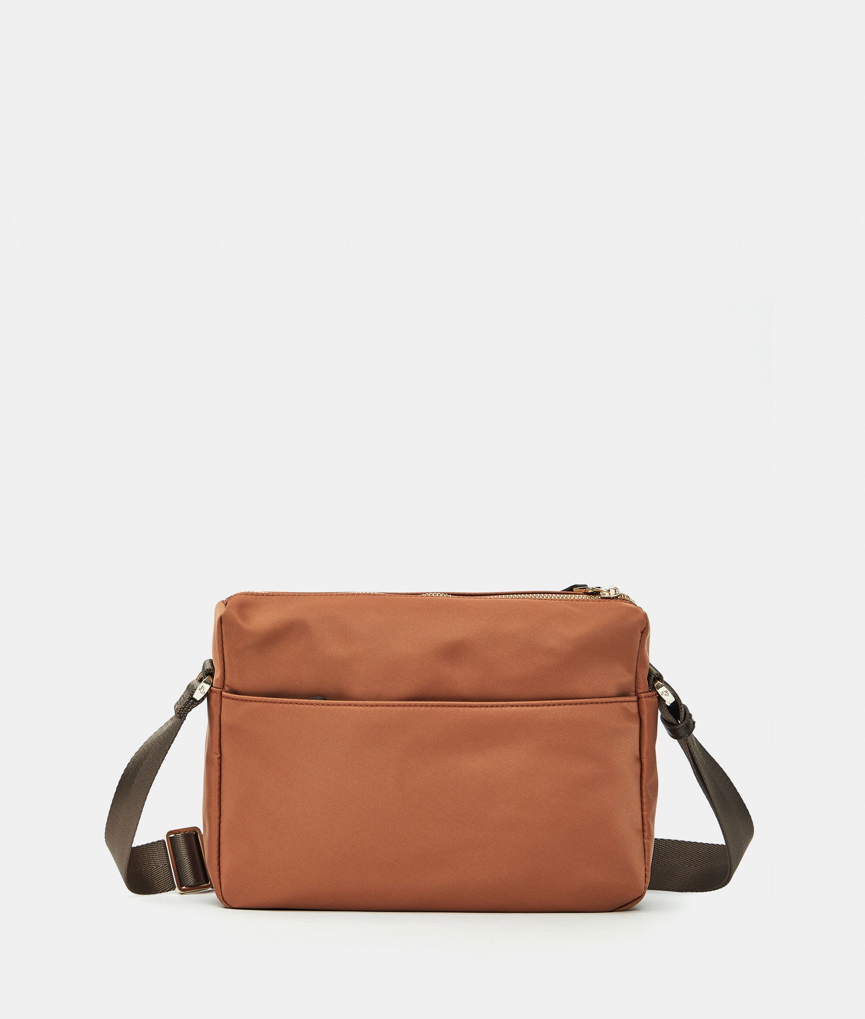 Medium crossbody bag with external zip pocket in fabric. Dual portability, smart front and internal pockets, personalized detaills and adjustable jacquard shoulder strap.