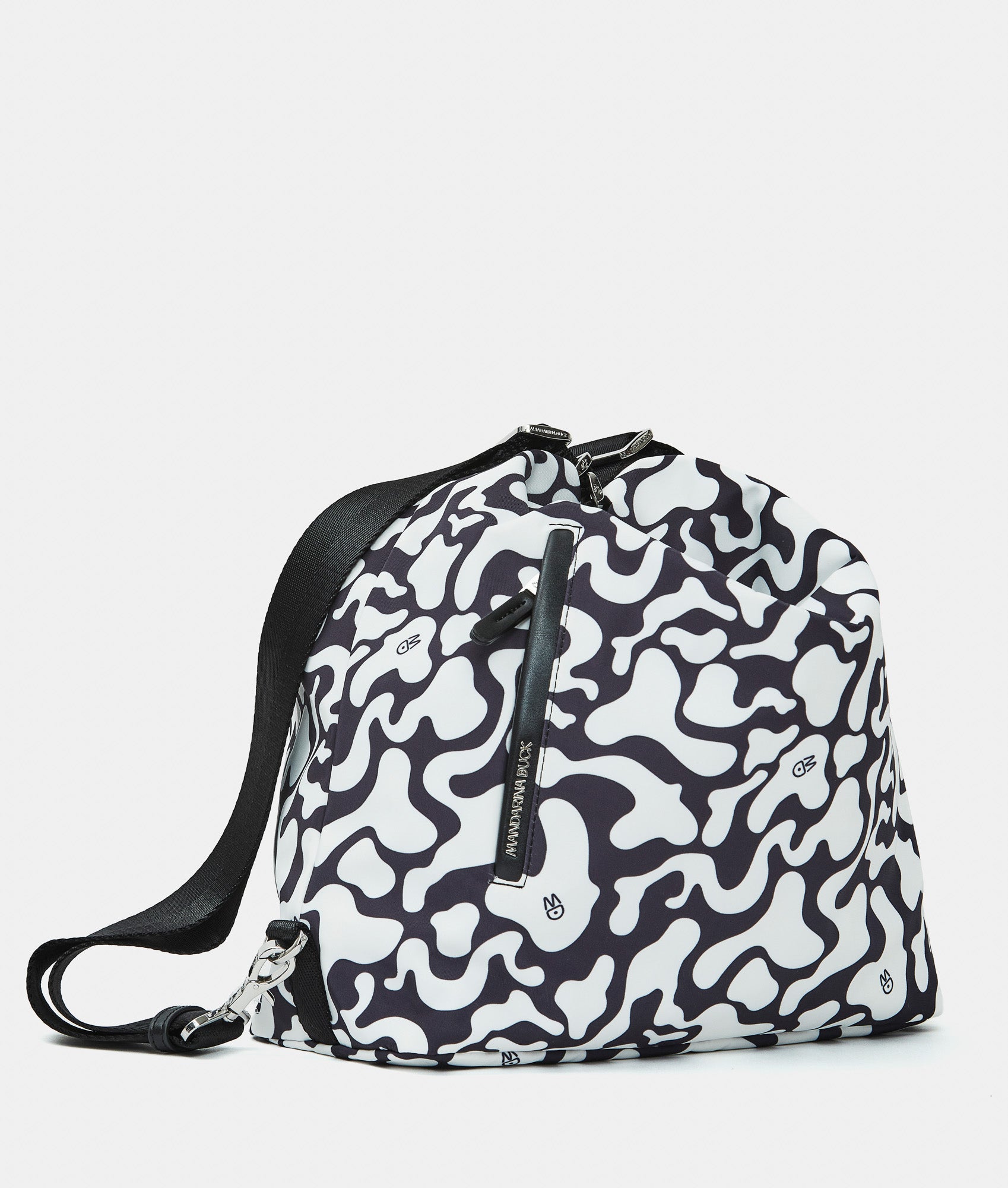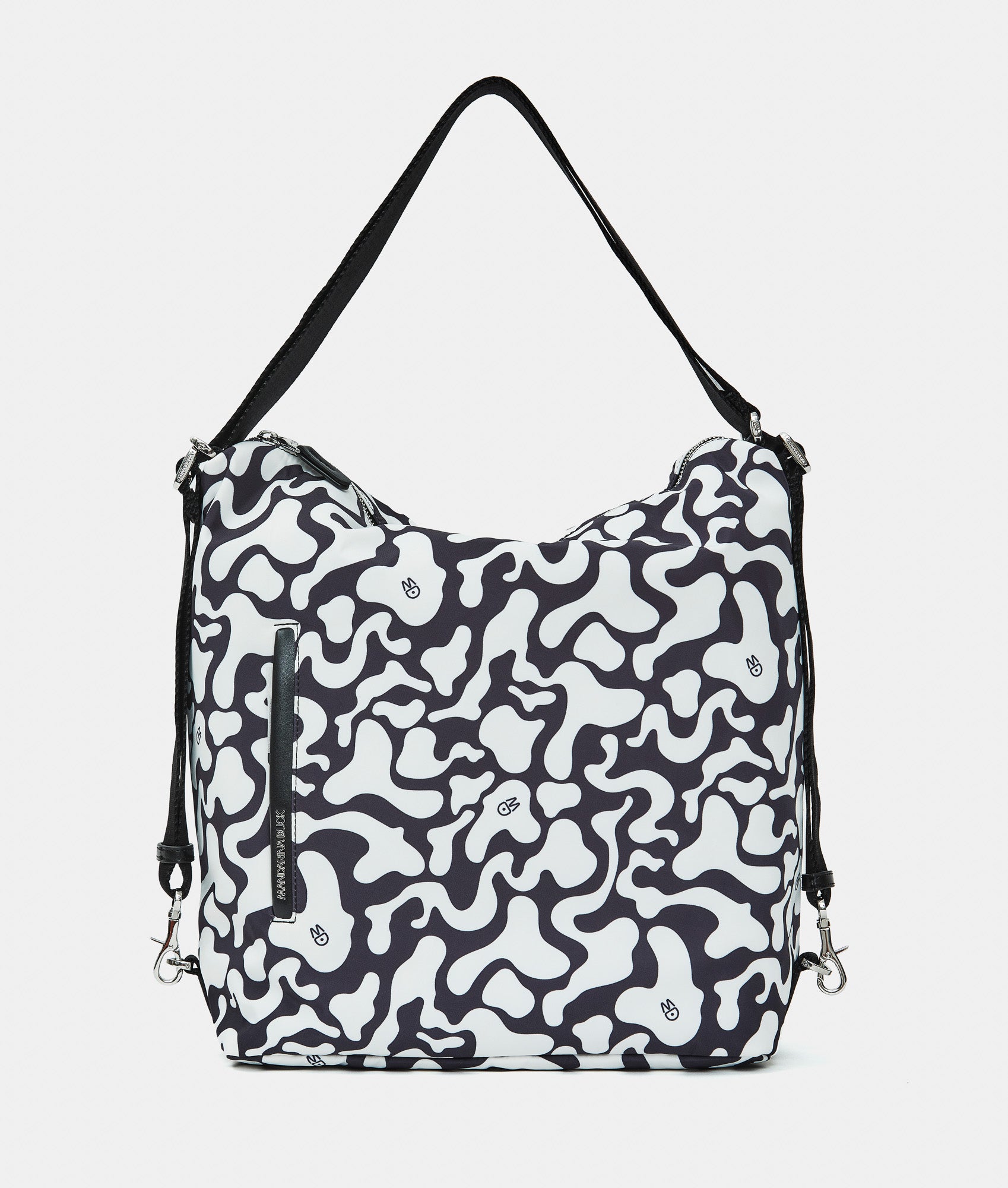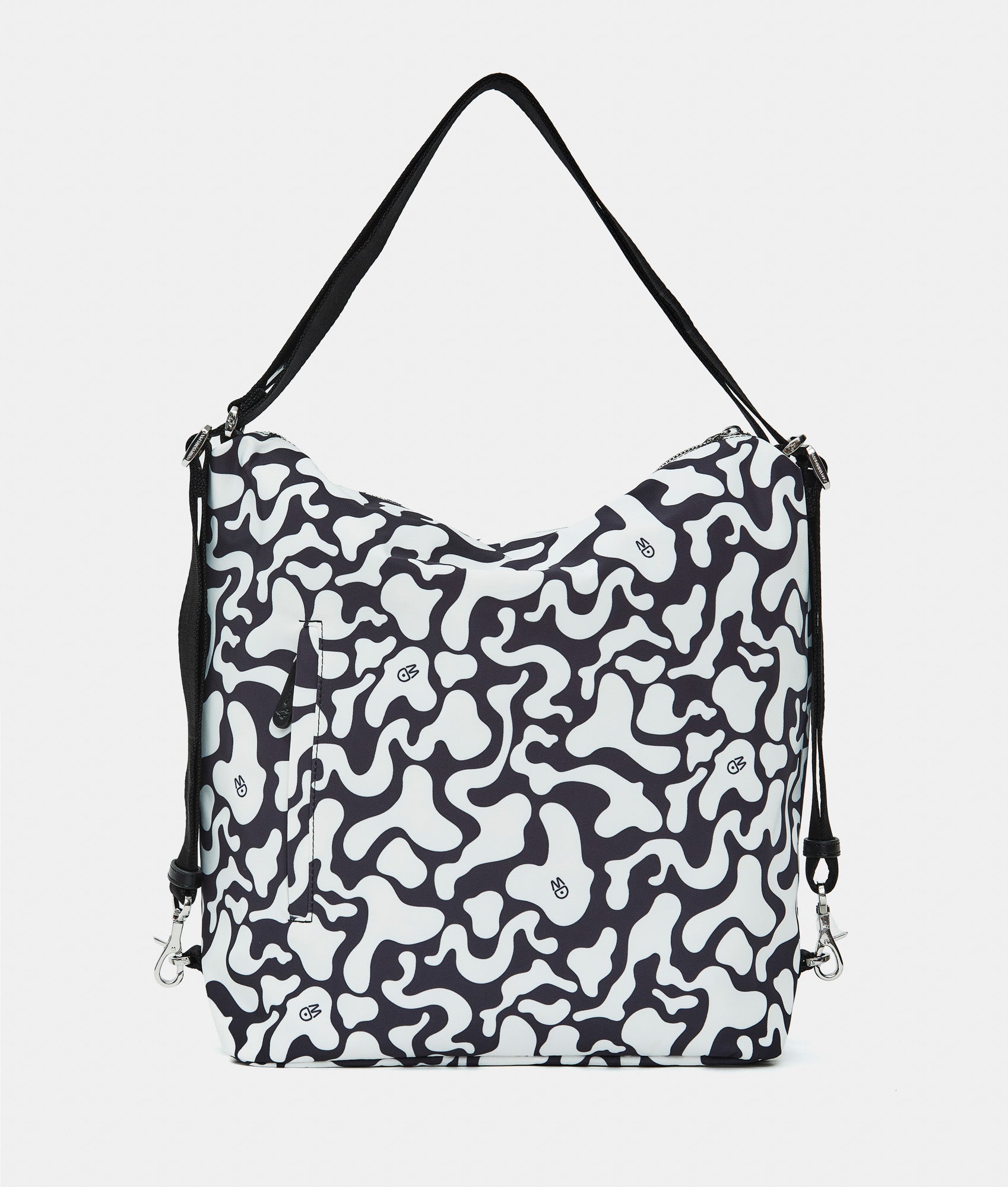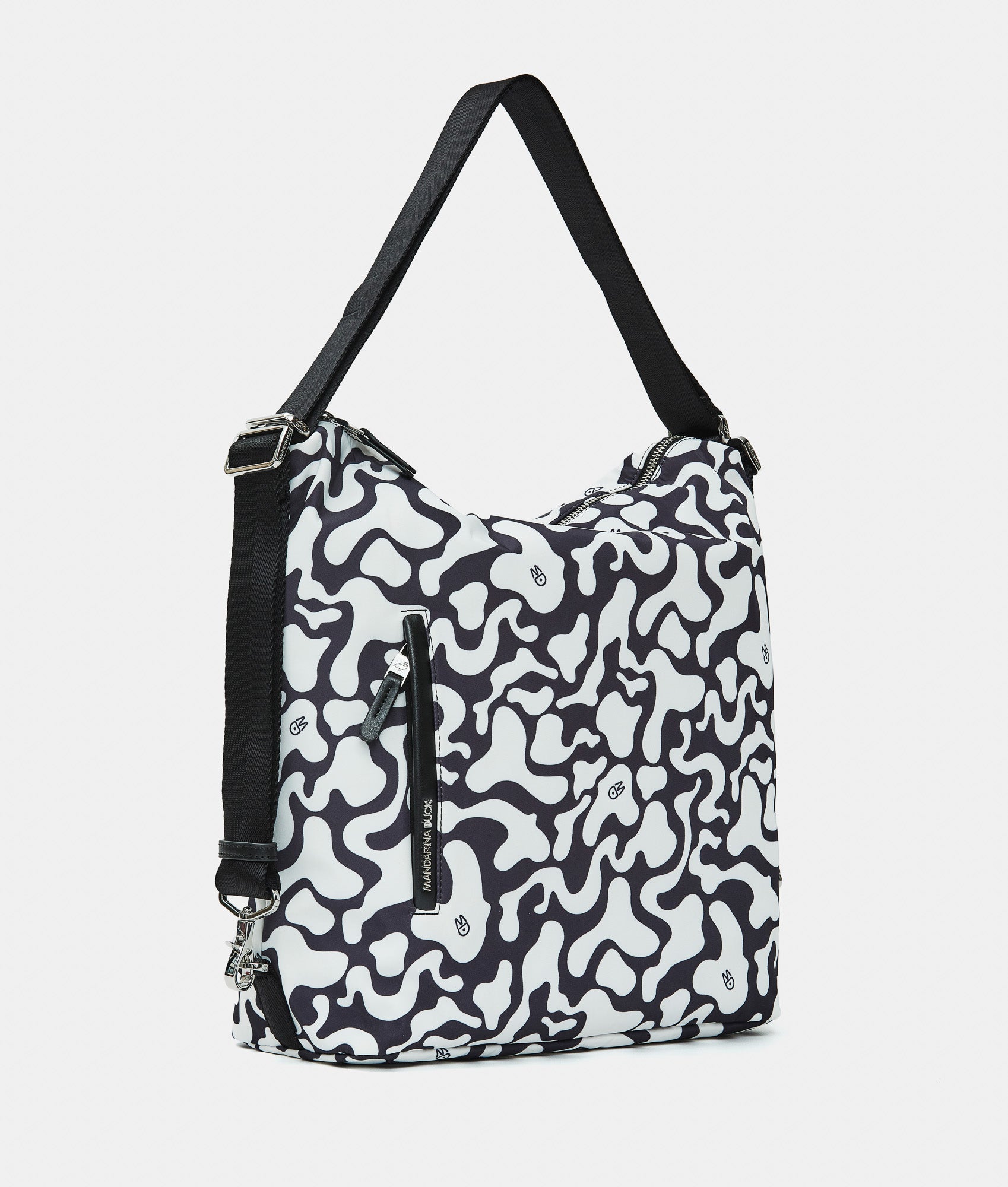 Multi-function bag with fabric zipper flat front pocket. Carrying options: shoulder, backpack, and hand. Smart internal pockets, custom details and adjustable jacquard strap.