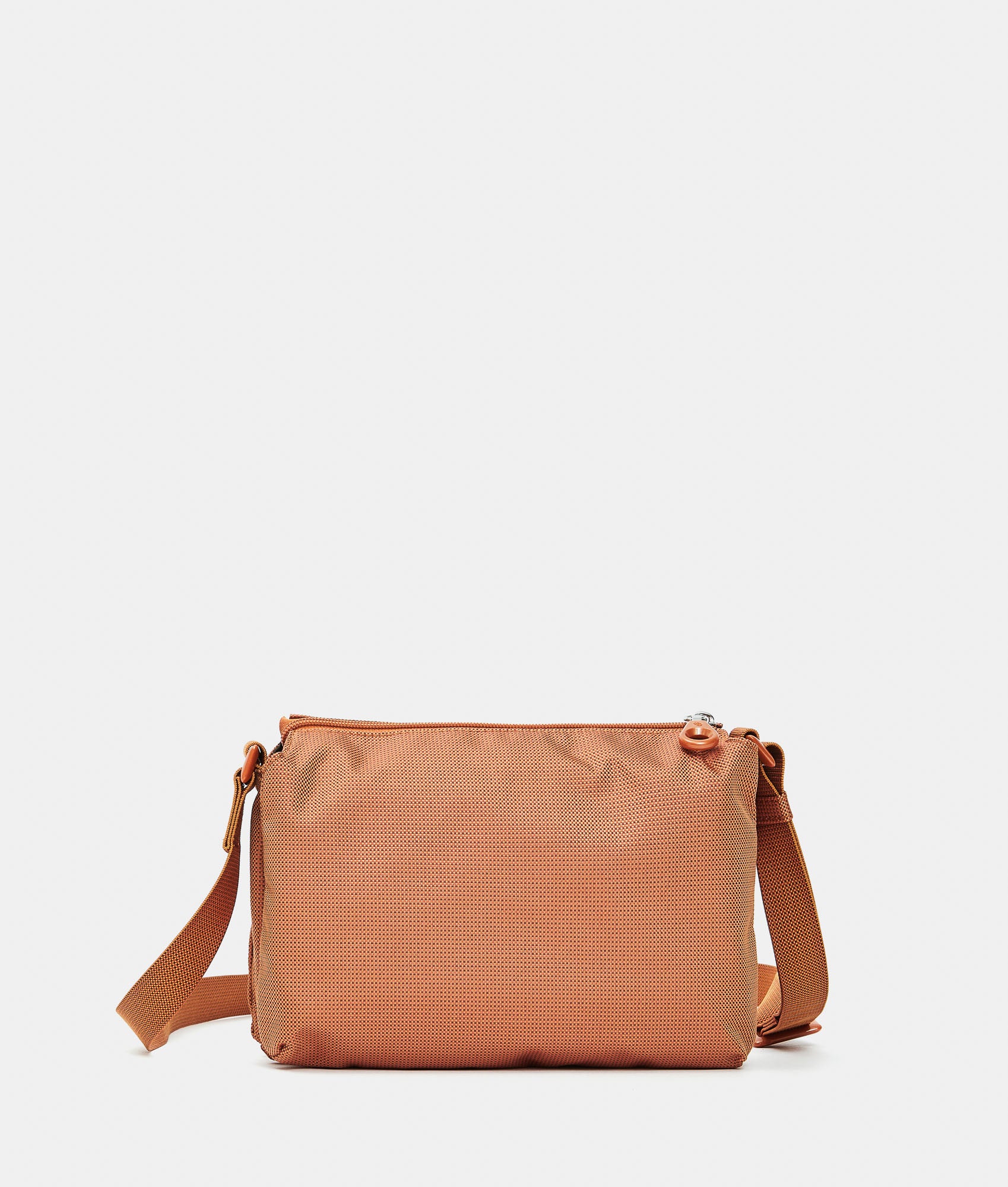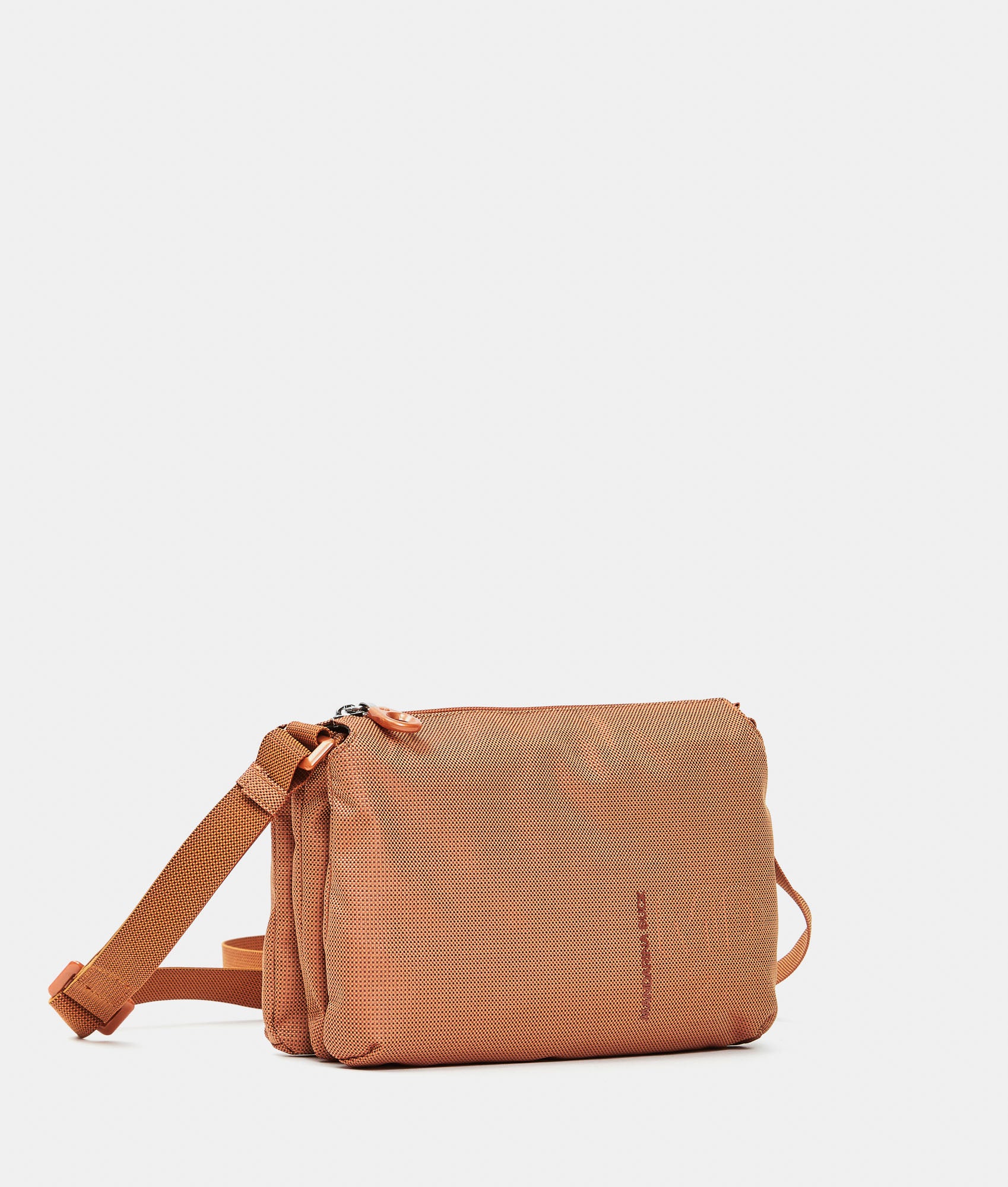 Crossbody bag with triple internal compartments in fabric. Double portability, personalized detaills and adjustable jacquard shoulder strap.