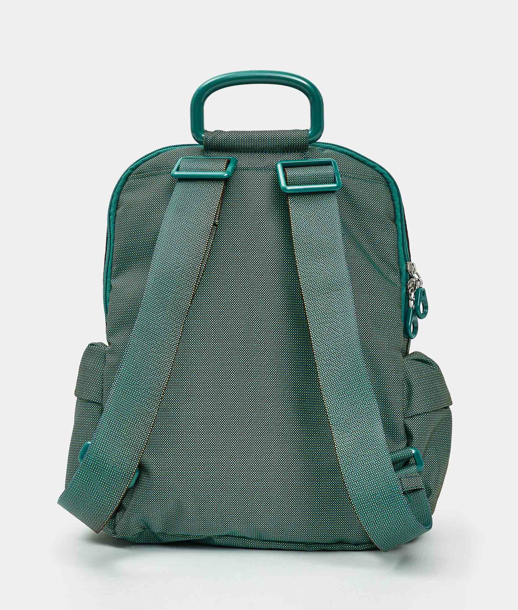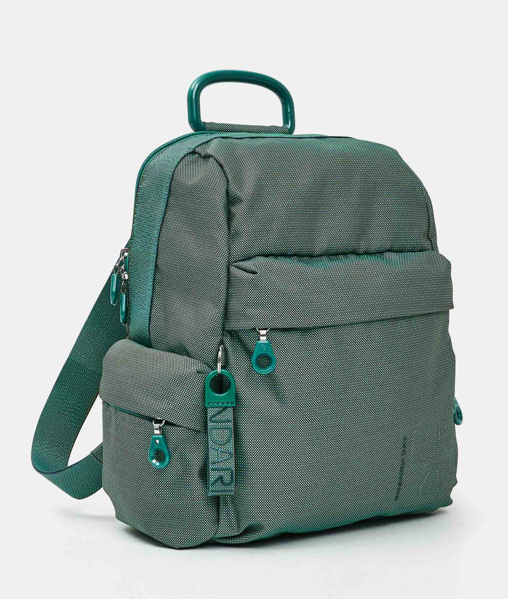 Large backpack with handle, large front pocket, and side zip pockets in fabric. Personalized details and adjustable jacquard straps.