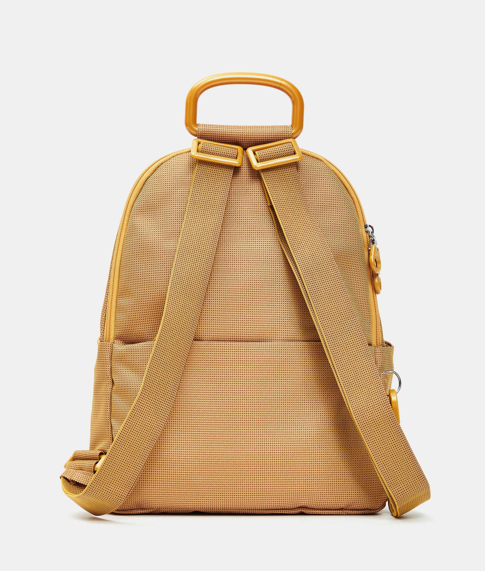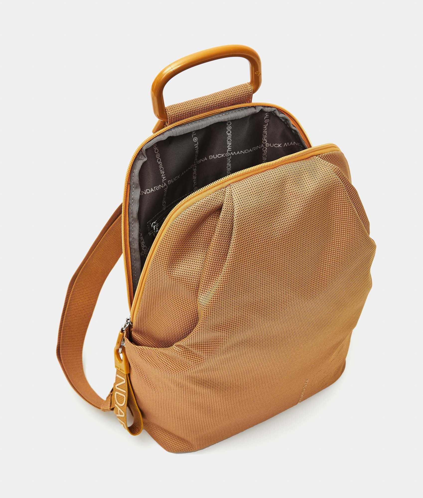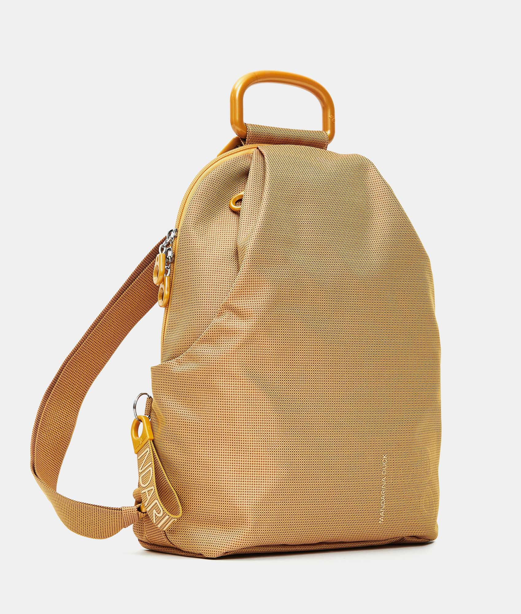 Backpack with handle and side zip pockets in fabric. Personalized details and adjustable jacquard straps.