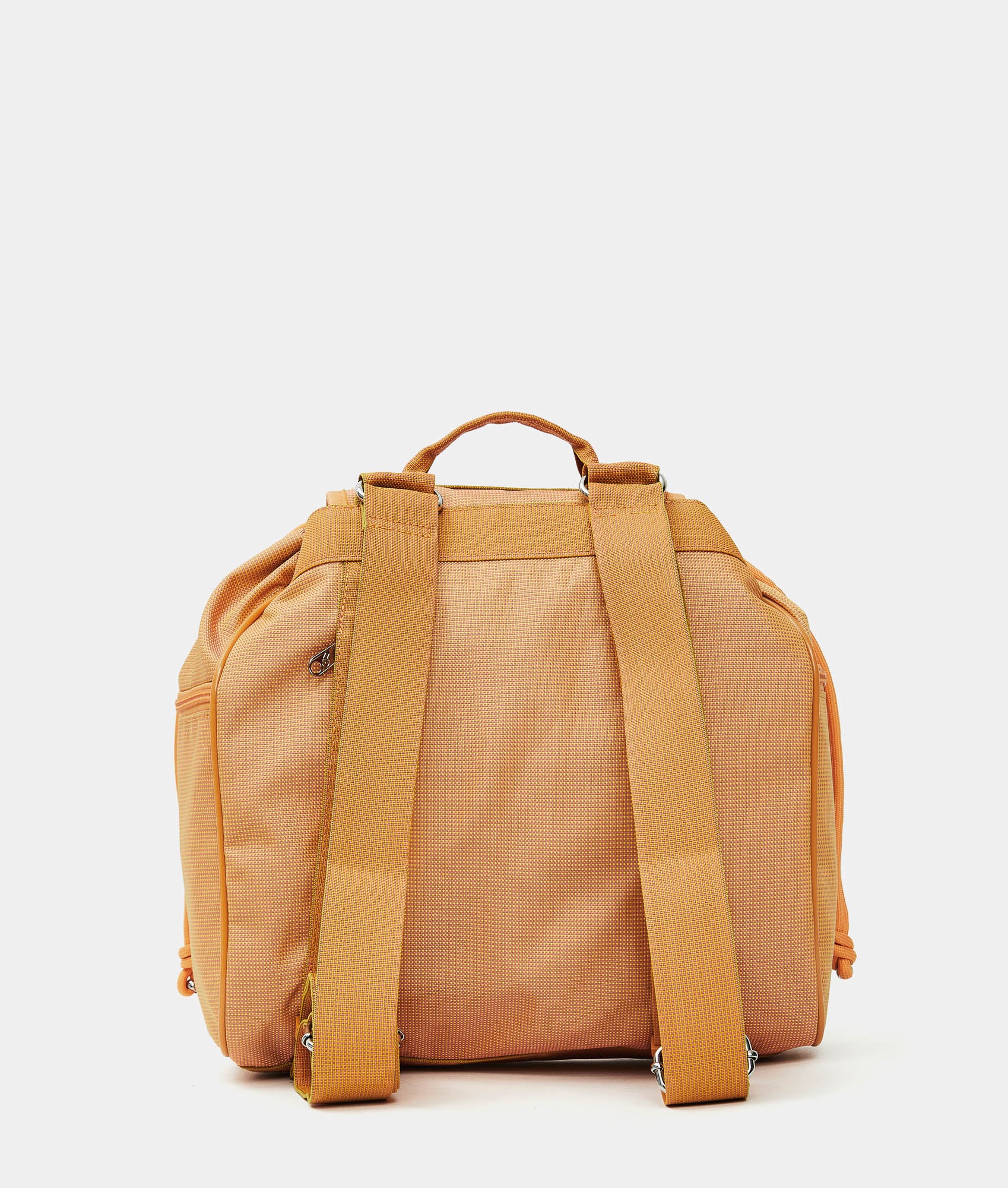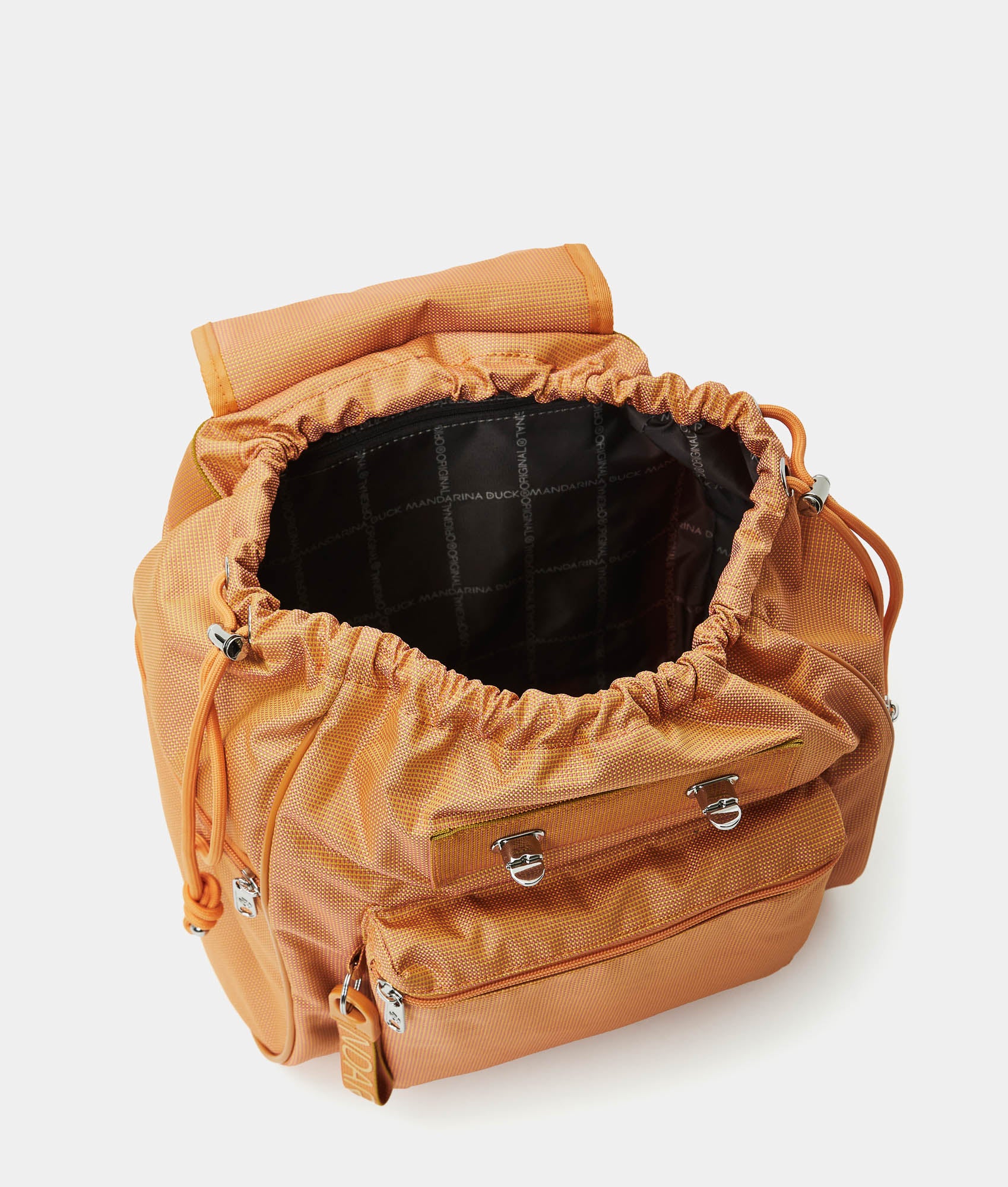 Foldable Utility backpack made from fabric. Lightweight, durable and practical, featuring multiple pockets and a secure closure with flap, snap buttons and drawstring. Tone-on-tone details. A contemporary classic by Mandarina Duck.