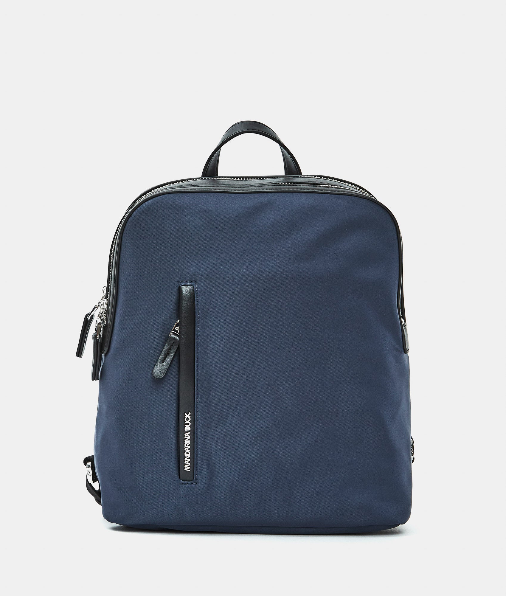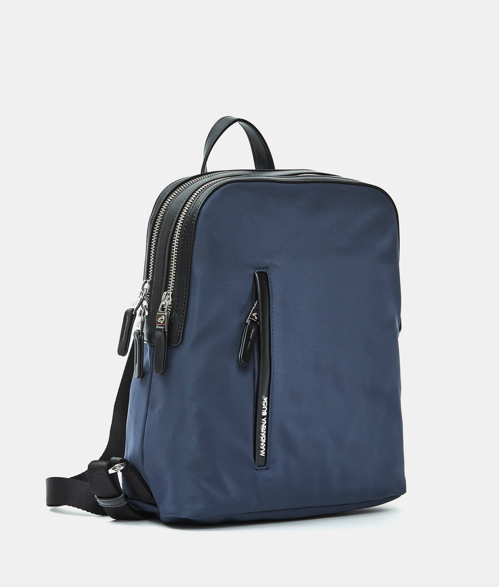 Small backpack with double compartment, flat front pocket, back pocket, and fabric zippers. Custom details and adjustable jacquard shoulder straps.