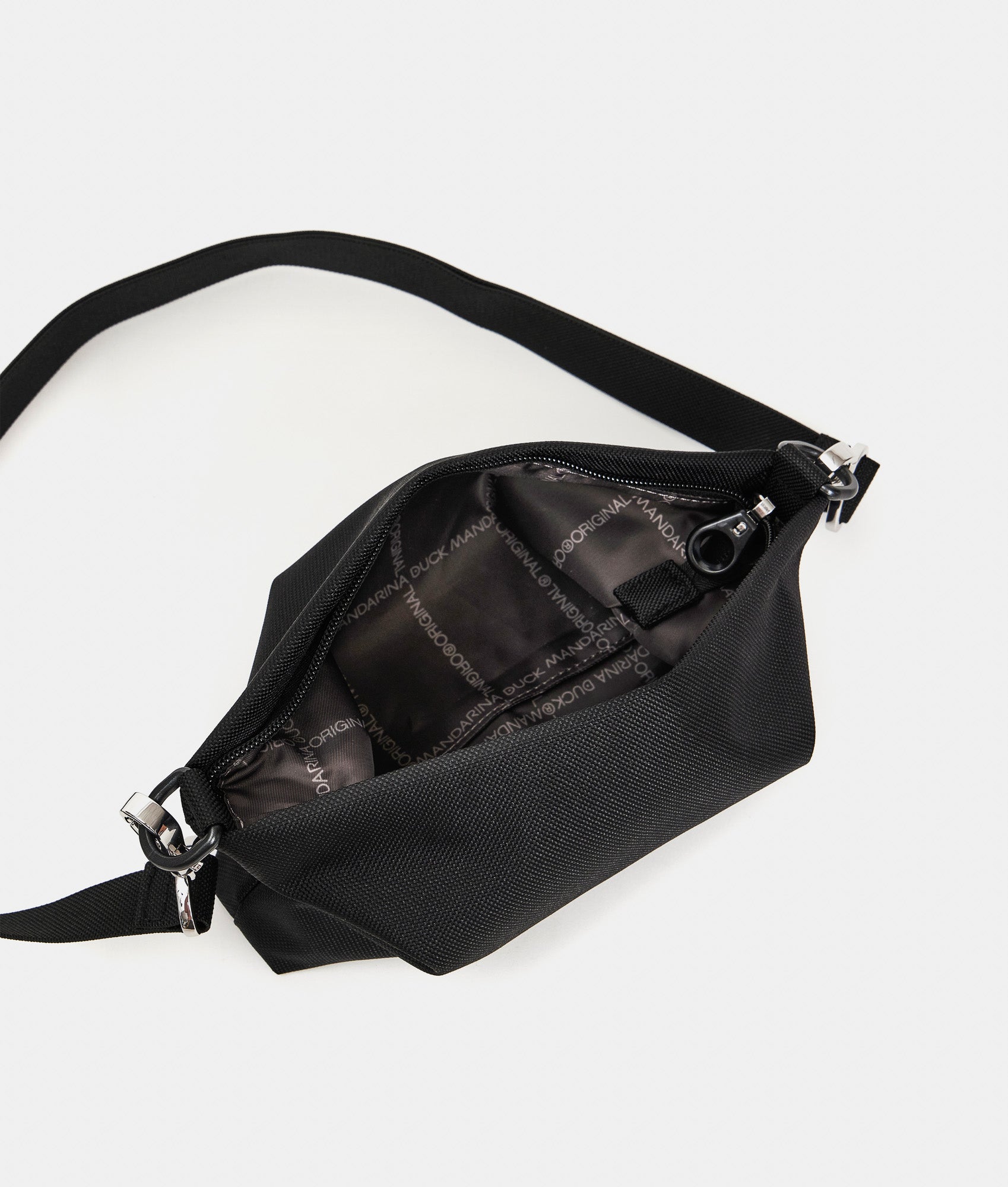 Small fabric crossbody bag. Double portability, personalized details, removable and adjustable jacquard shoulder strap.