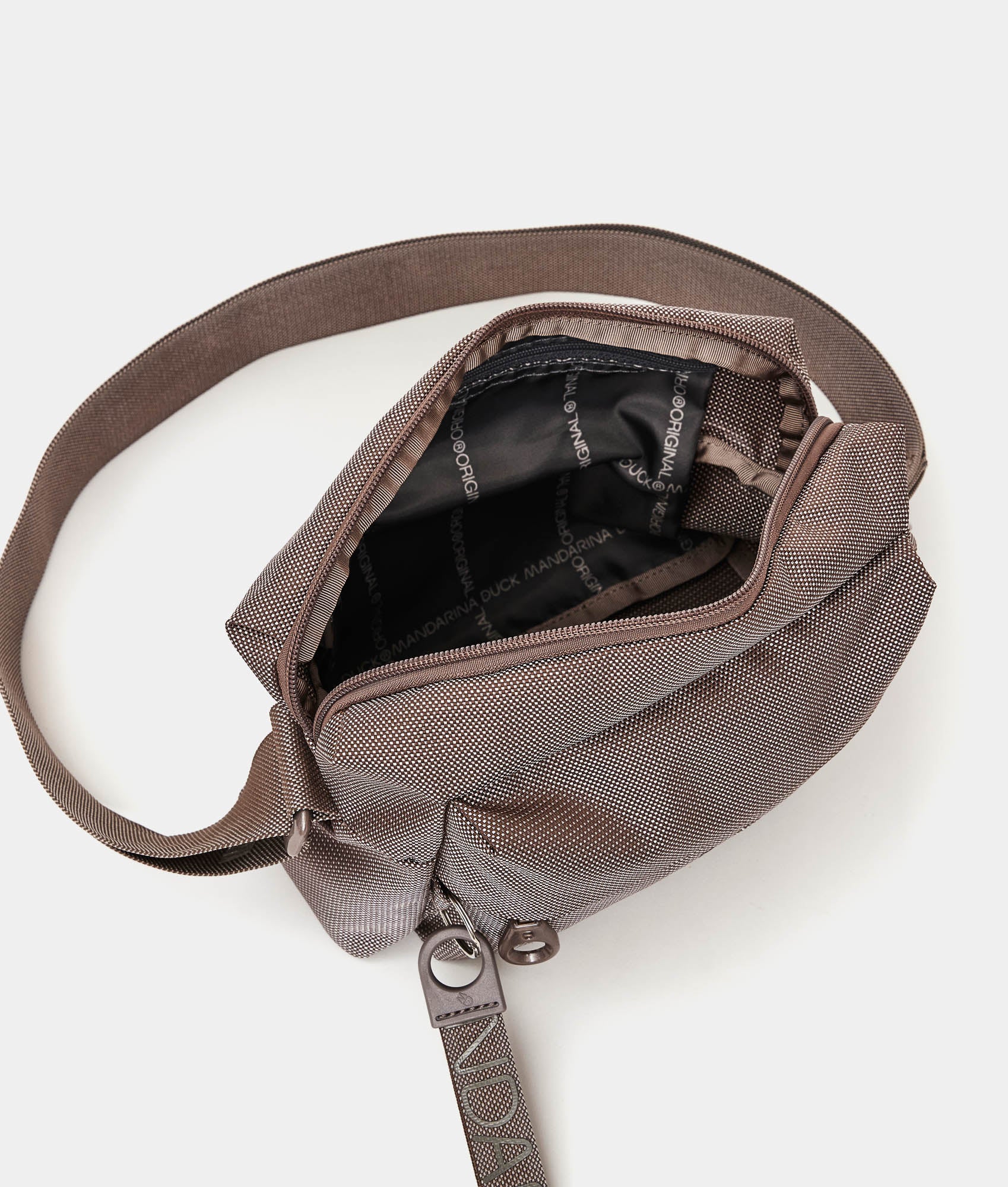 Dual portability, smart front and internal pockets, personalized detaills and adjustable jacquard shoulder strap.