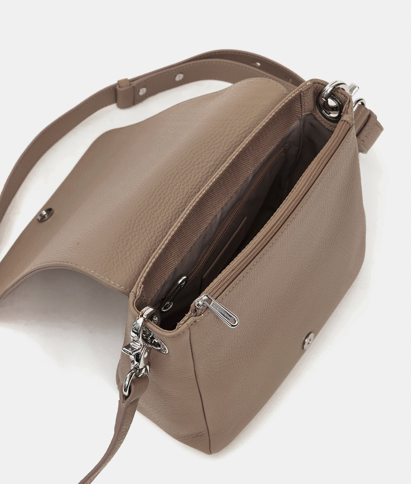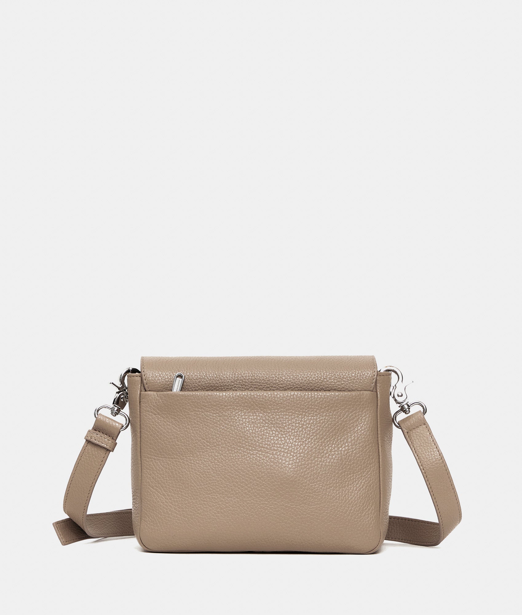Small leather crossbody bag with a front flap. Dual carrying options, smart pockets, custom metal details, and an adjustable and removable jacquard strap.