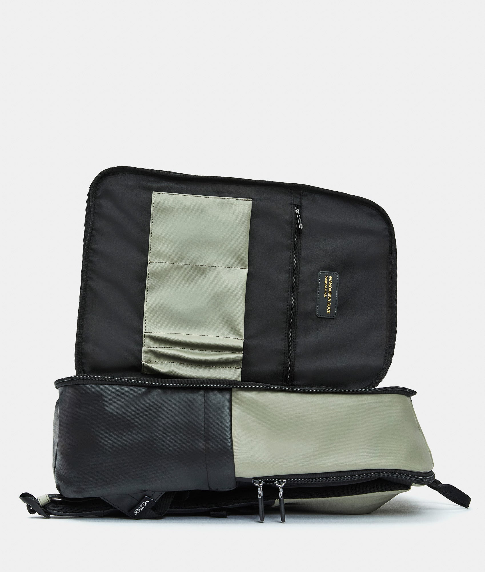 ECO COATED is Mandarina Duck's casual cross-category and cross-gender collection, featuring a youthful and energetic look. It is made from 100% recycled polyester fabric derived from the recovery and transformation of plastic bottles (PET). For those seeking spacious, functional accessories with multiple pockets and meticulous attention to detail, this line is crafted from a durable, water-resistant coated fabric. The collection is part of the ECODUCK TM project, through which Mandarina Duck commits to ensuring more conscious and sustainable production with recycled materials. The main external fabric is made with the equivalent of 19 recycled PET bottles (0.5l - 20g).