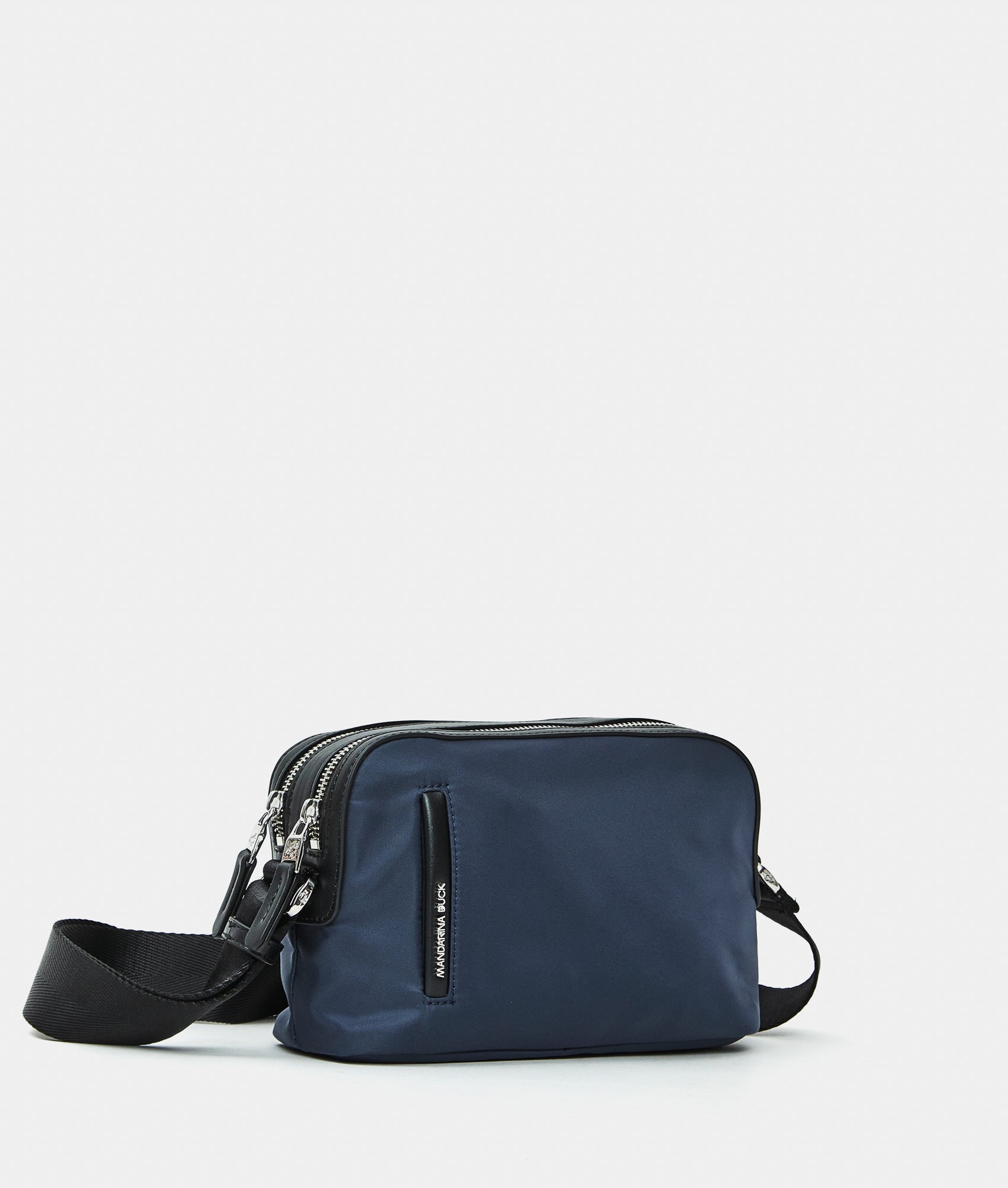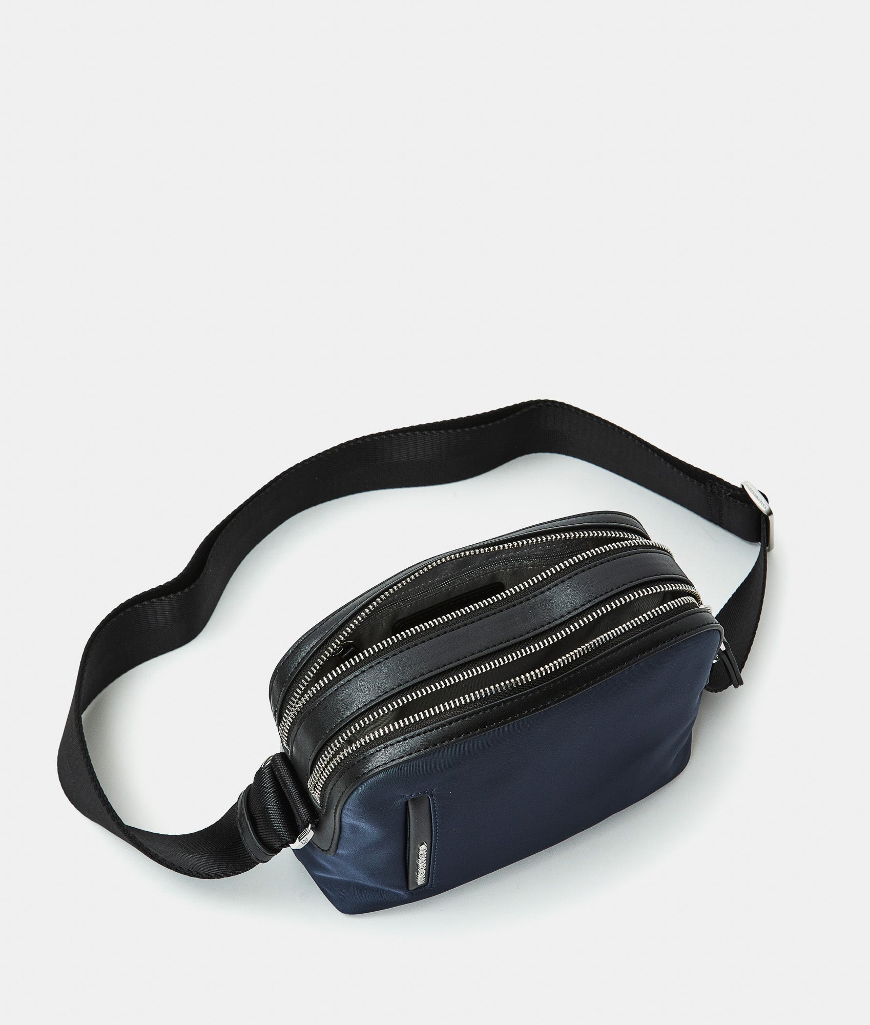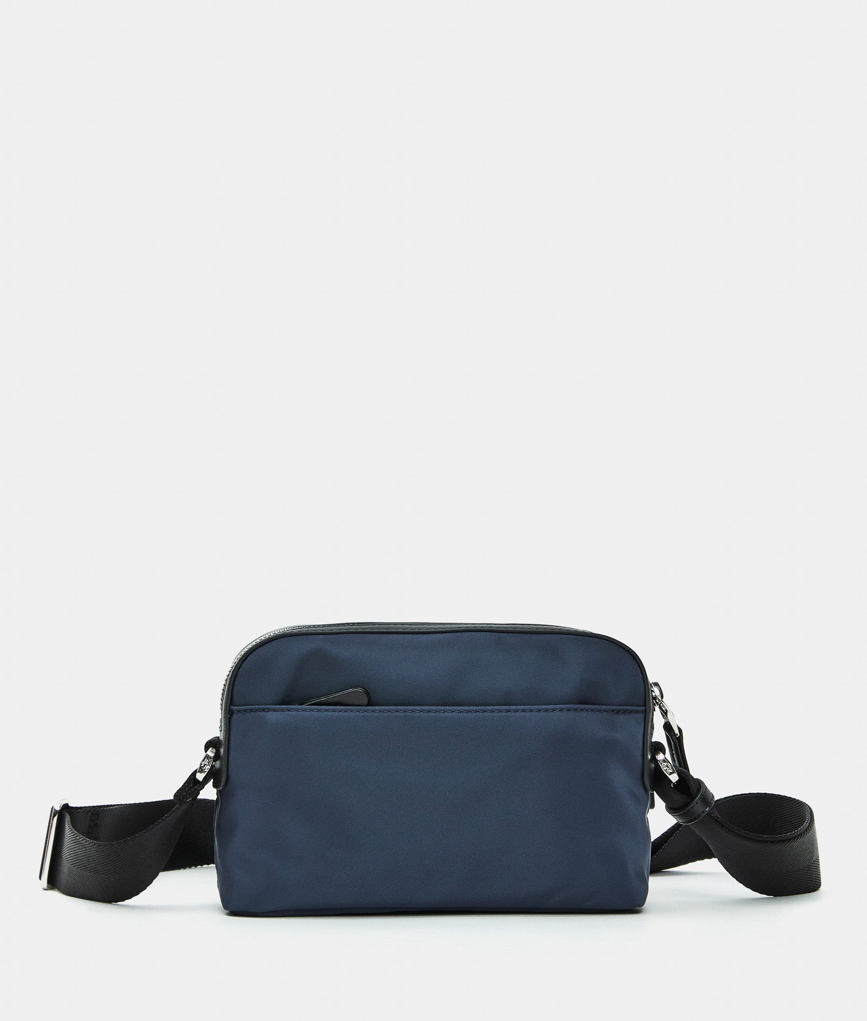 Small crossbody bag with double compartment and fabric zippers. Dual carrying options, smart front, back, and internal pockets, custom details and adjustable jacquard strap.