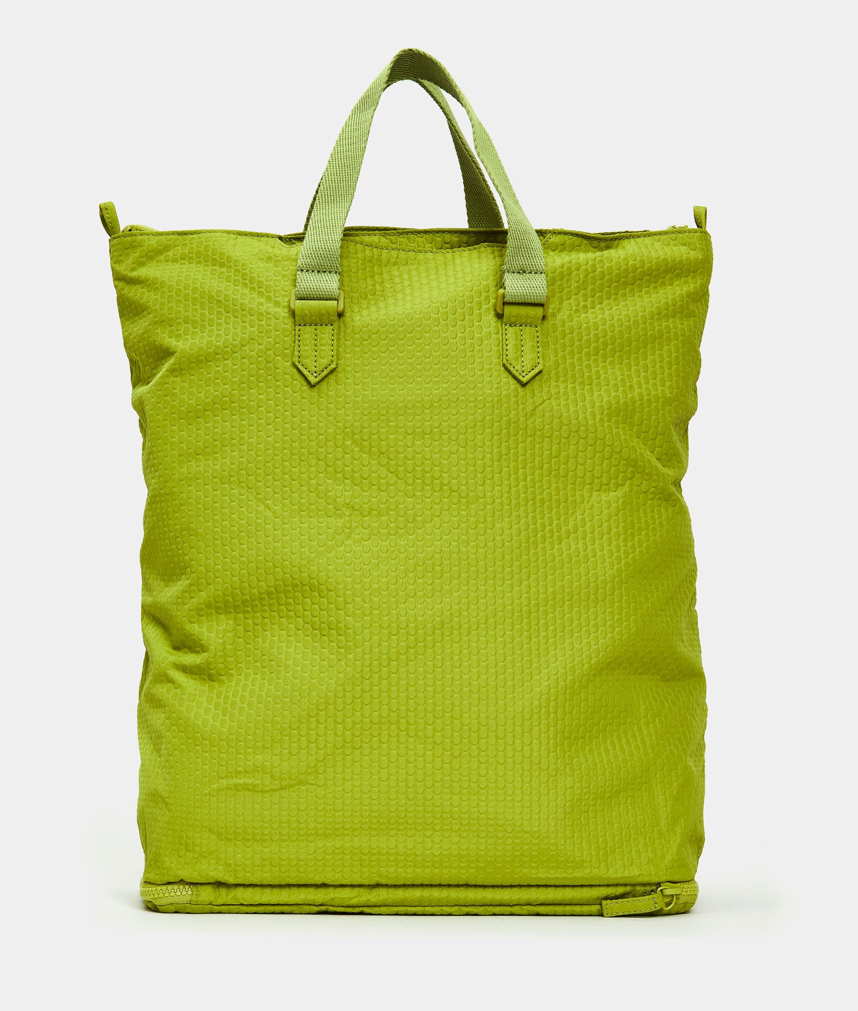 The material features a texture reminiscent of bubble wrap, with vibrant colors and a contrasting recycled lining. Each model is foldable and can be stored in a transparent pearl-colored pocket, which is an integral part of the product itself. This pocket can also be used to store small items, enhancing the bag's practicality.