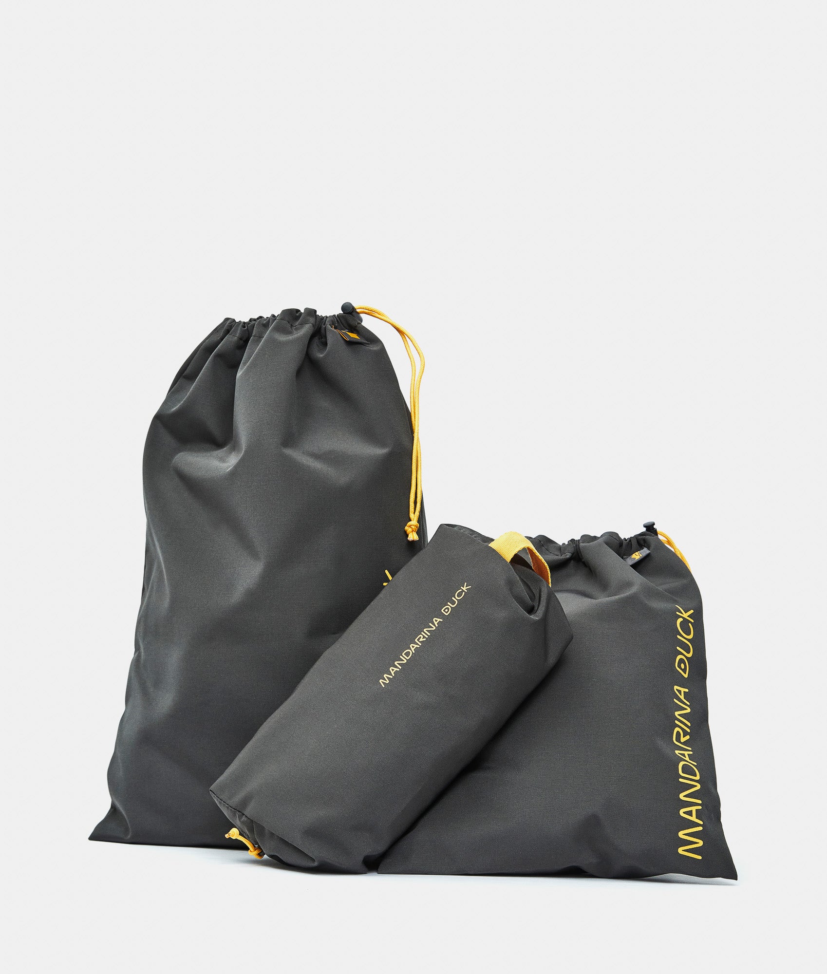 - 2 drawstring garment pouches and 1 zippered toiletry kit