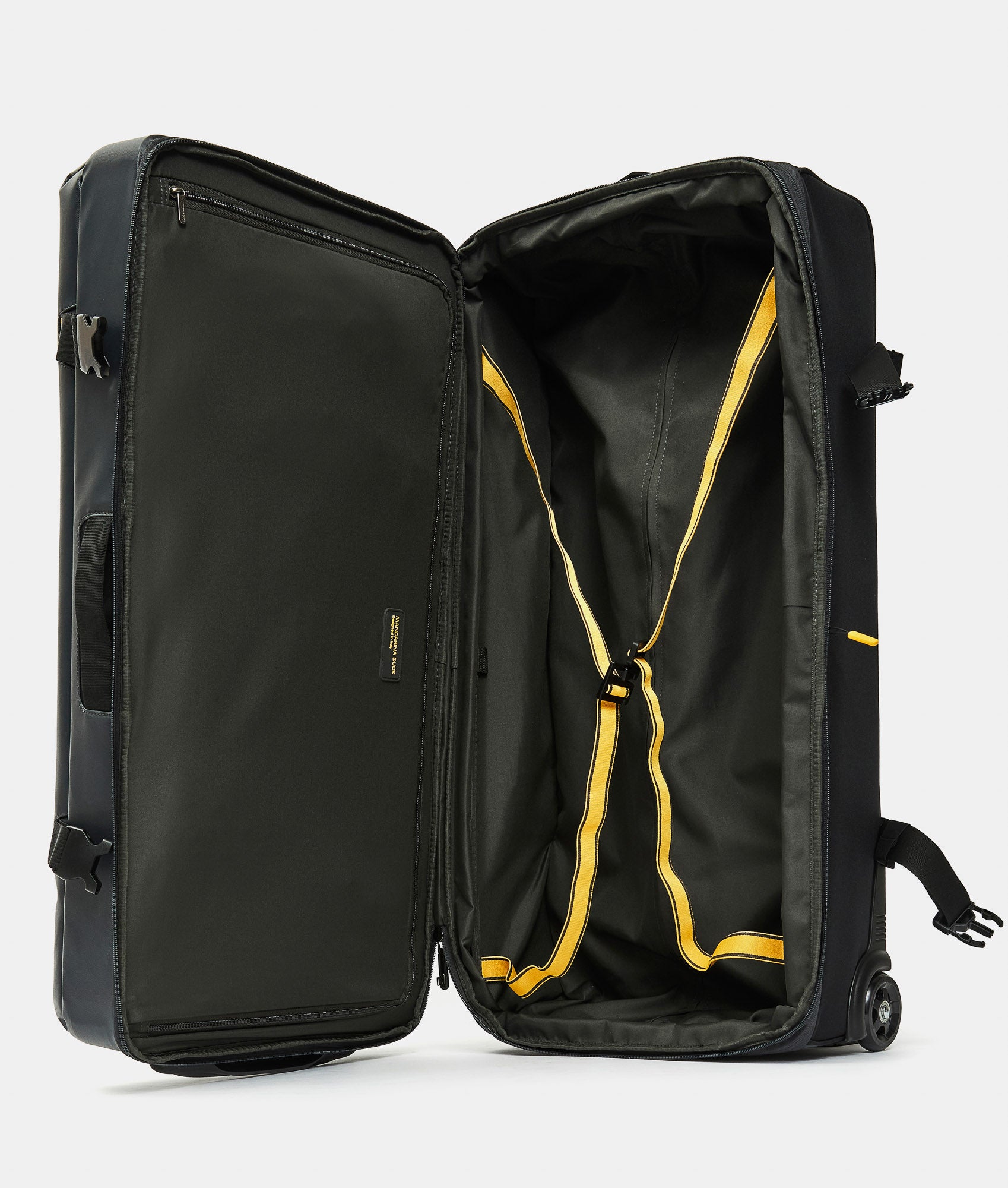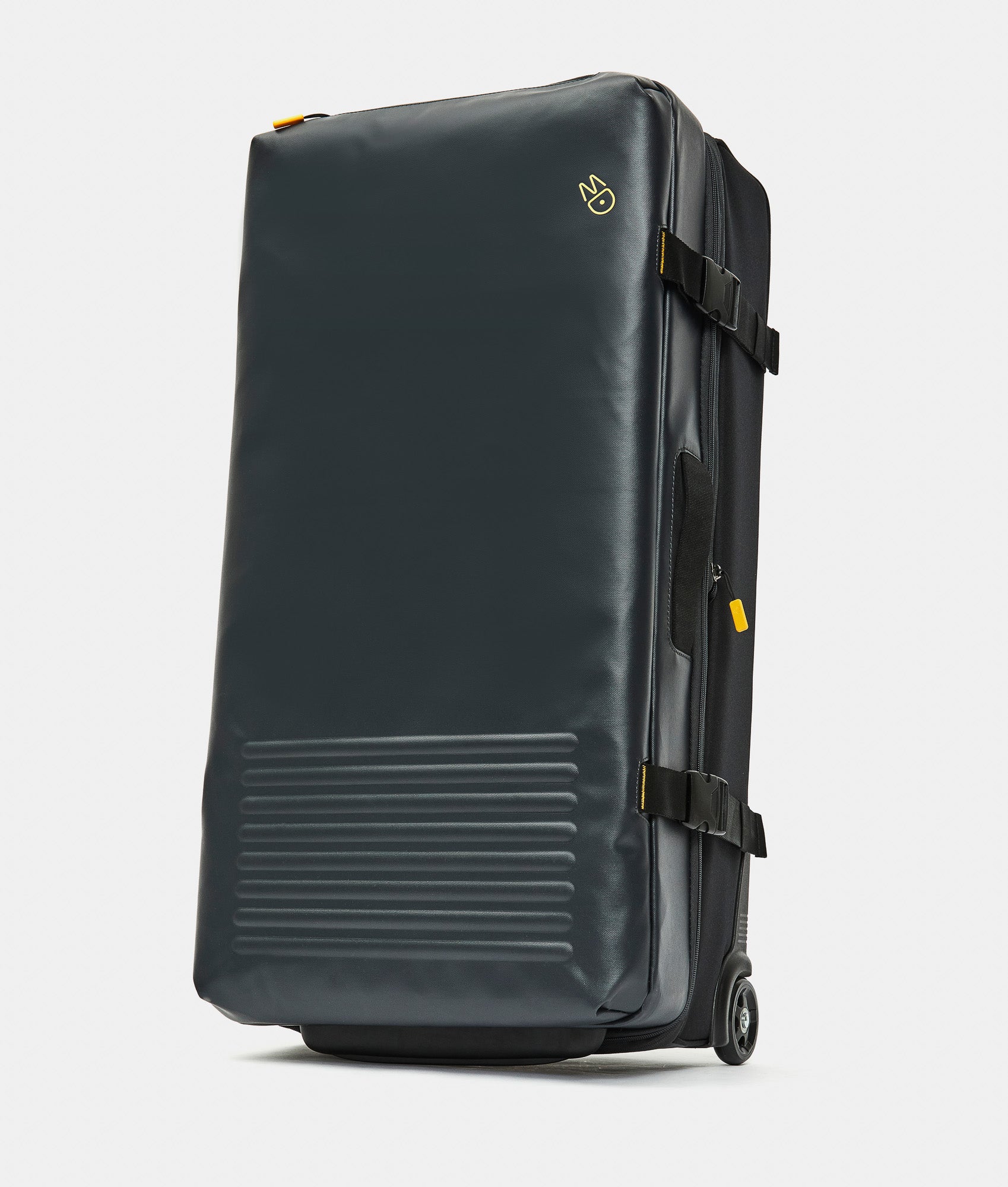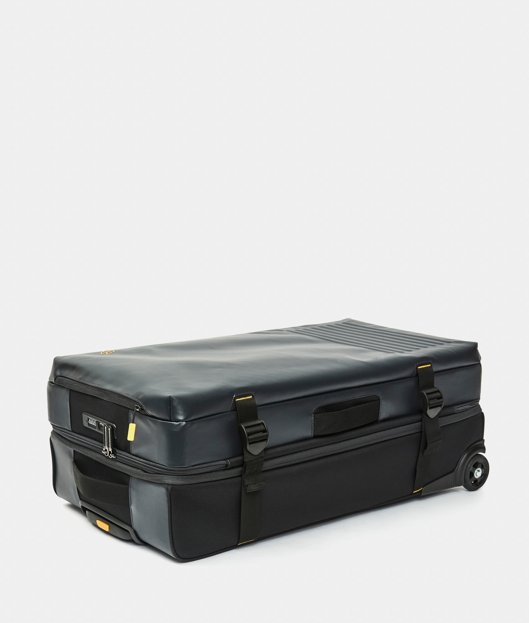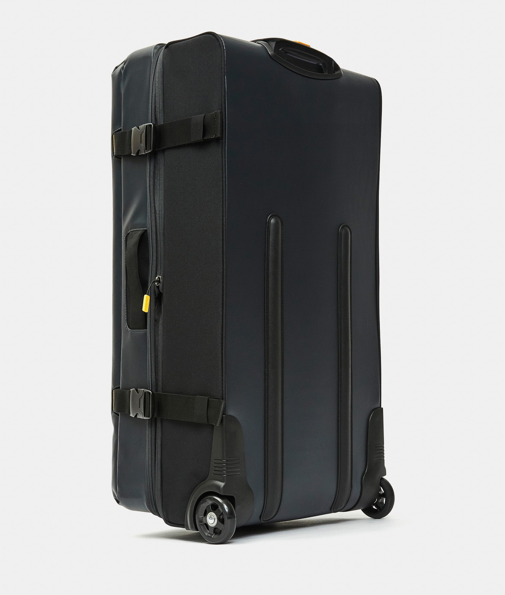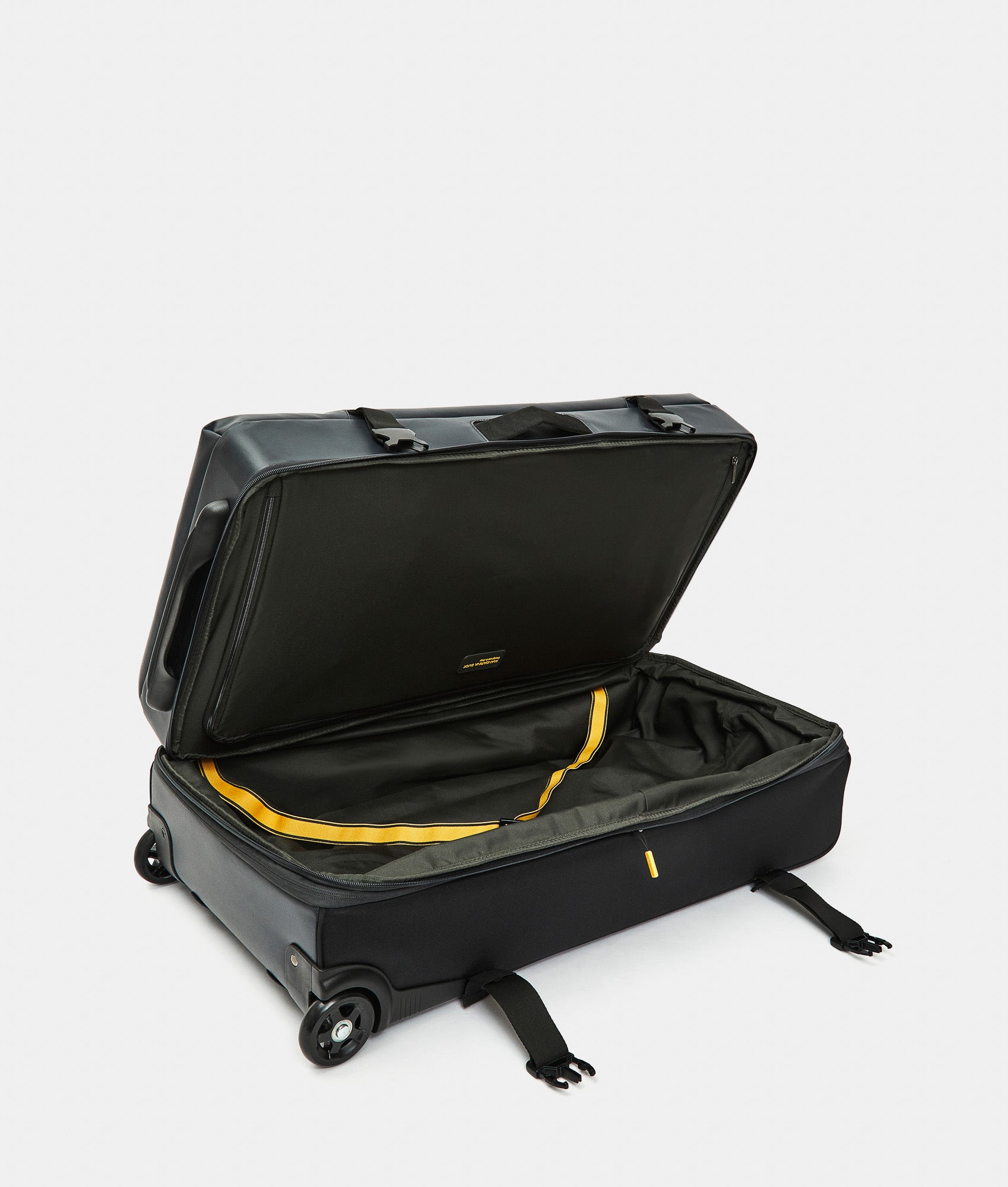 Expandable Soft Duffel with wheels (2 wheels) 38x78x28.5/33.5 cm, large size. Made of recycled polyester. Opening with adjustable buckles and zipper. Multi-step retractable trolley handle, integrated TSA lock, and customized details.