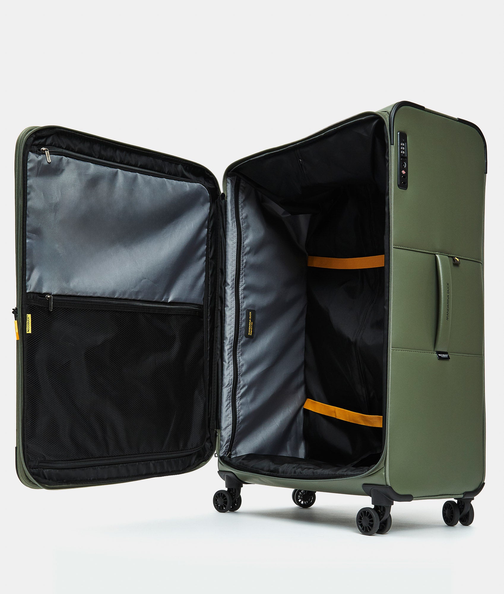ECO COATED is Mandarina Duck's casual cross-category and cross-gender collection, characterized by a youthful and bold look. It is made from 100% recycled polyester fabric obtained from the recovery and transformation of plastic bottles (PET). For those looking for accessories that are spacious, functional, equipped with multiple pockets, and meticulously designed, the answer lies in this line made from robust, water-resistant coated fabric. The collection is part of the ECODUCK TM project, through which Mandarina Duck is committed to ensuring a more conscious and sustainable production using recycled materials. The main external fabric is made with the equivalent of 48 recycled PET bottles (0.5l - 20g).
