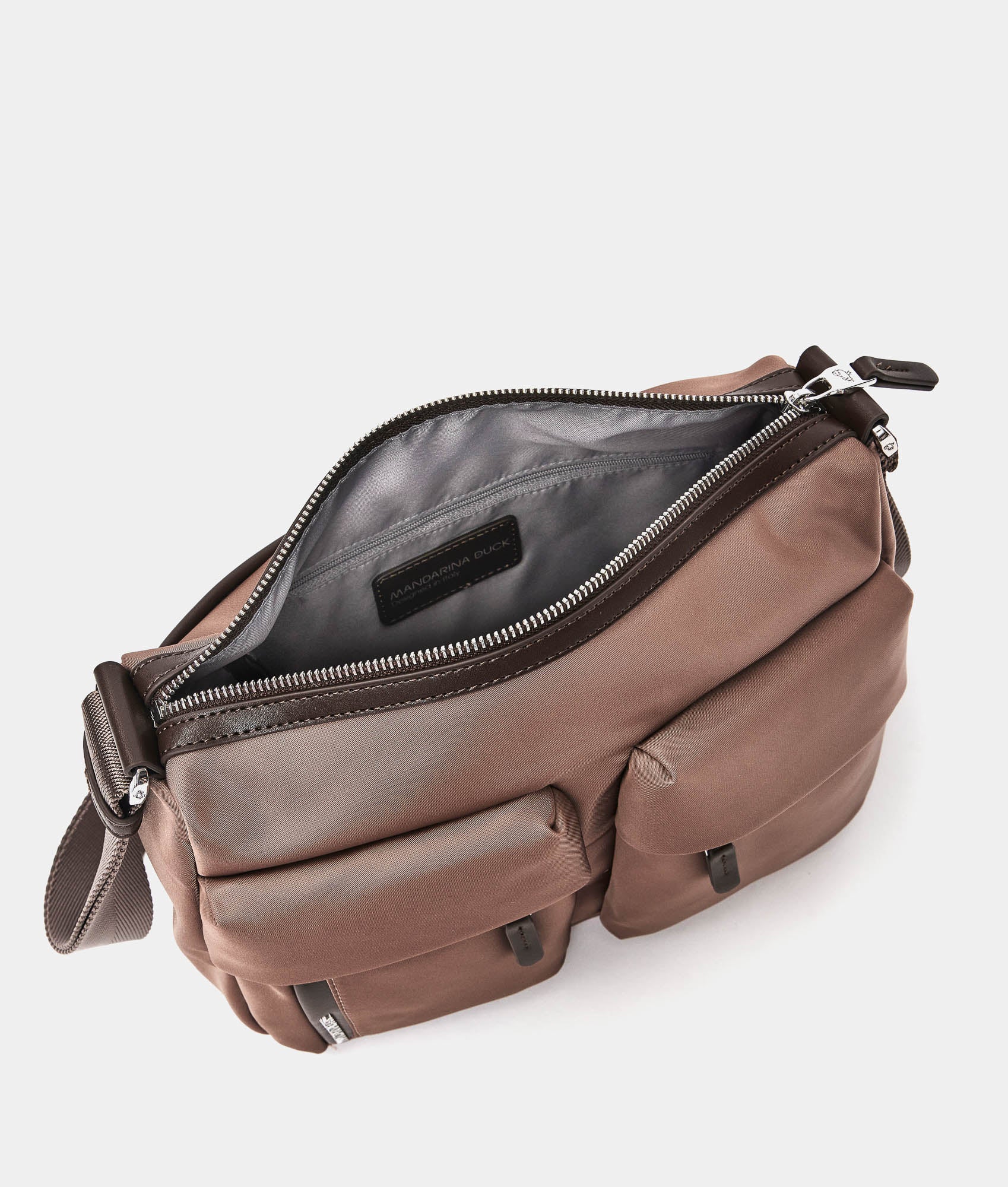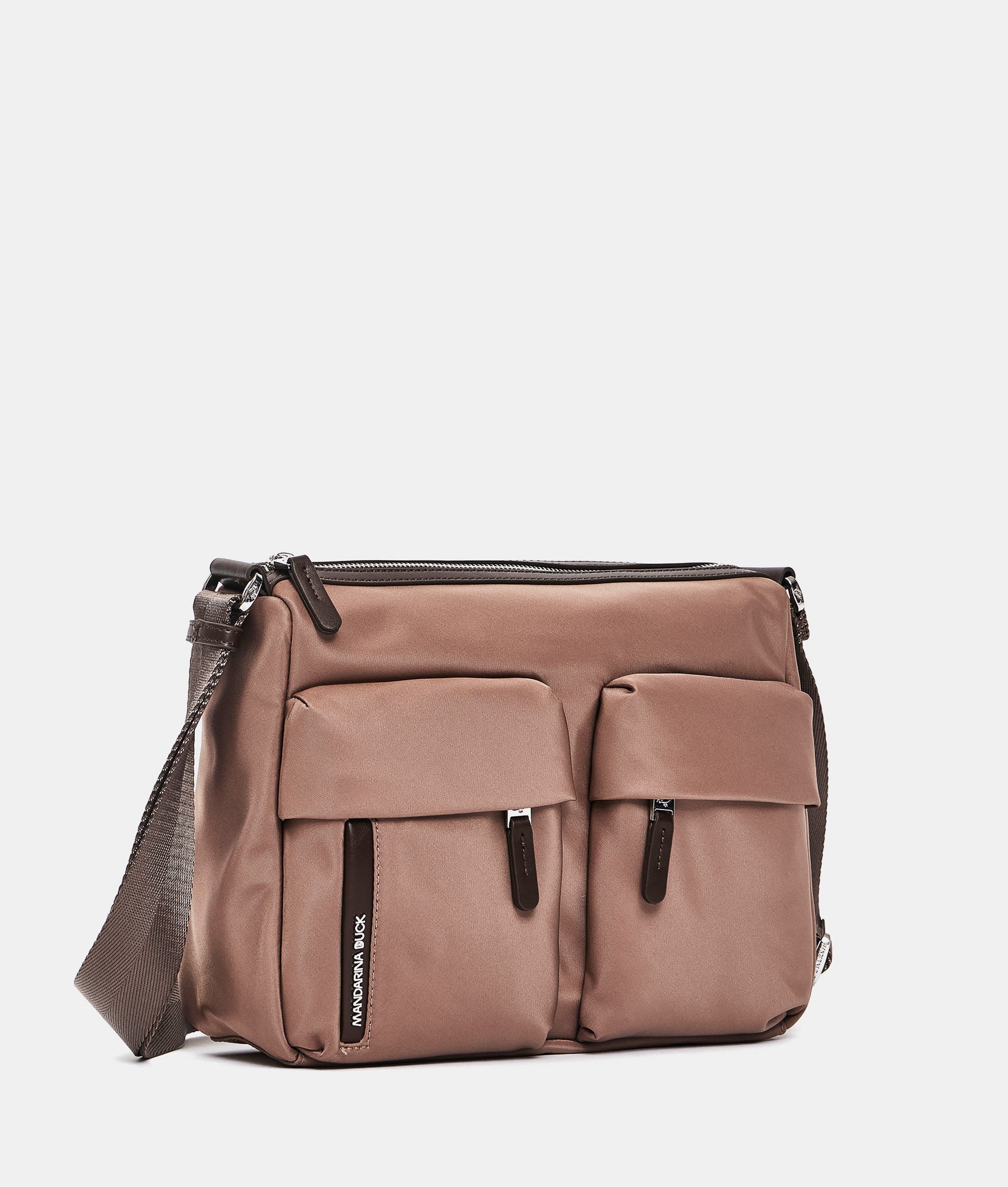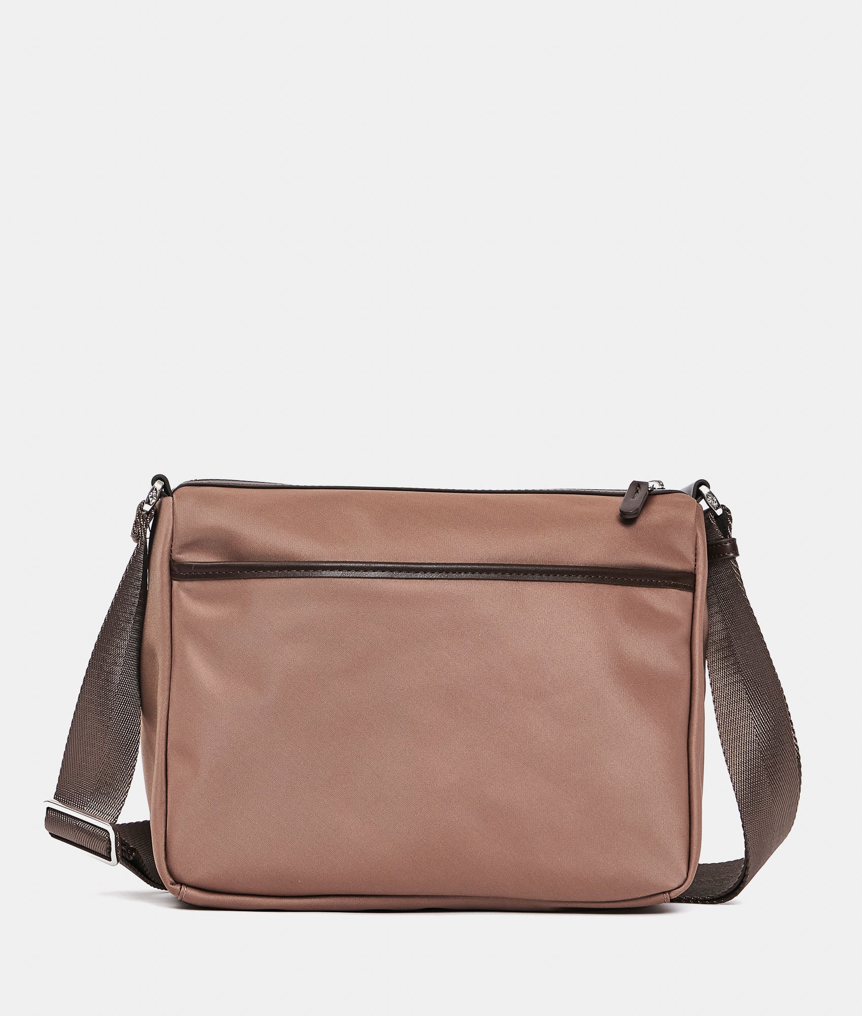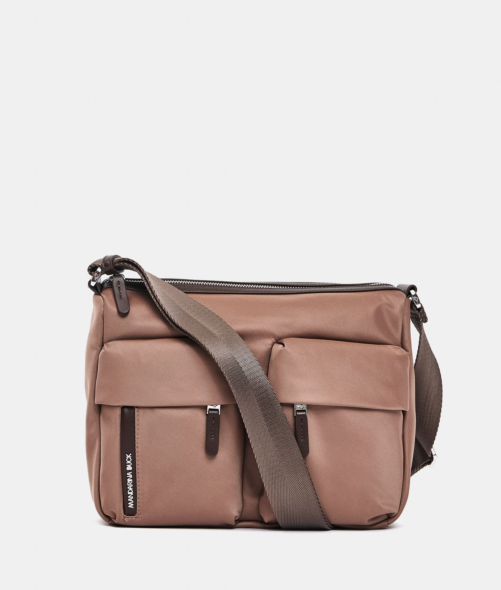 Crossbody bag with double front pockets and fabric zippers. Dual carrying options, smart front, back, and internal pockets, custom details and adjustable jacquard strap.
