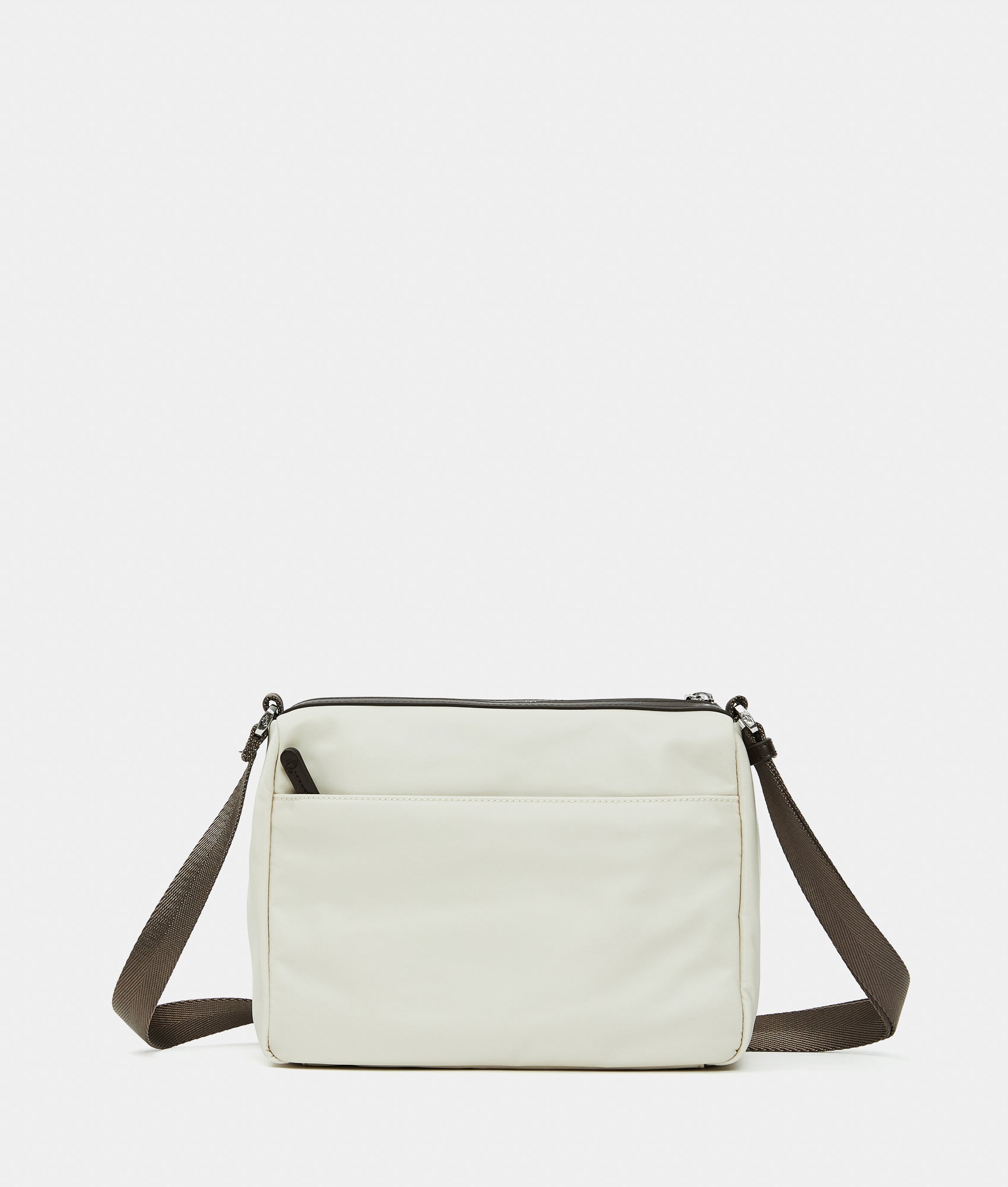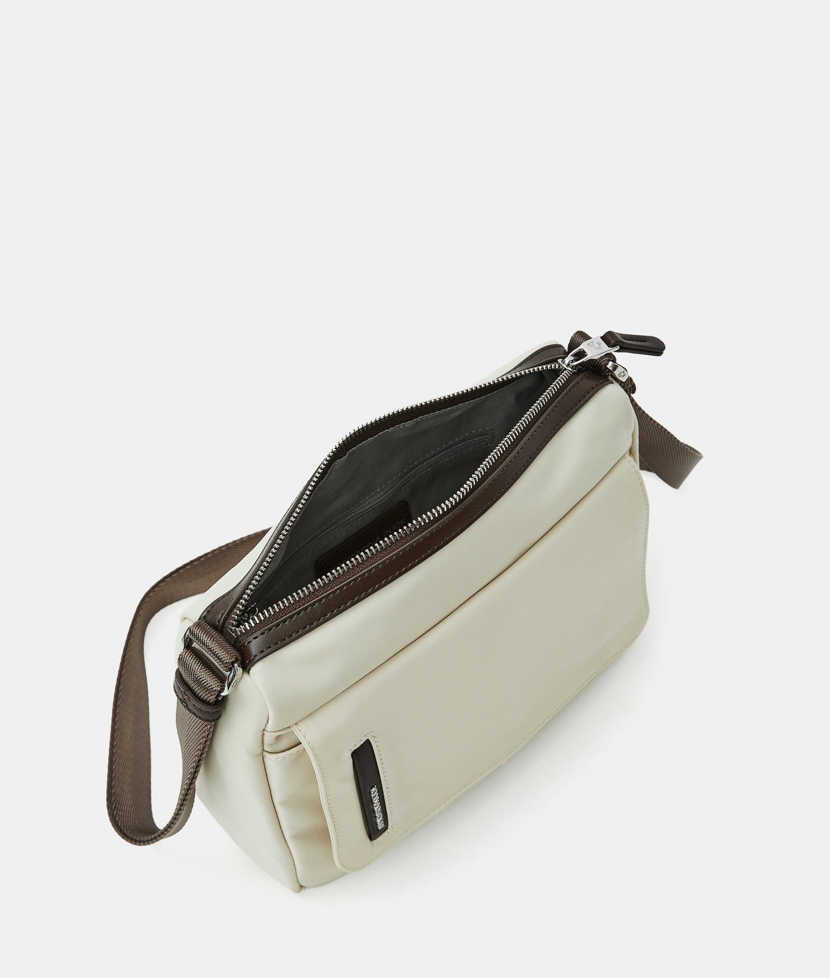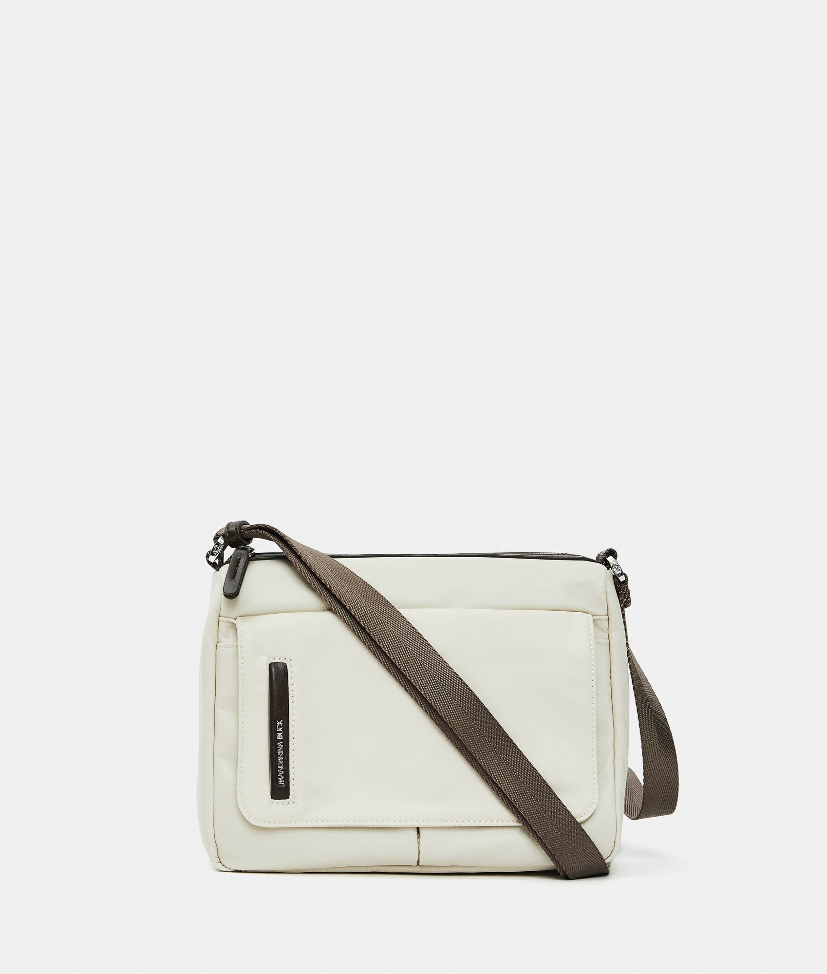 Crossbody bag with double front flap pockets and magnetic buttons, in fabric. Dual portability, smart front, rear, and internal pockets, personalized detaills and adjustable jacquard shoulder strap.