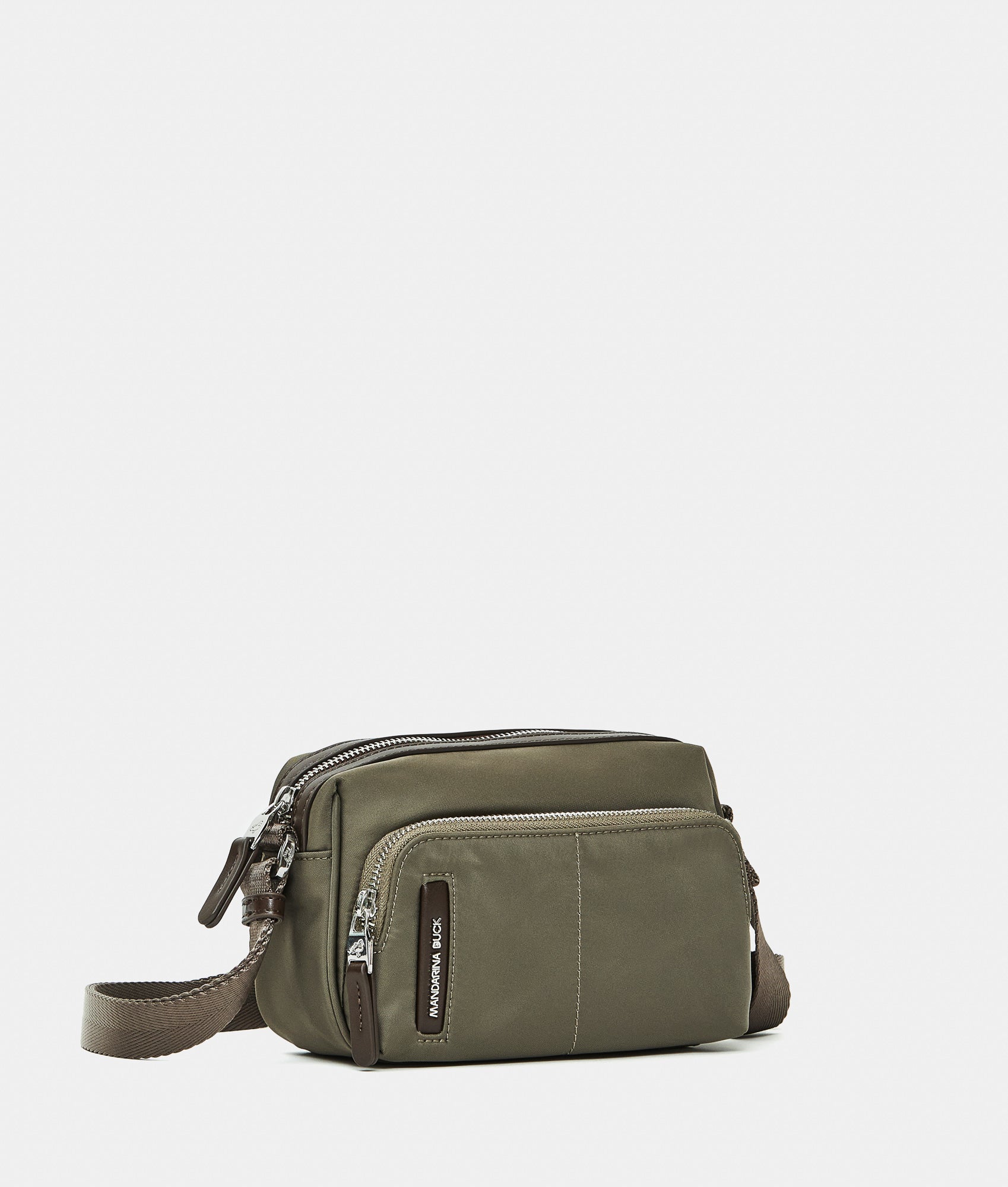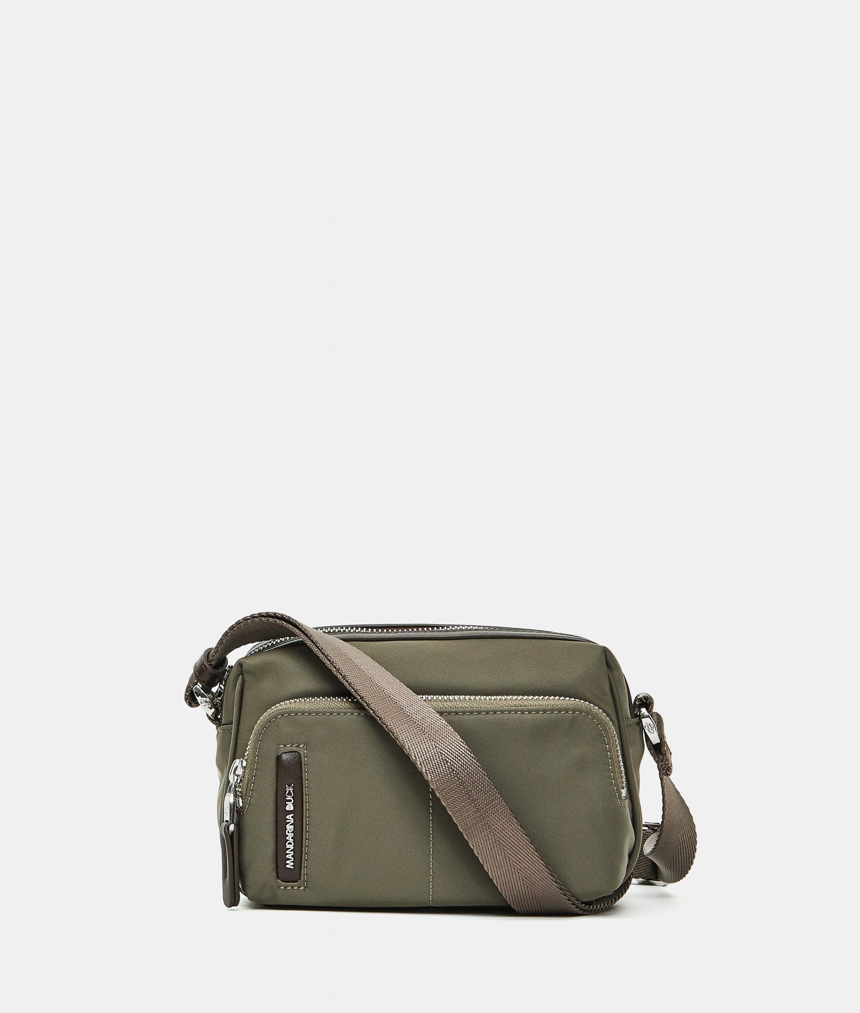 Mini crossbody bag with fabric zipper front cell phone pocket. Dual carrying options, smart front and internal pockets, custom details and adjustable jacquard strap.