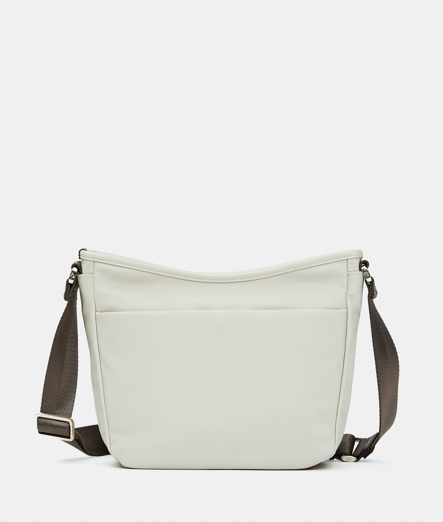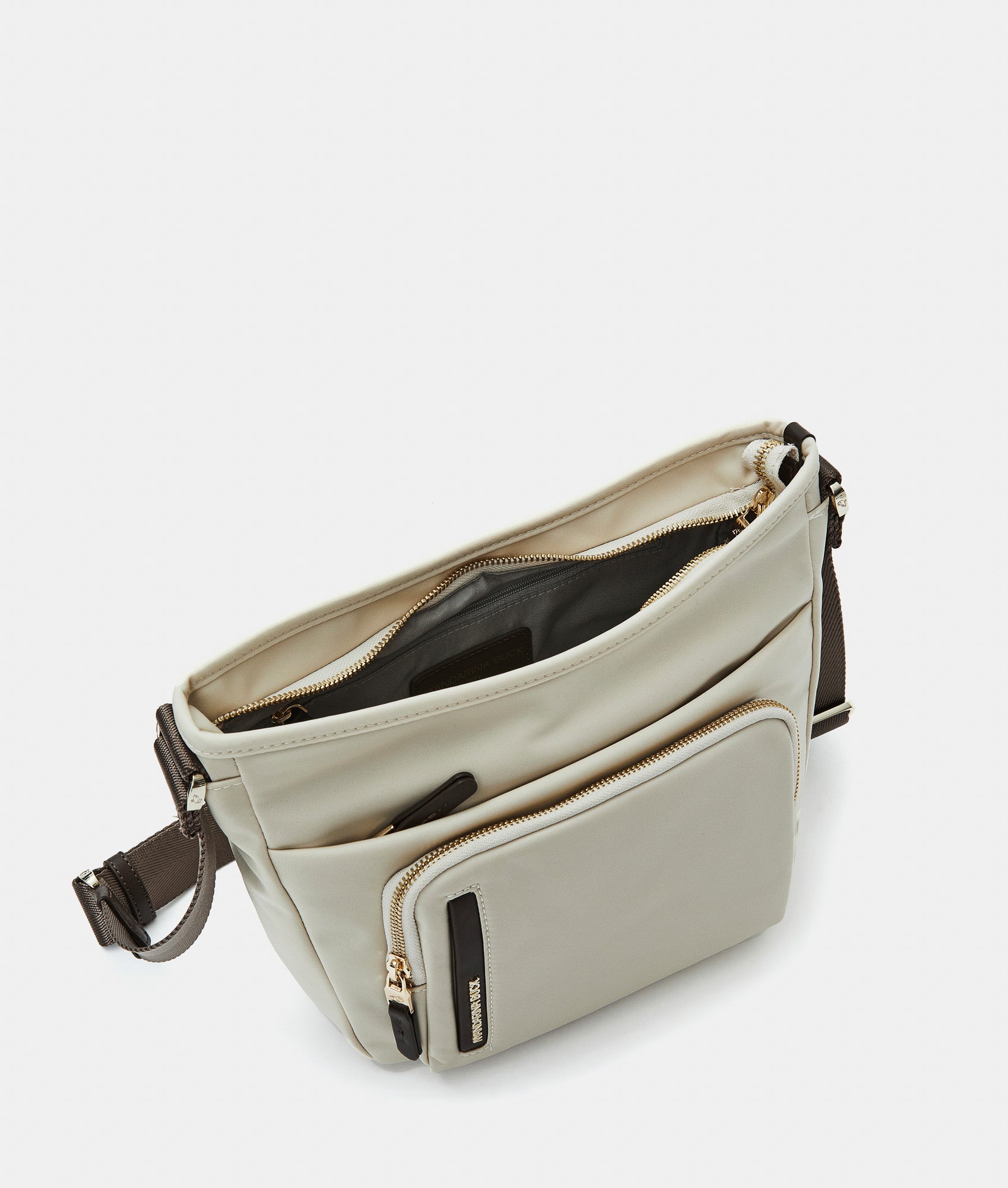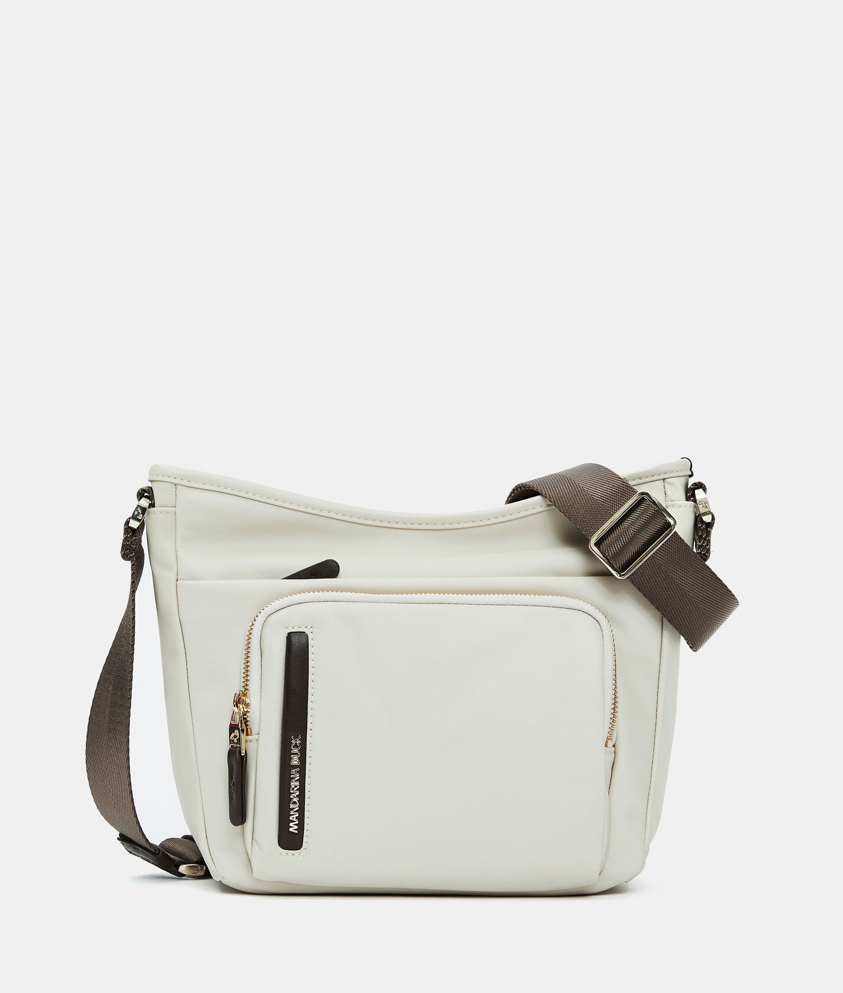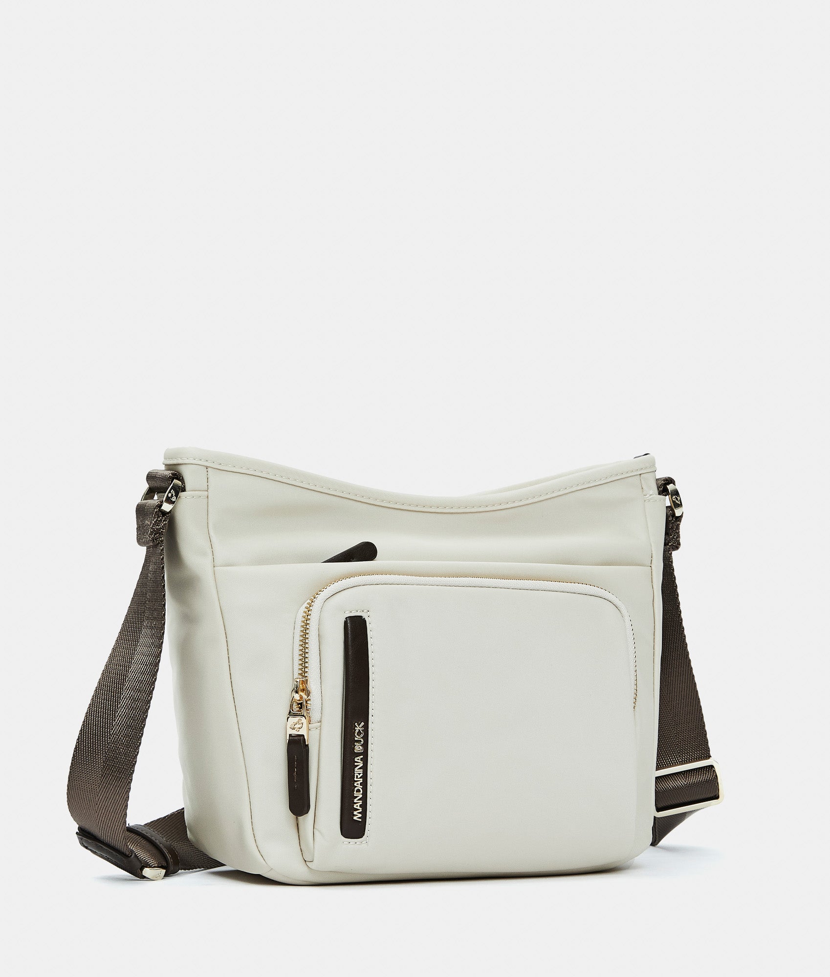 Small crossbody bag with fabric zipper front pocket. Dual carrying options, custom details and adjustable jacquard strap.