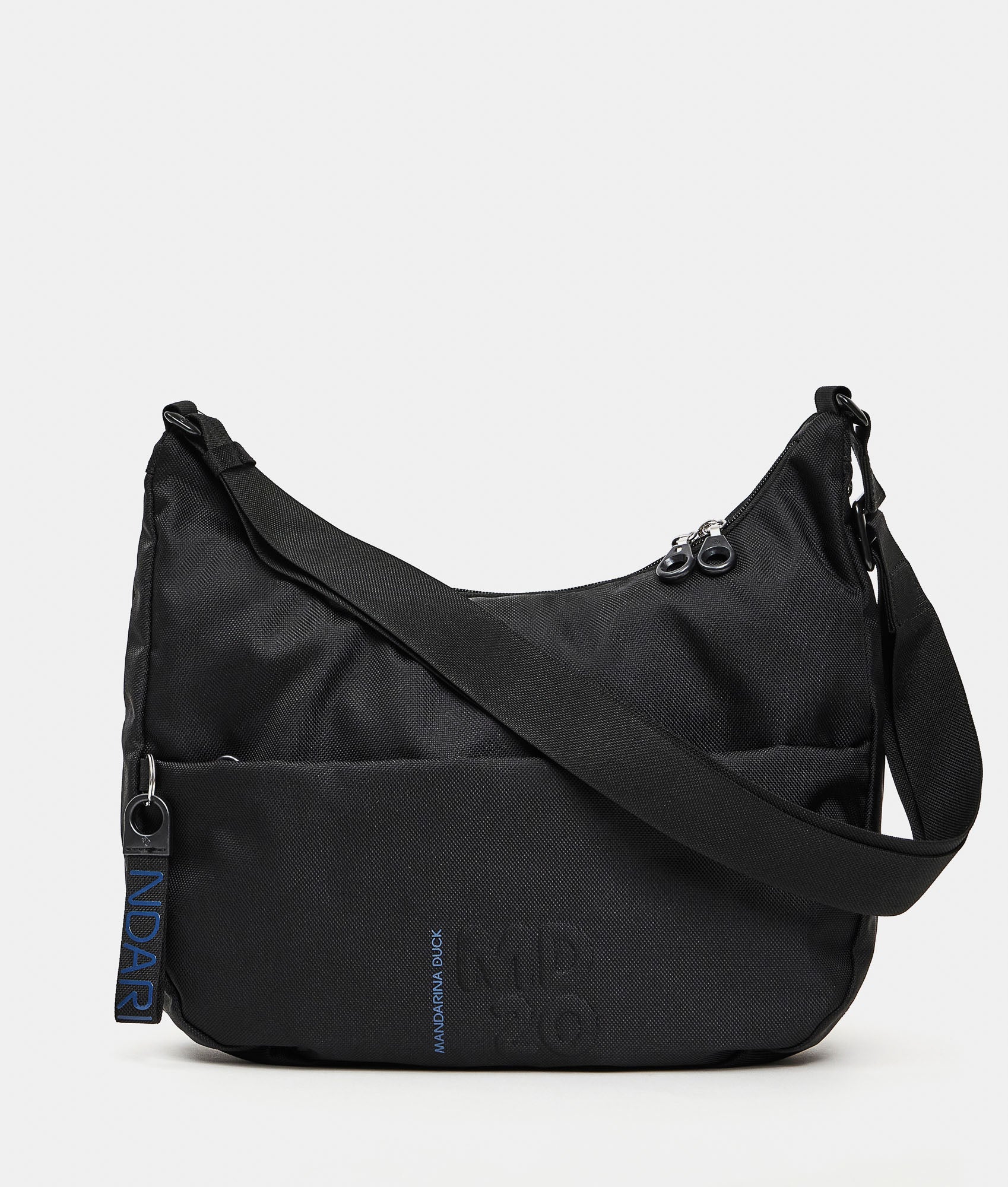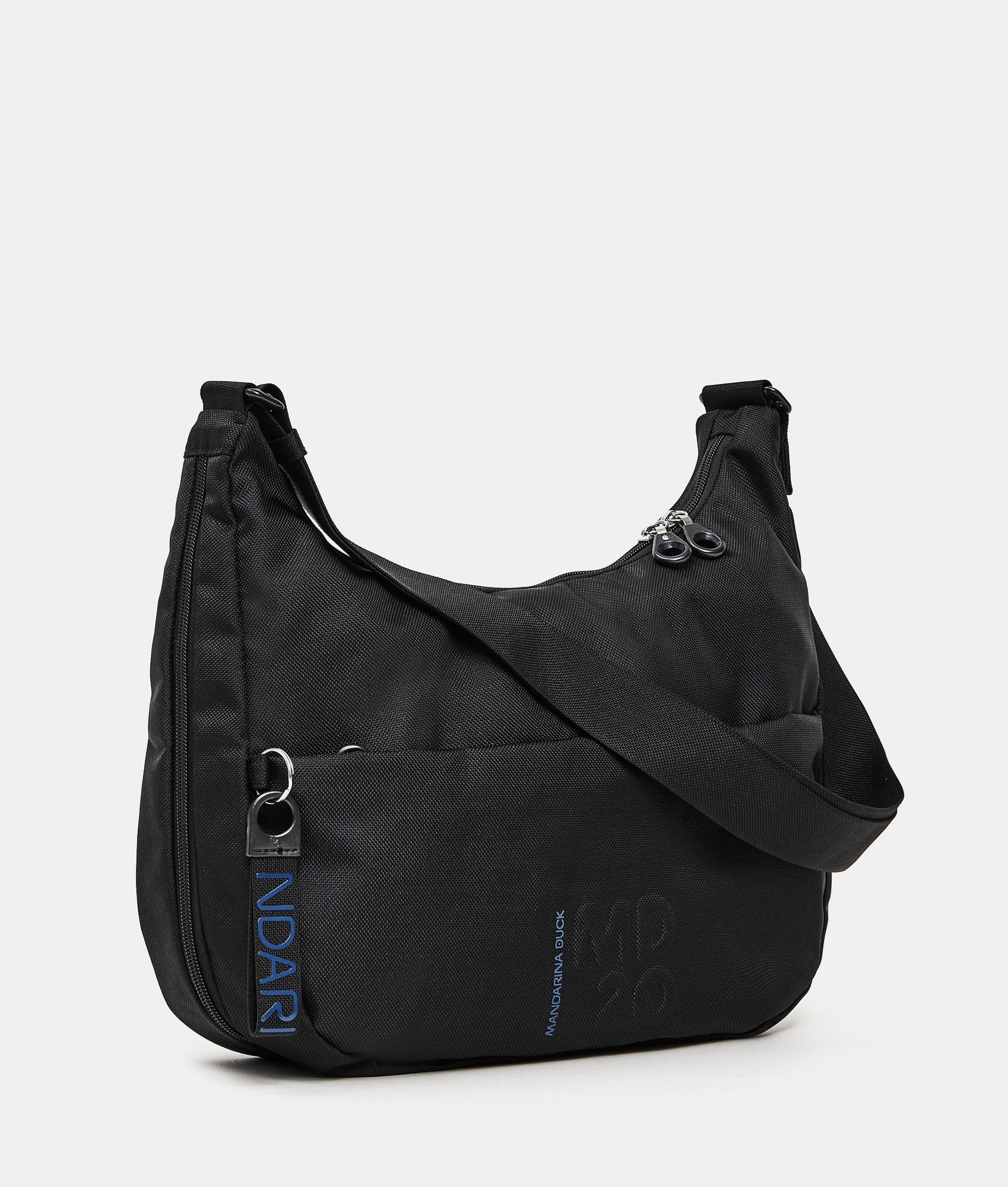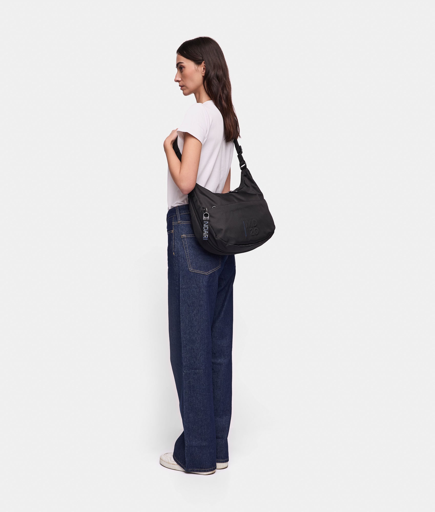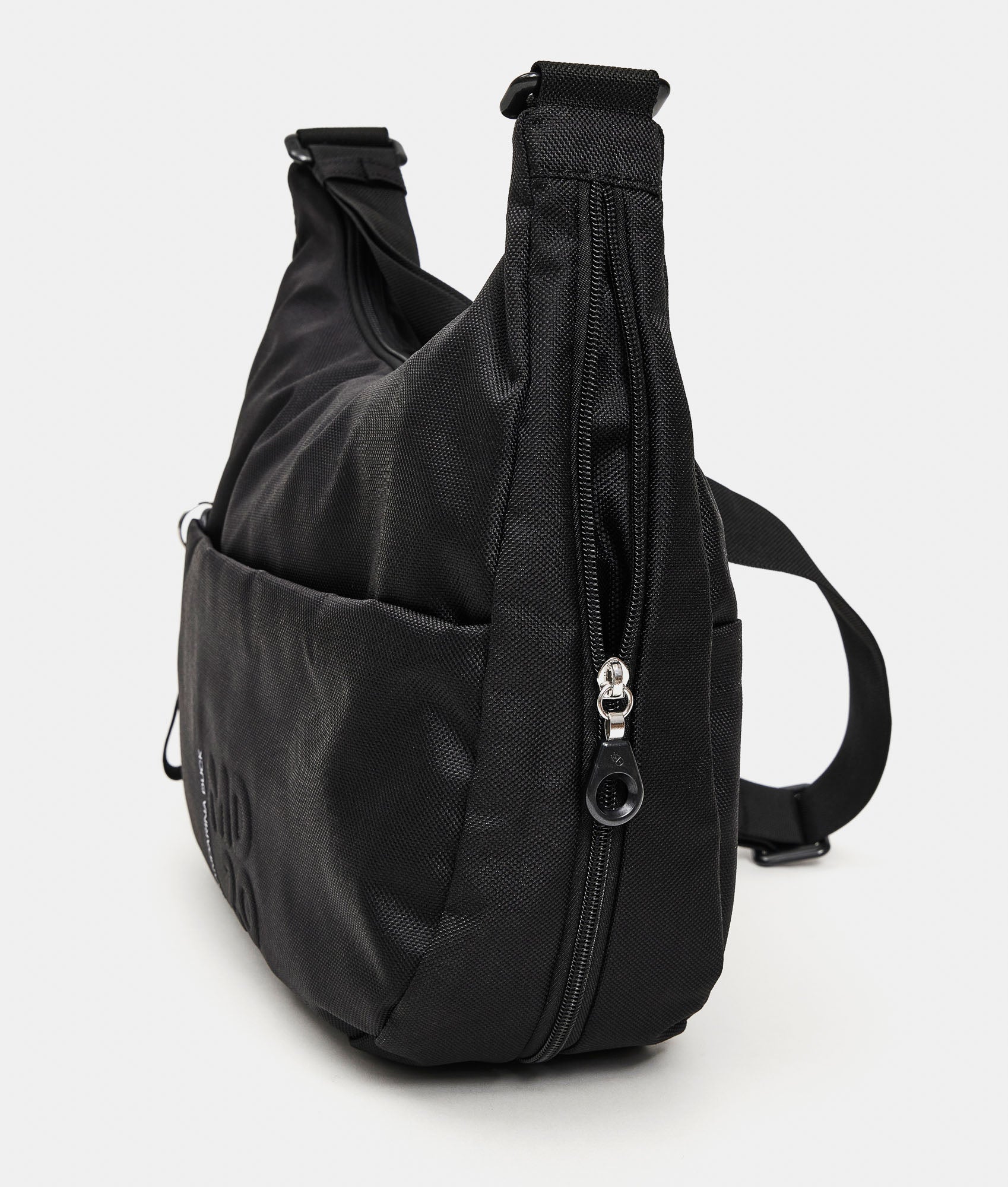 Expandable crossbody bag with lower zipper and large external flat pocket, main closure with double zipper in fabric. Double portability, personalized detaills and adjustable jacquard shoulder strap.