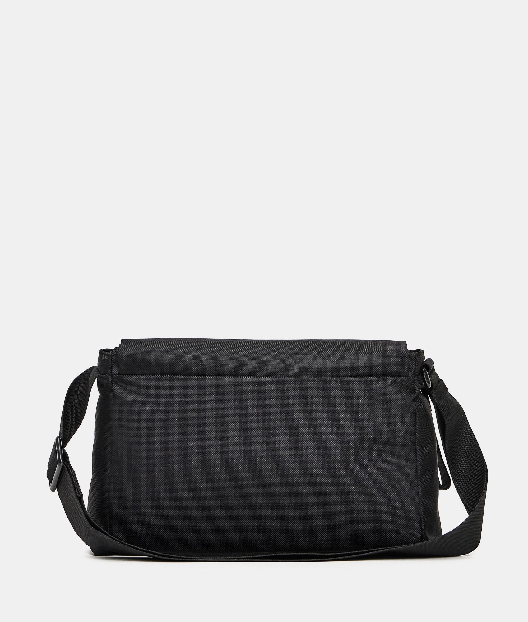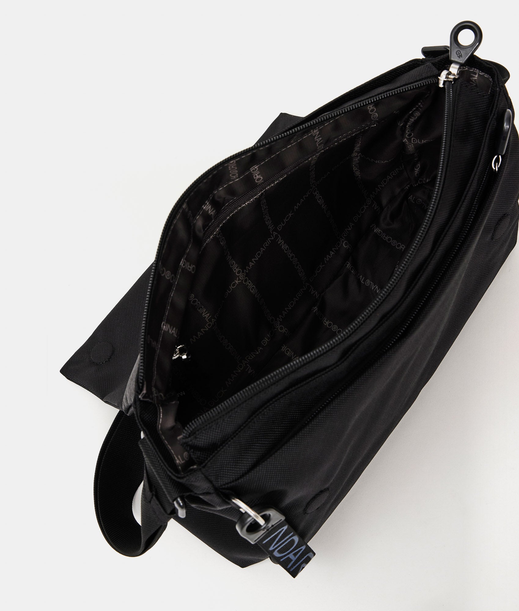Crossbody bag with flap and zipper in fabric. Double portability, personalized detaills and adjustable jacquard shoulder strap.