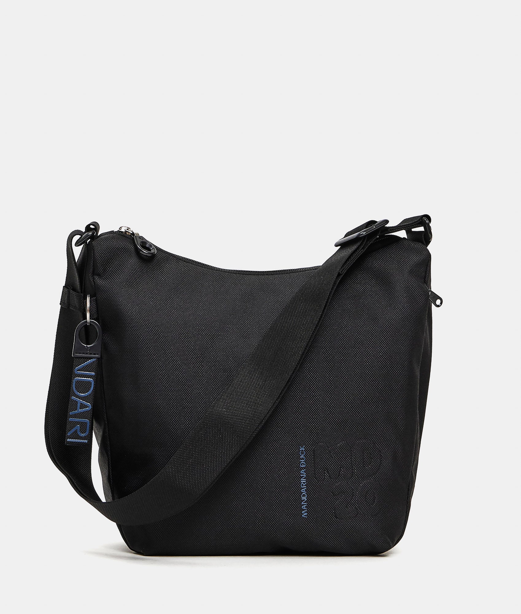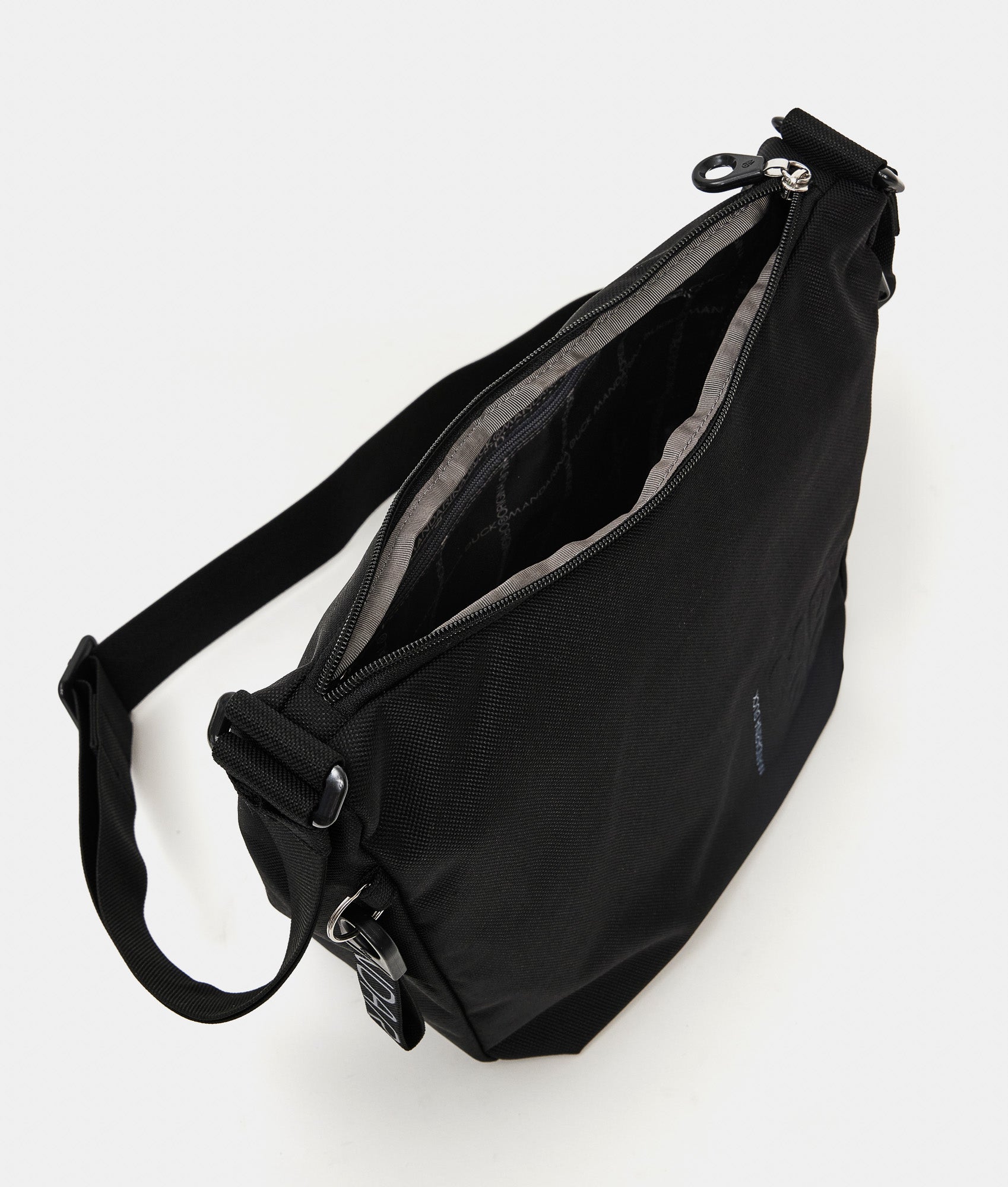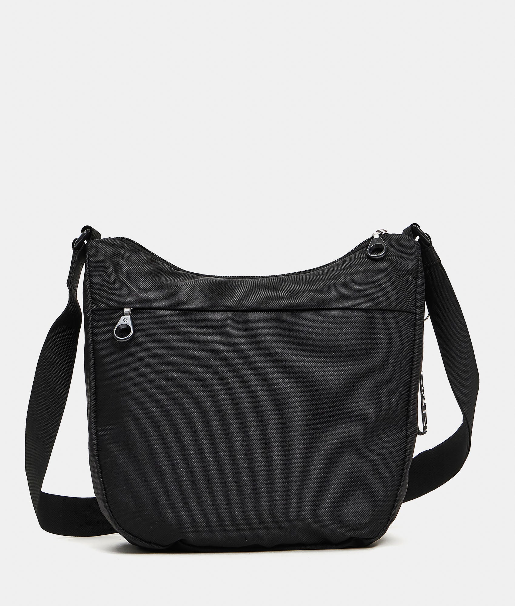 Medium shoulder bag with flat front pocket and side zipper in fabric. Dual portability, smart front and internal pockets, personalized detaills and adjustable jacquard shoulder strap.