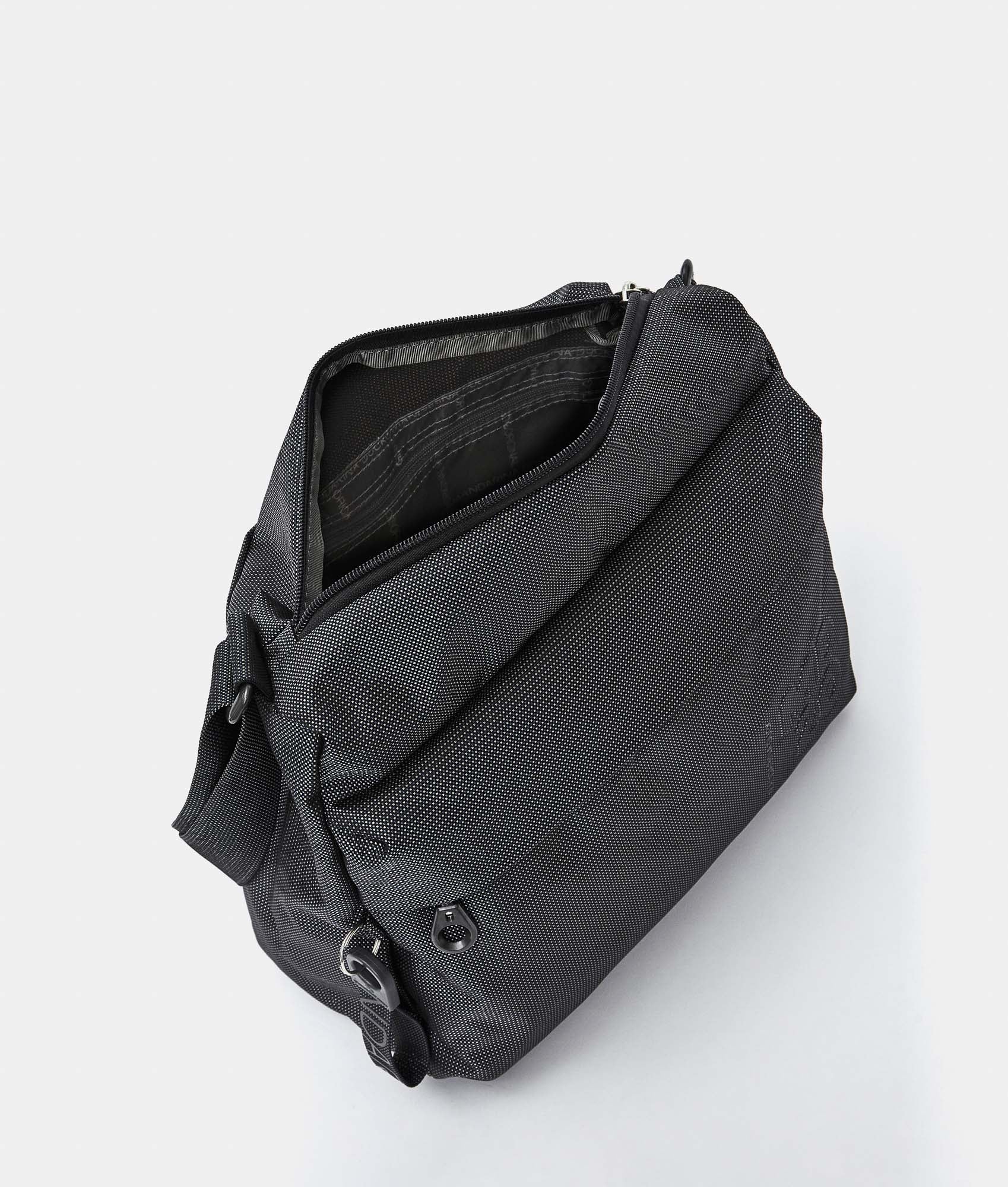 Dual portability, smart front and internal pockets, personalized detaills and adjustable jacquard shoulder strap.