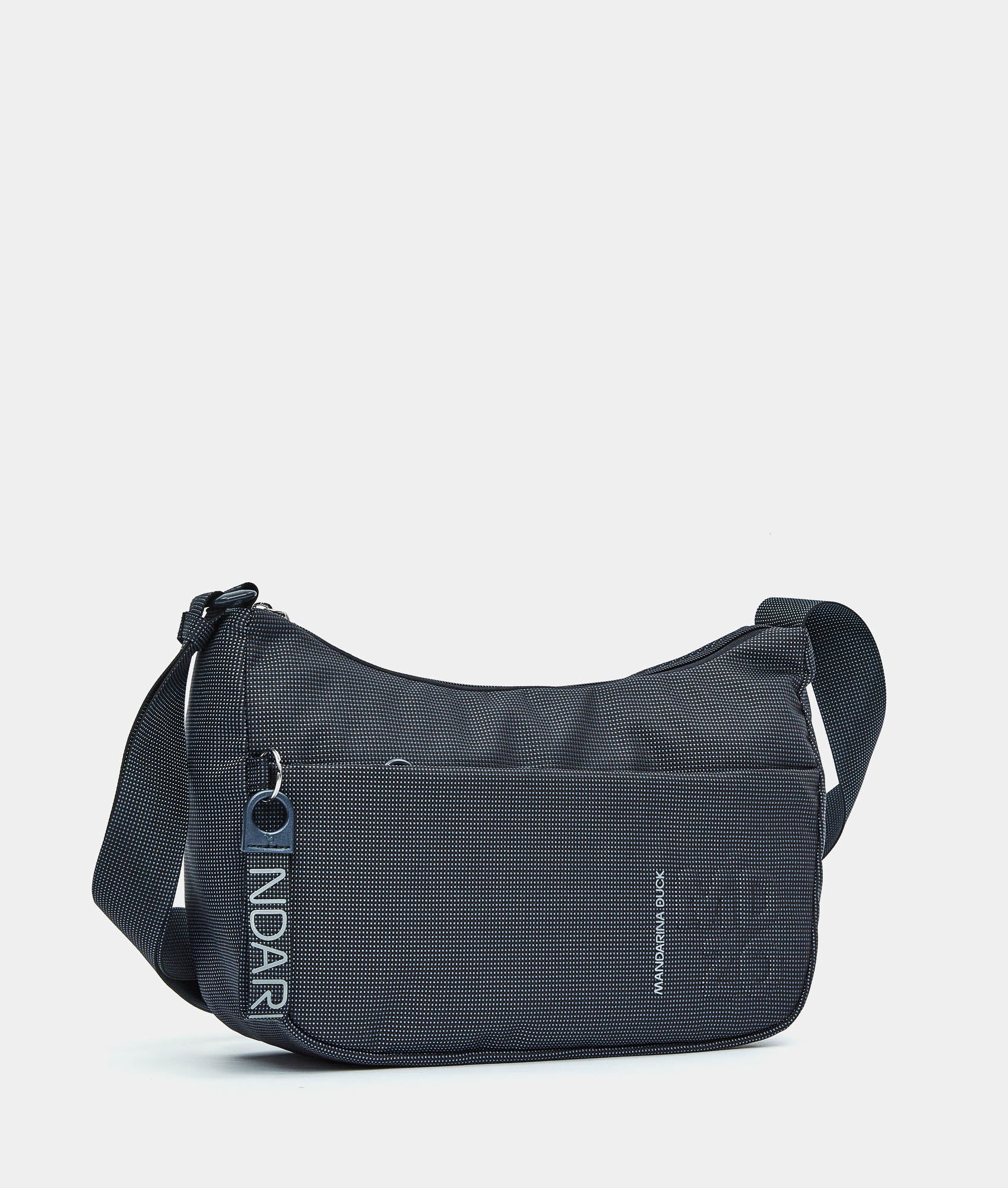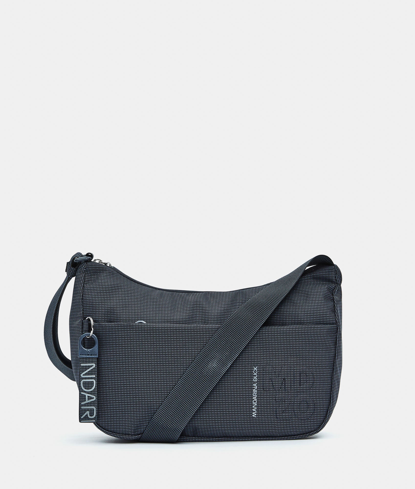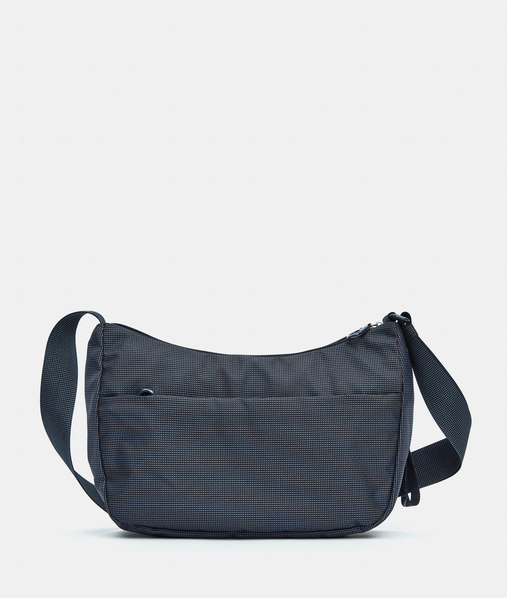 Medium crossbody bag with a flat pocket in fabric. Double portability, personalized detaills and adjustable jacquard shoulder strap.