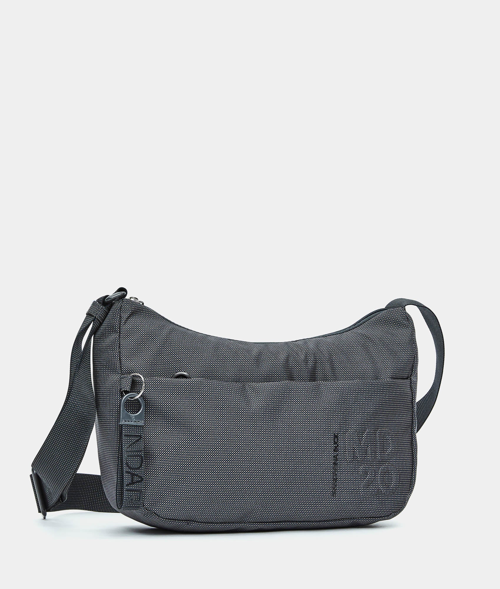 Medium crossbody bag with a flat pocket in fabric. Double portability, personalized detaills and adjustable jacquard shoulder strap.