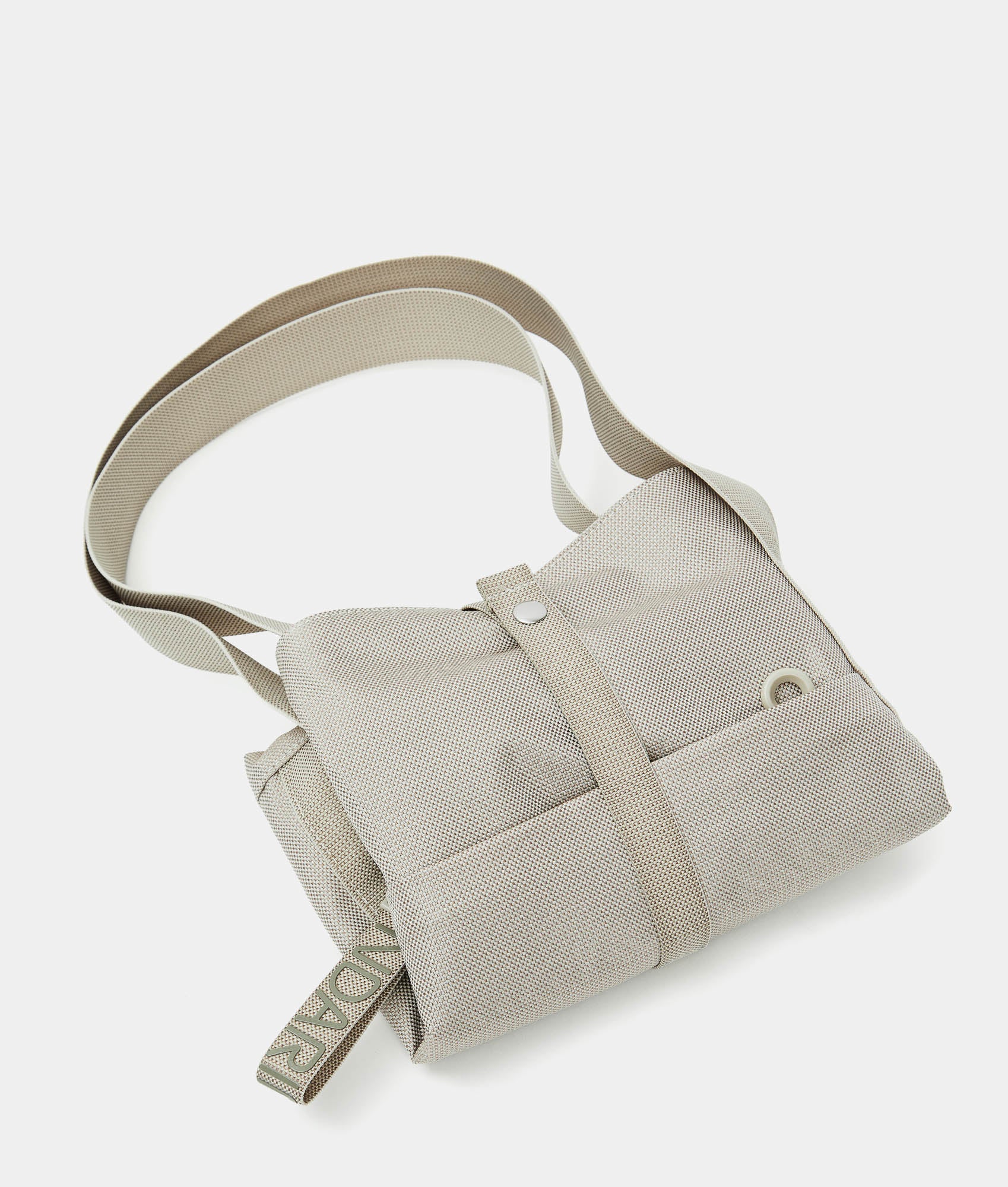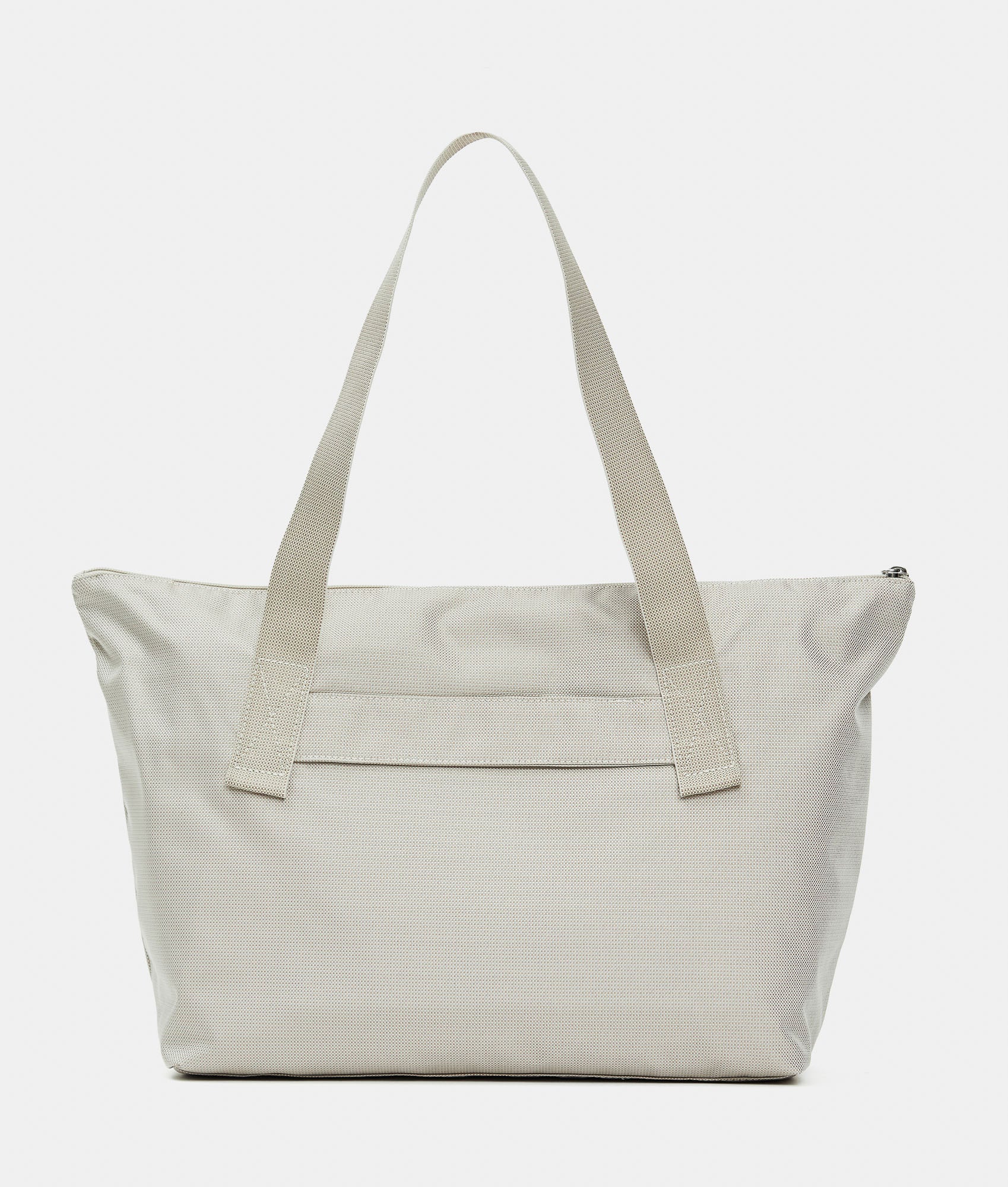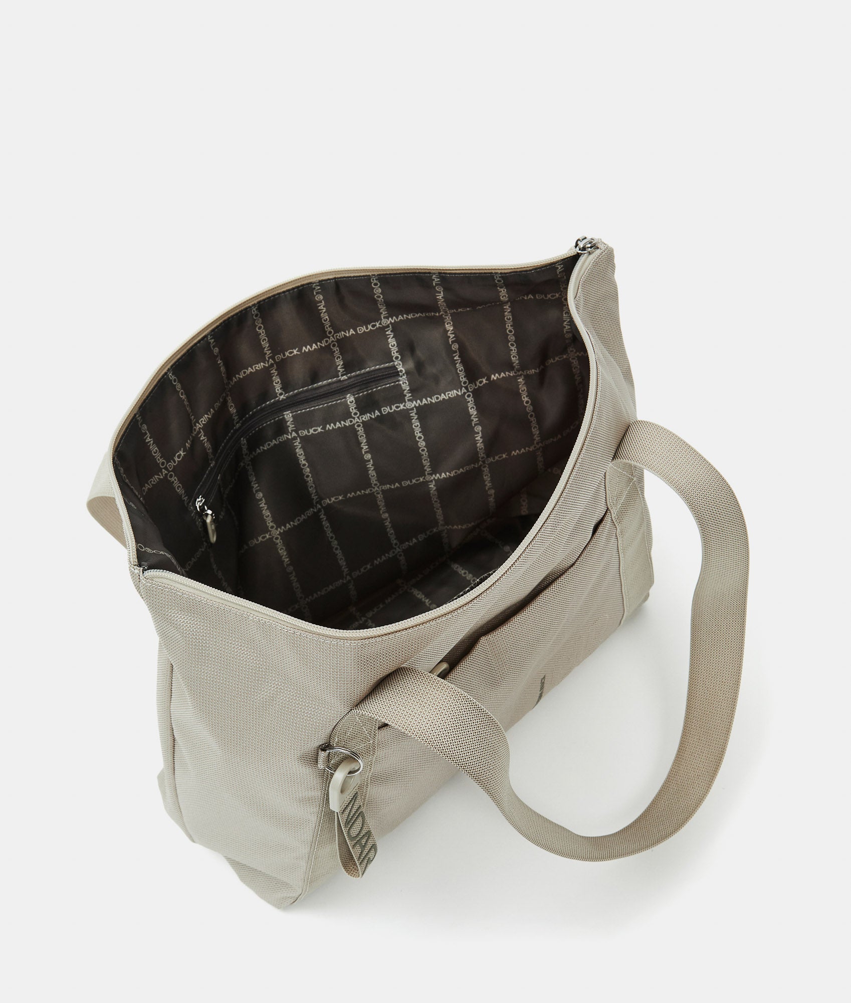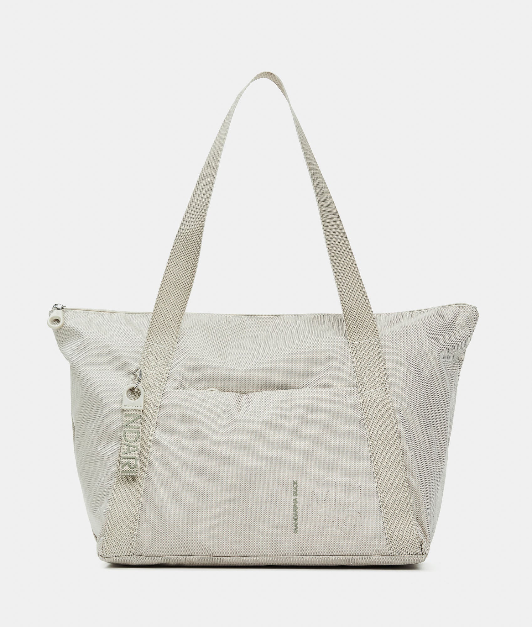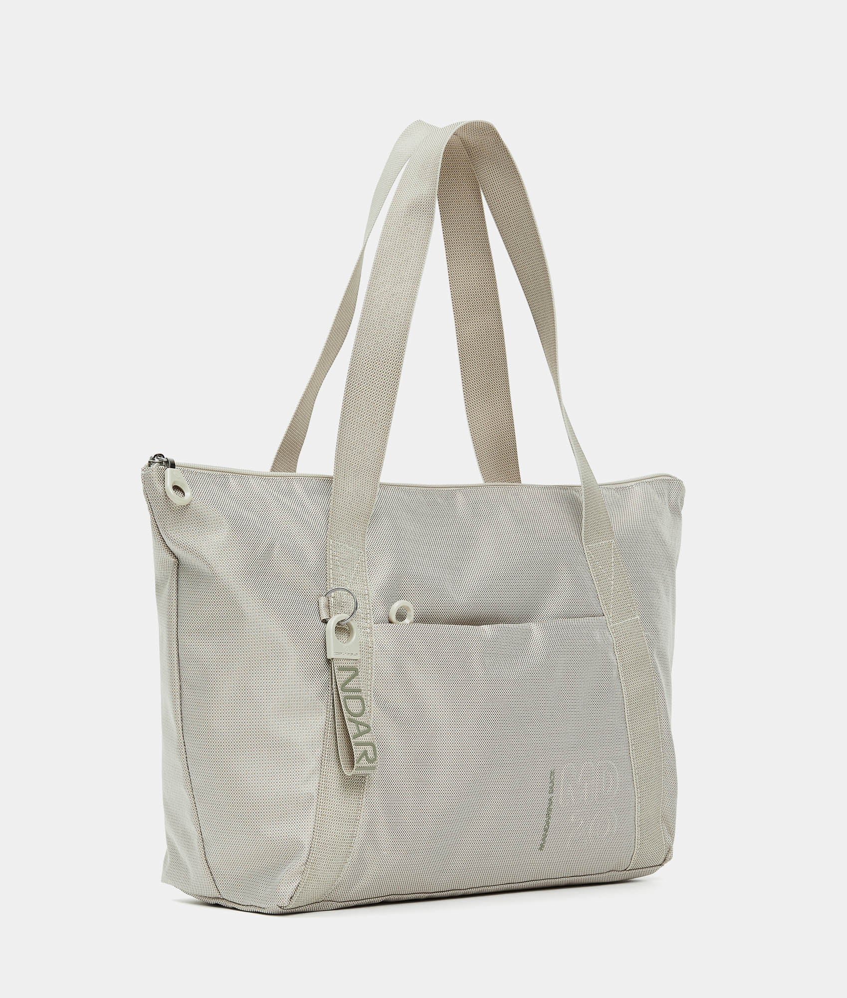 Foldable shopper with front pocket with zip in fabric. Smart pockets, personalized details, internal ribbon for folding it, and rear strap for suitcase trolley insertion.