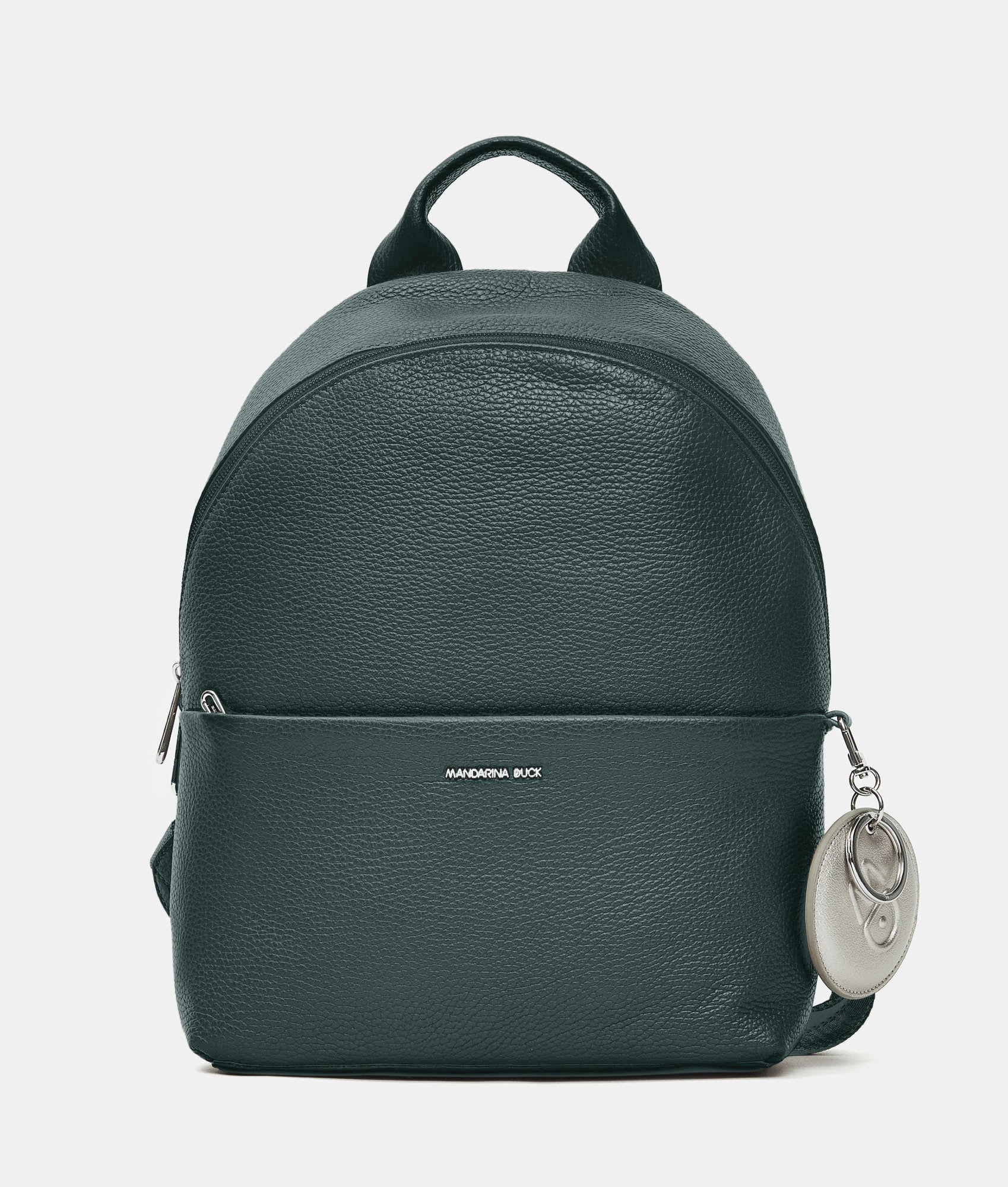 Medium leather backpack with double zipper and external charm. Smart internal and external pockets, custom metal details, and adjustable jacquard straps.