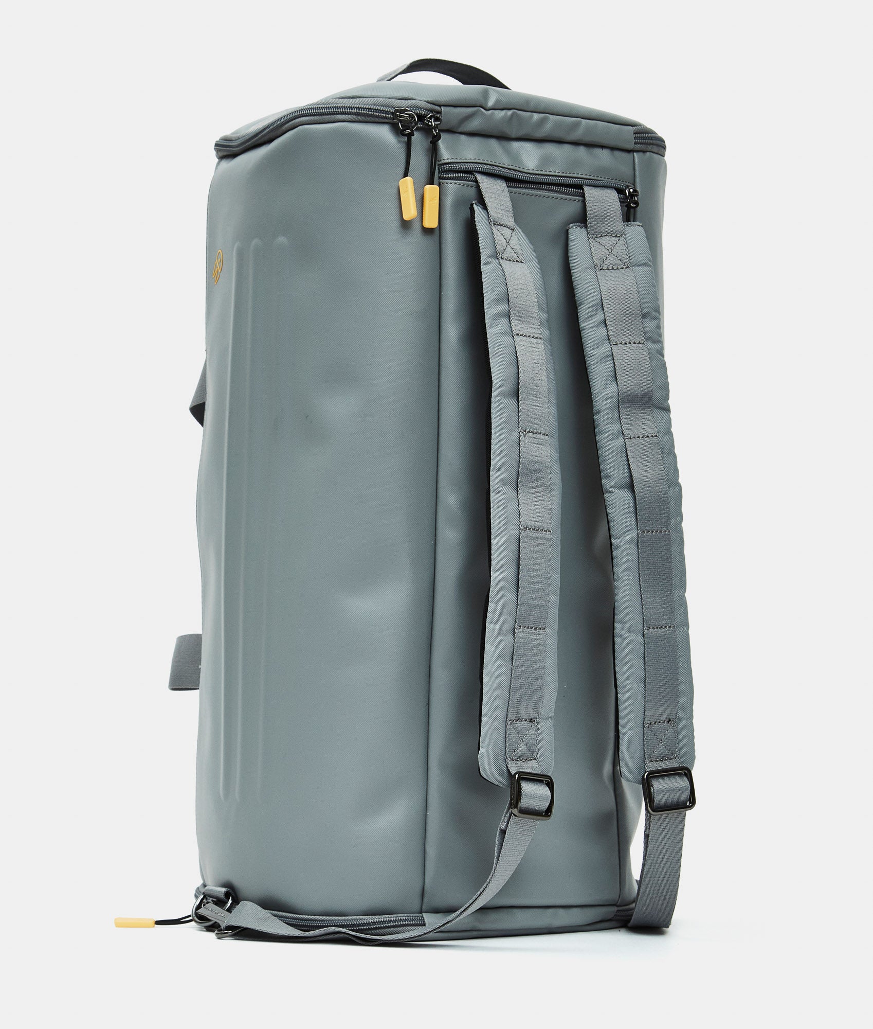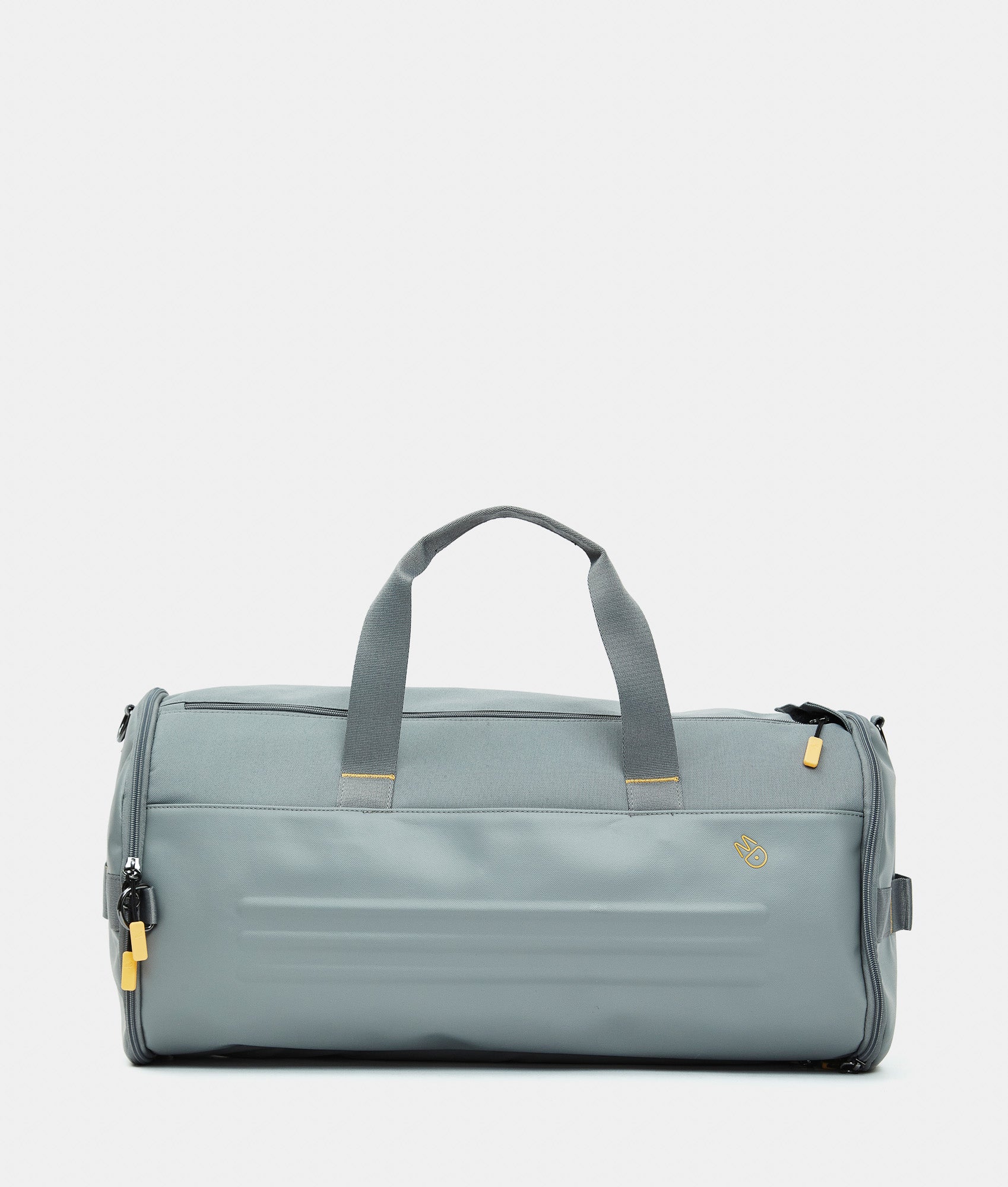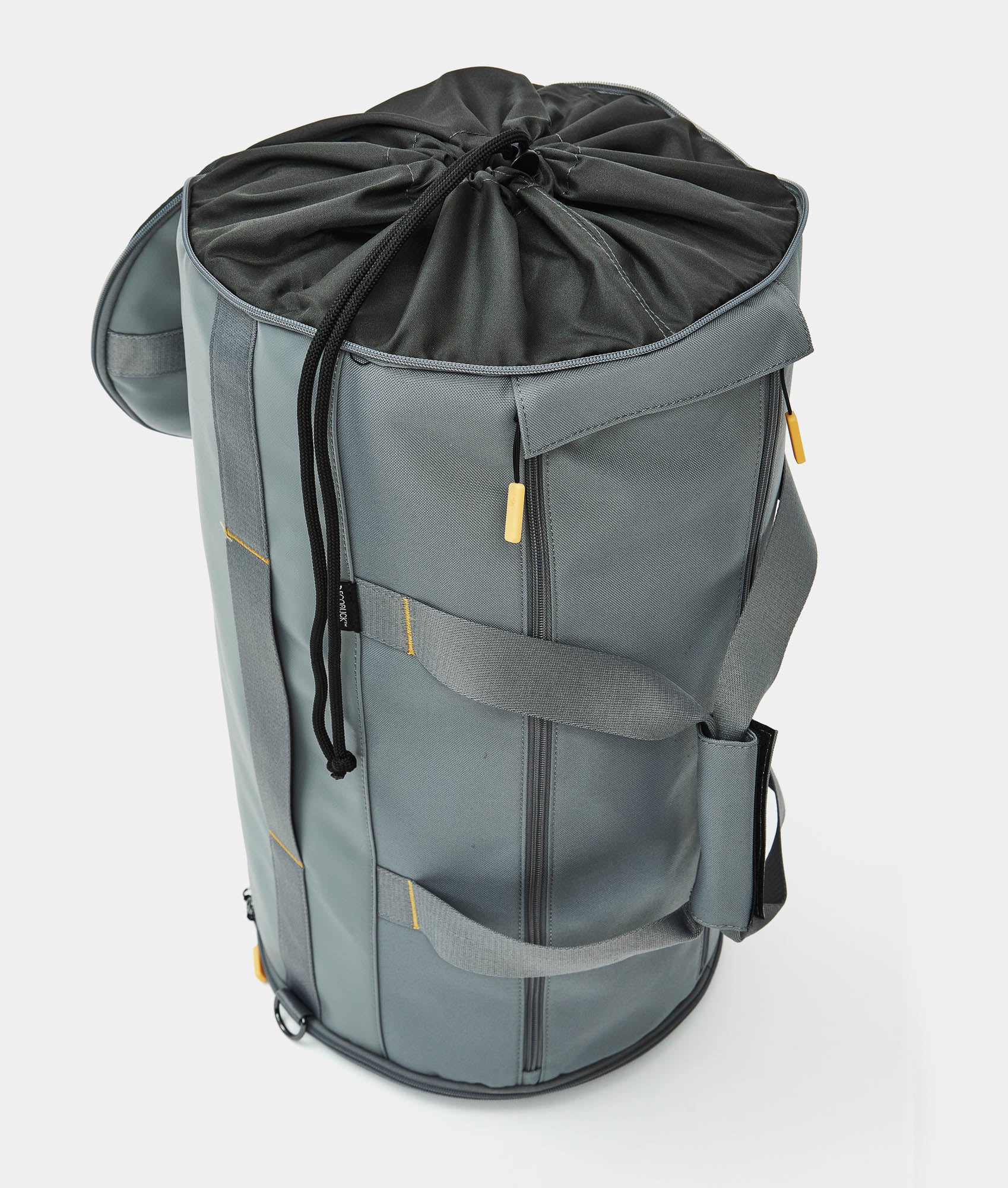 Multifunction Duffel Backpack with triple carrying options: backpack, shoulder, and hand carry, made of 100% recycled fabric. External and internal pockets, custom details.
