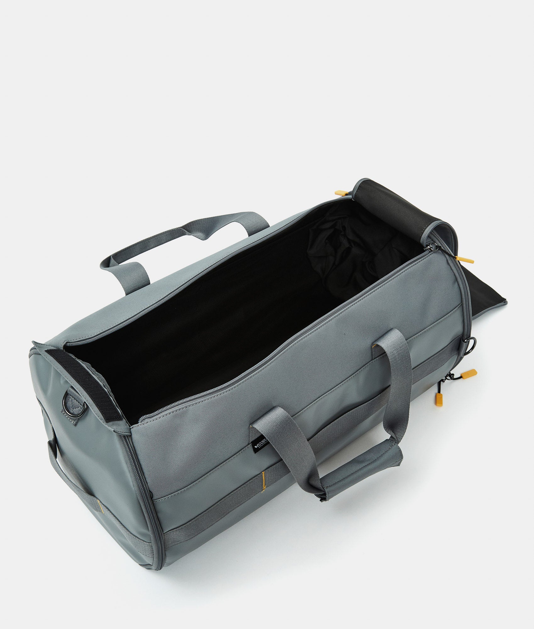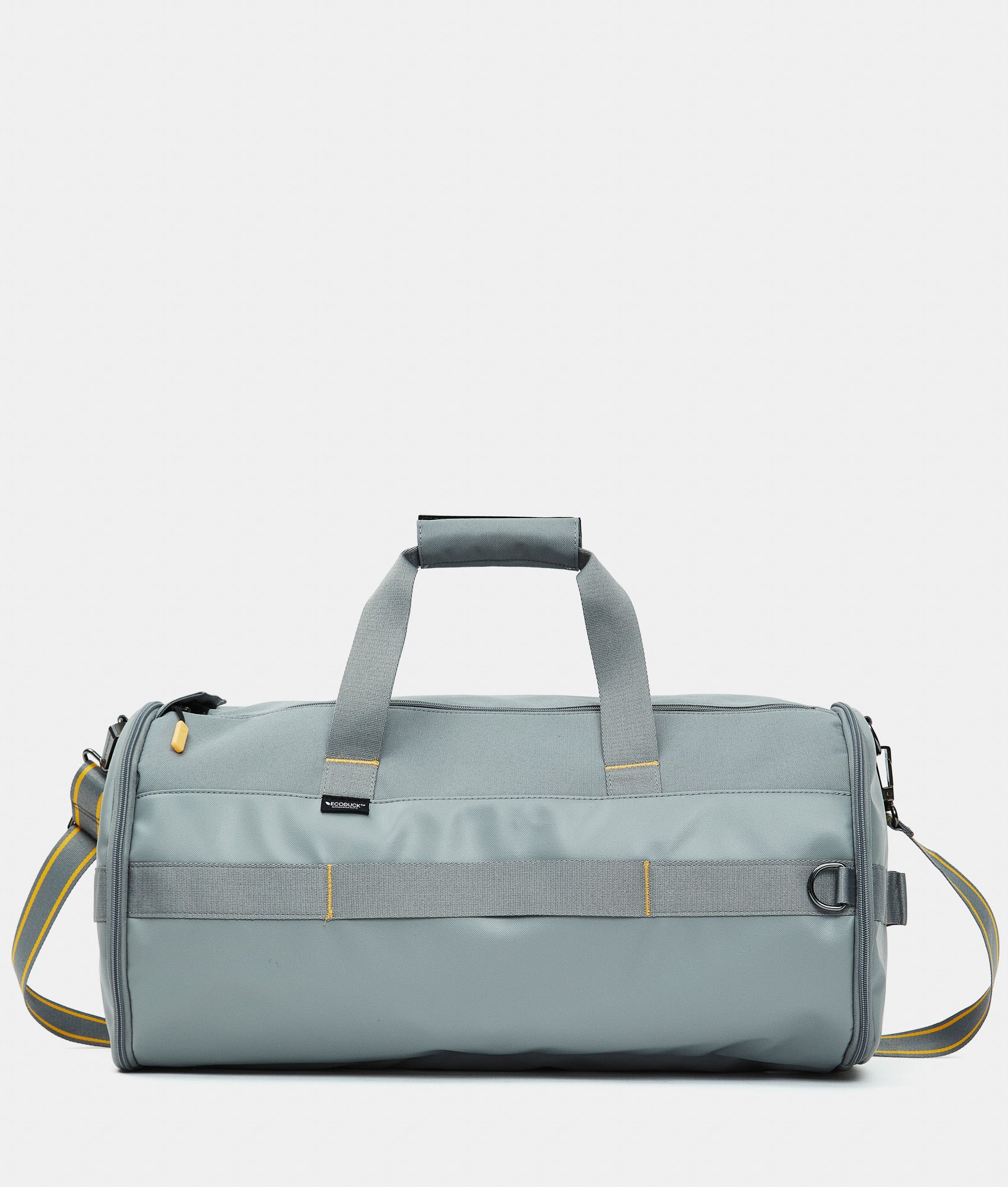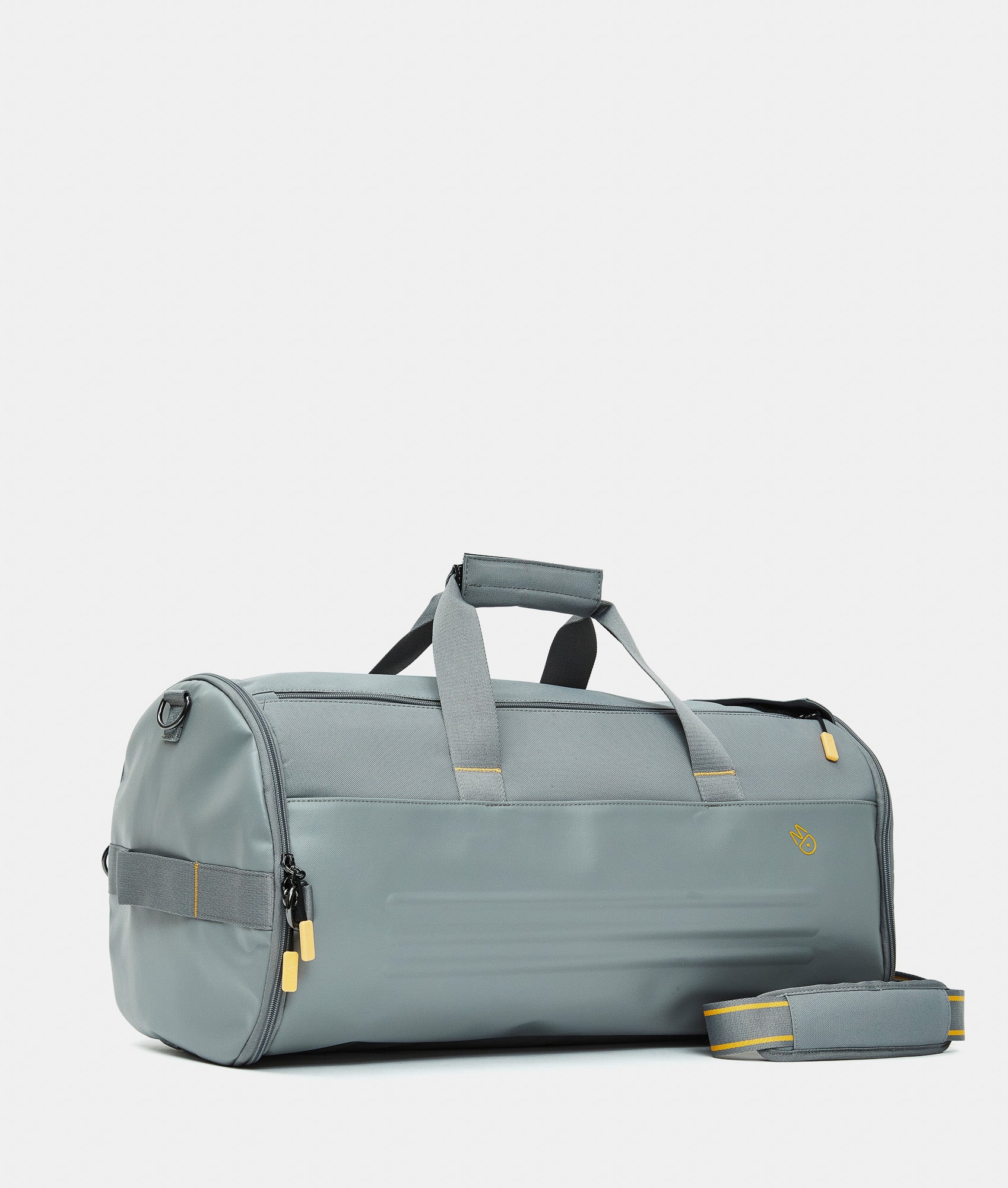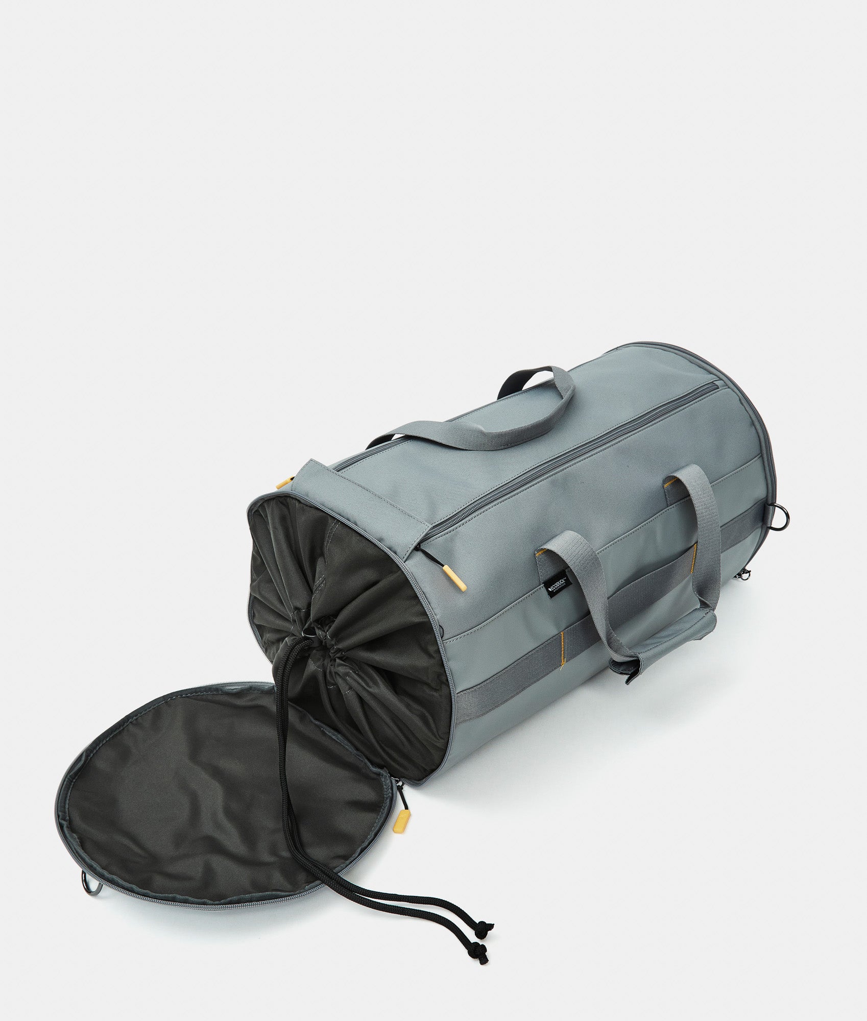 Multifunction Duffel Backpack with triple carrying options: backpack, shoulder, and hand carry, made of 100% recycled fabric. External and internal pockets, custom details.
