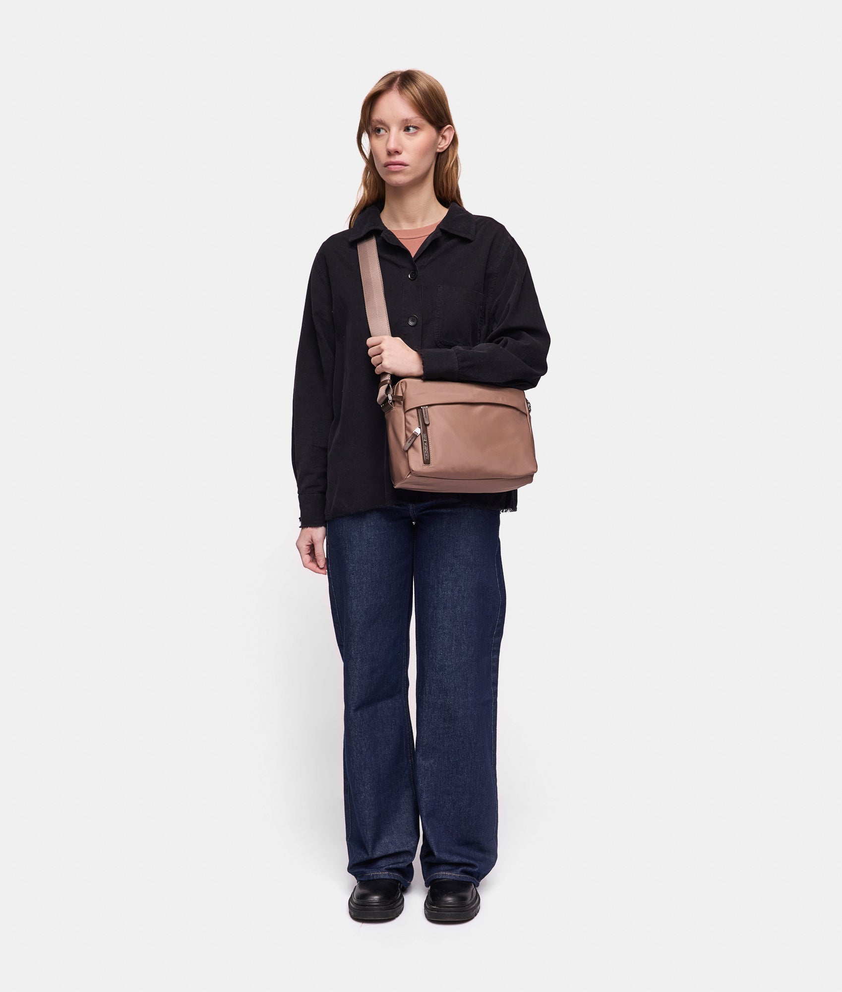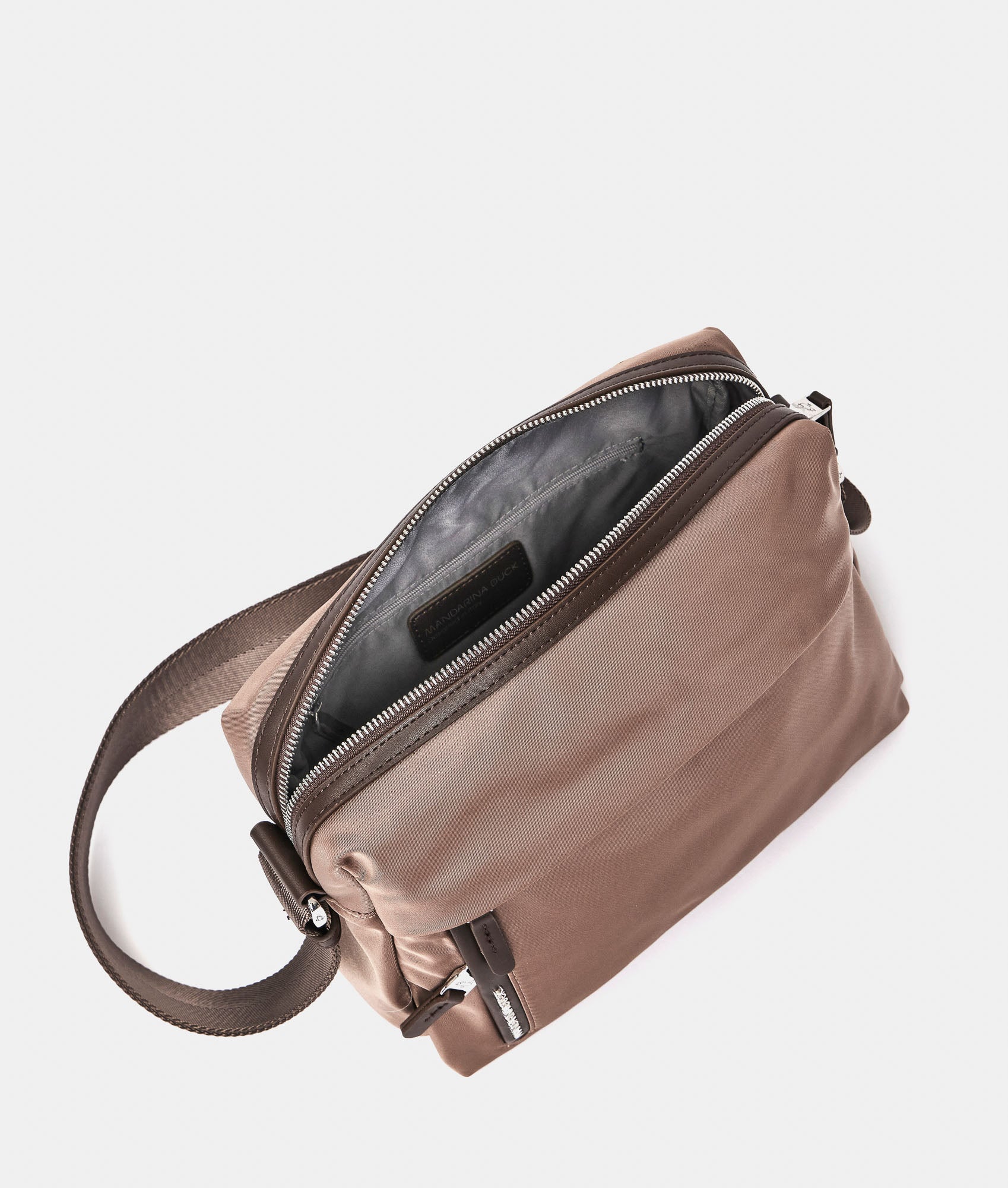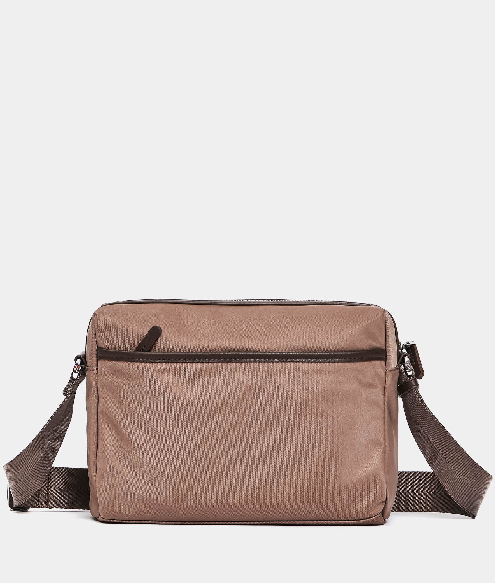 Borsa a tracolla media con tasca frontale con zip in tessuto. Doppia portabilità, tasche smart frontali e interne, dettagli personalizzati e tracolla regolabile in jacquard.