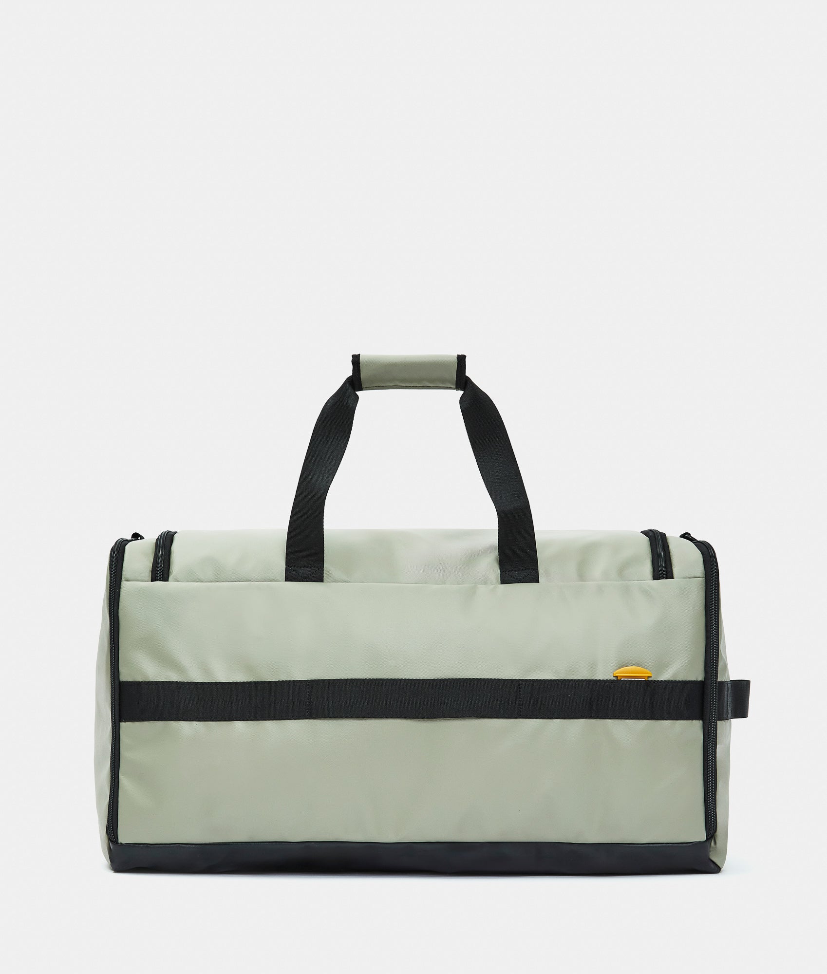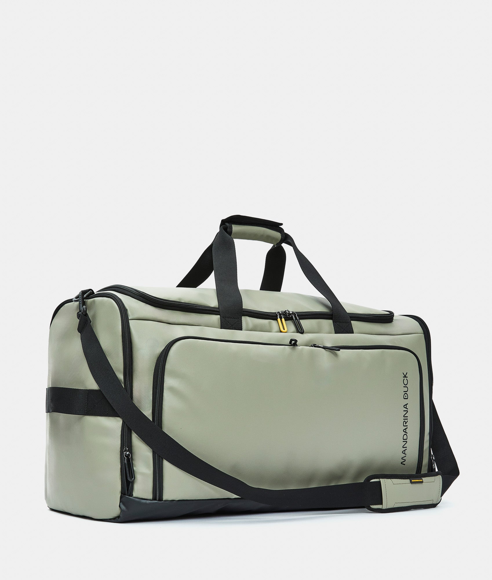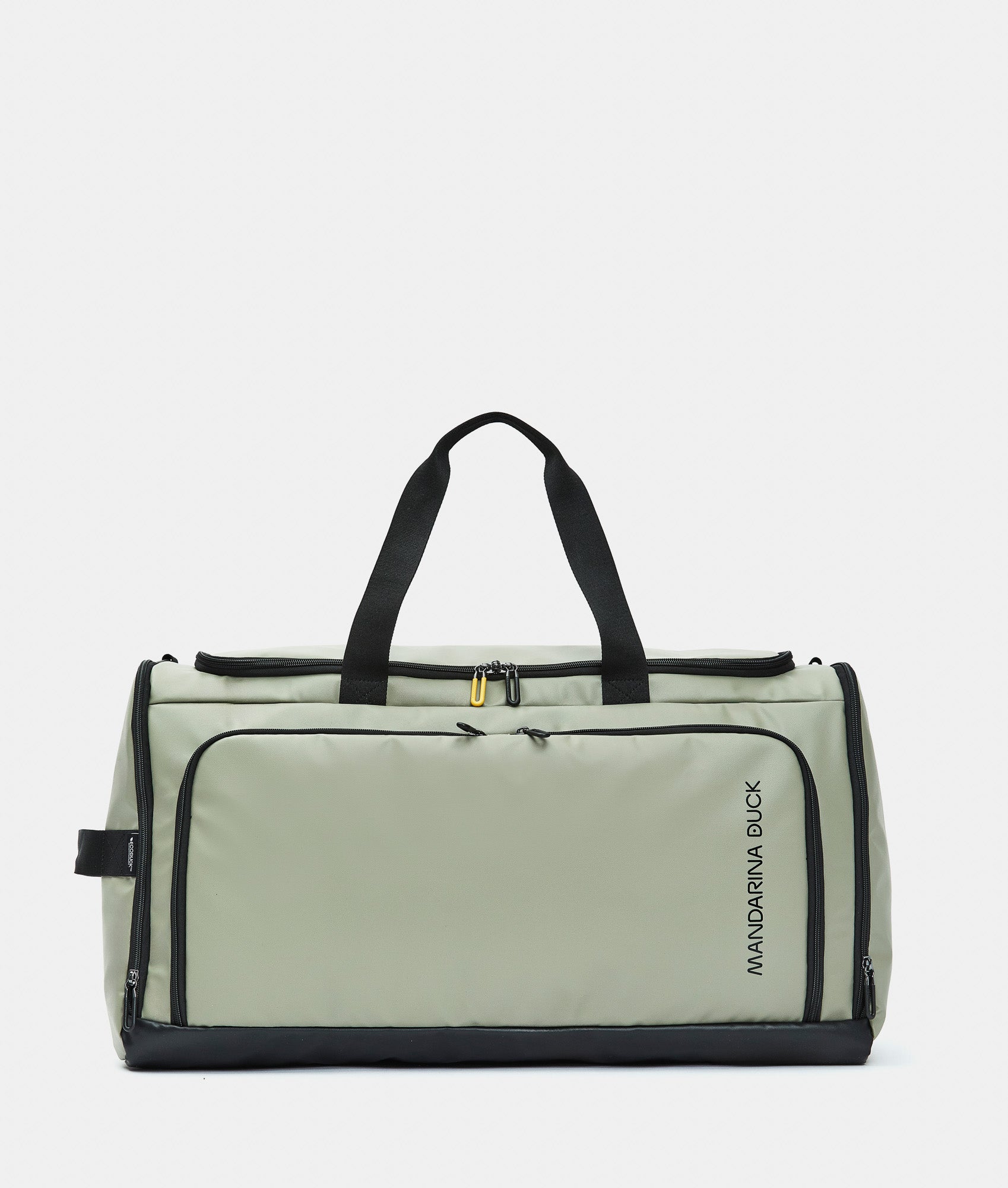 Borsone grande con tasca forntale con zip, manici e tracolla, in tessuto 100% riciclato. Doppia portabilità , a tracolla e a mano, con tasche esterne ed interne, dettagli personalizzati.