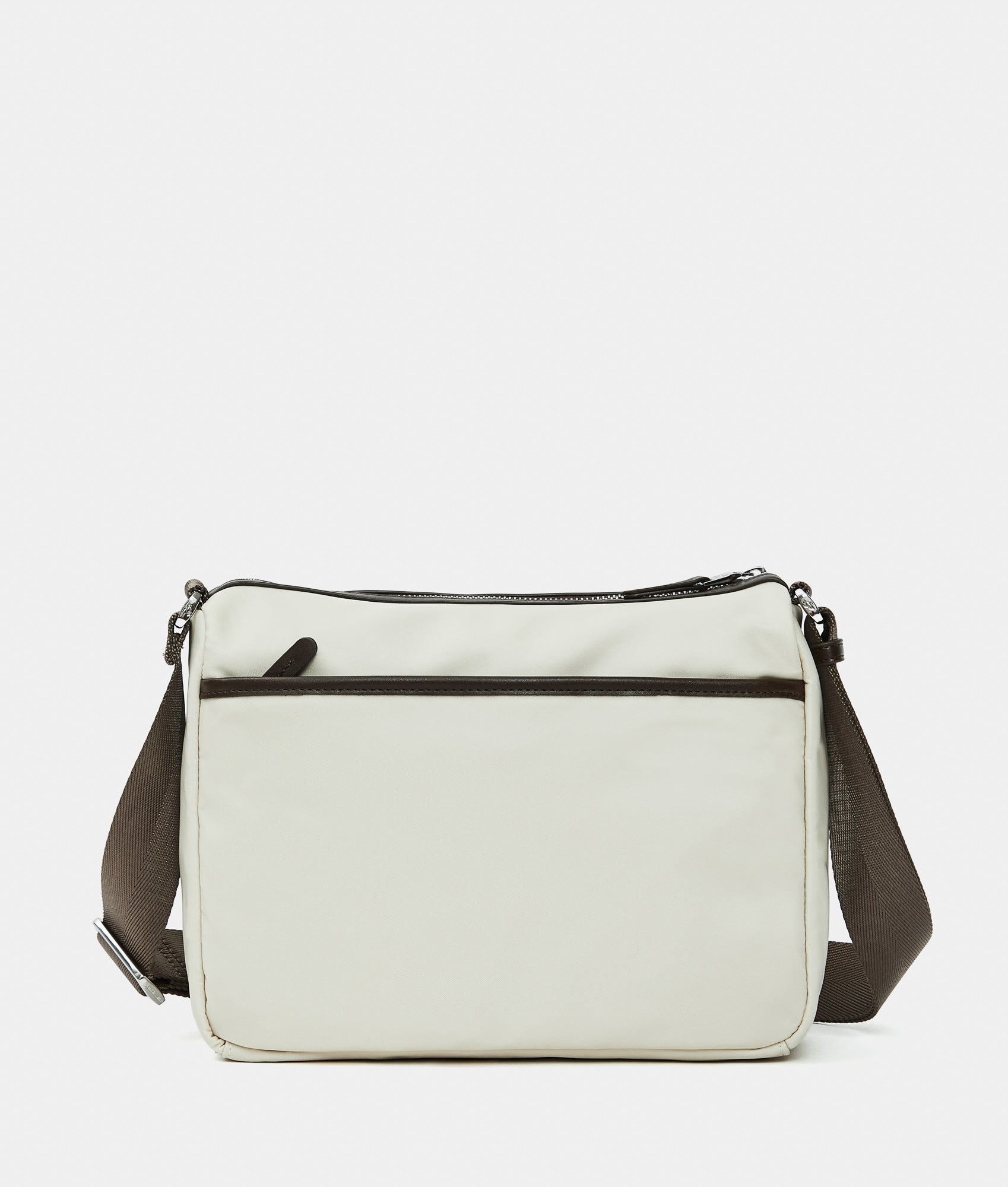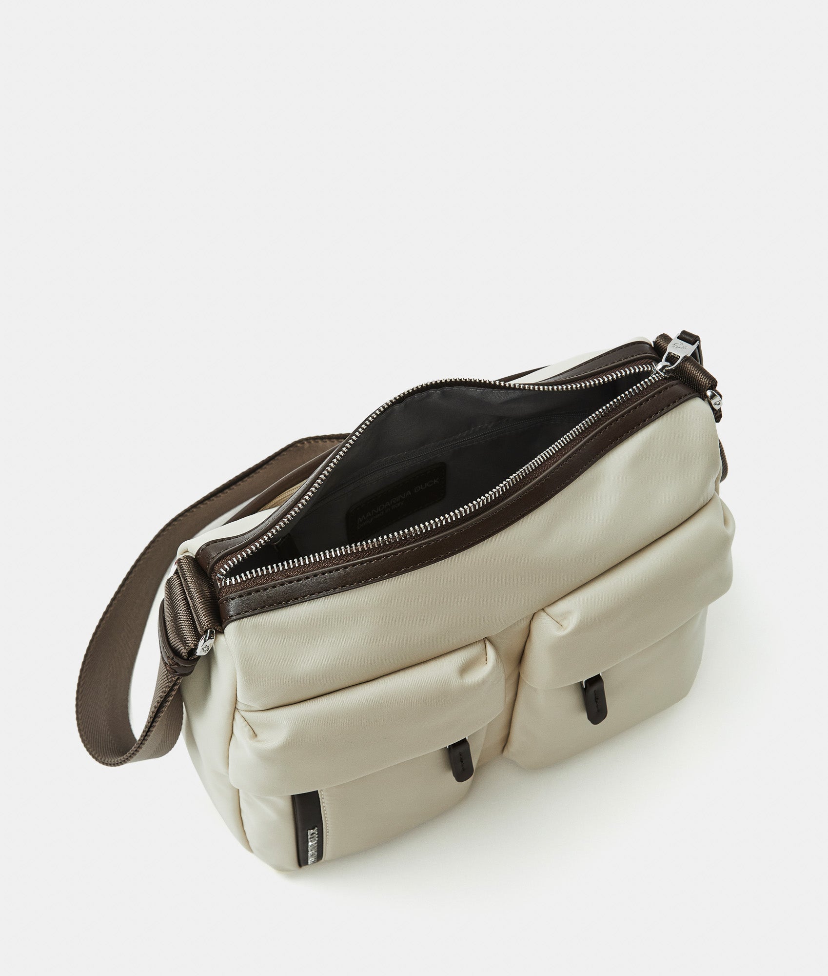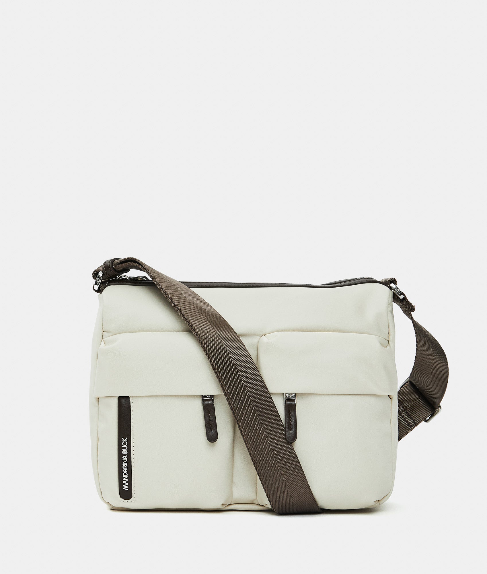 Crossbody bag with double front pockets and fabric zippers. Dual carrying options, smart front, back, and internal pockets, custom details and adjustable jacquard strap.