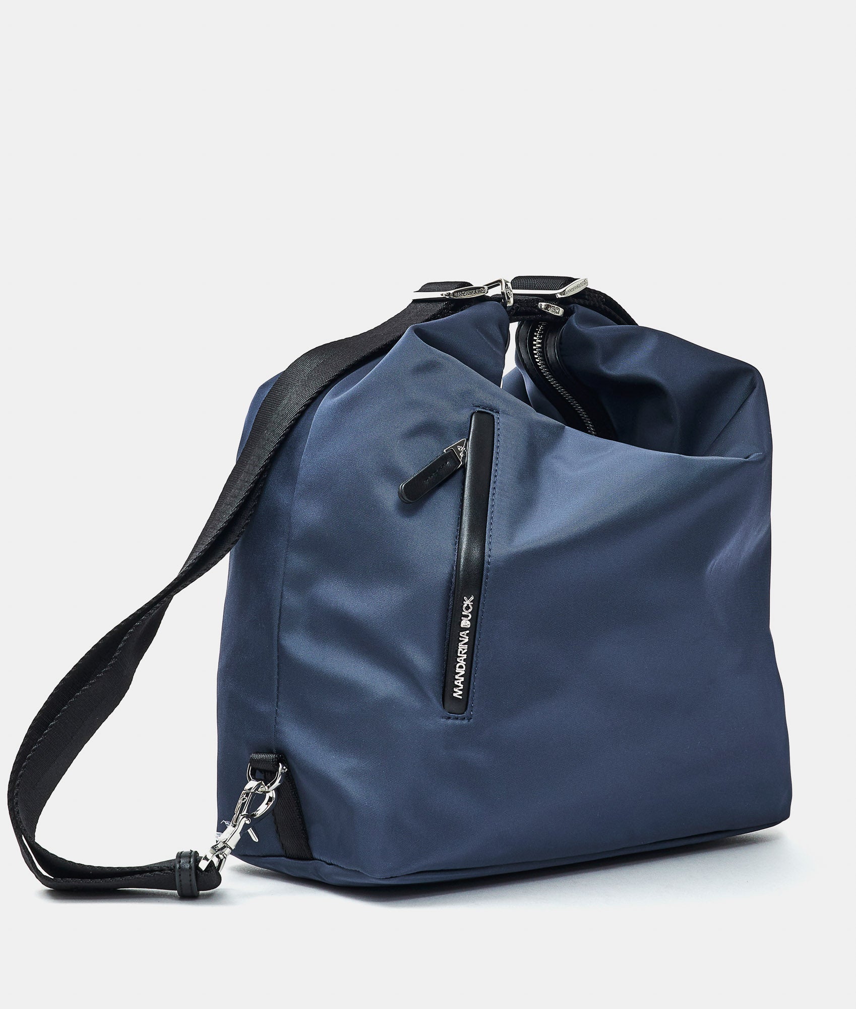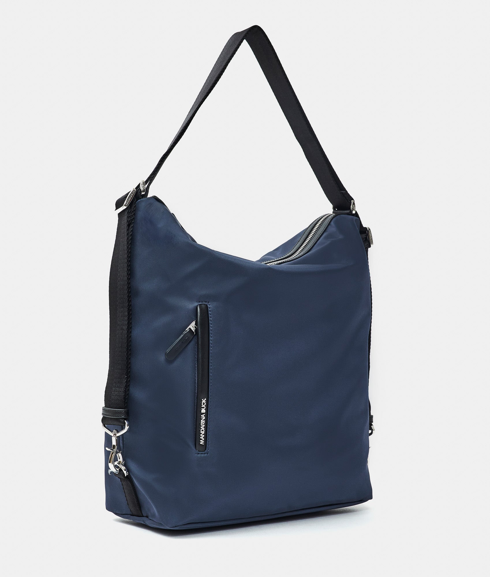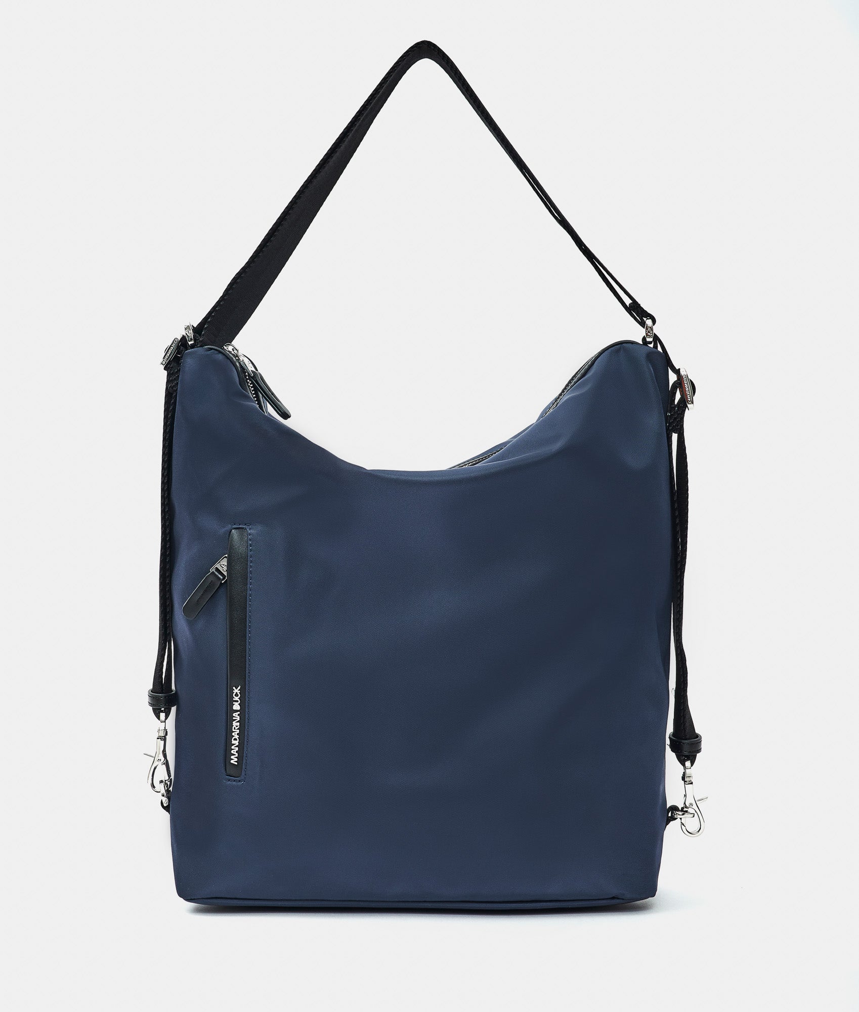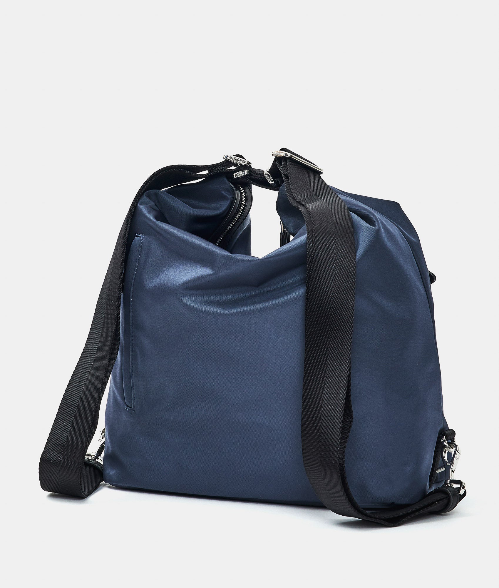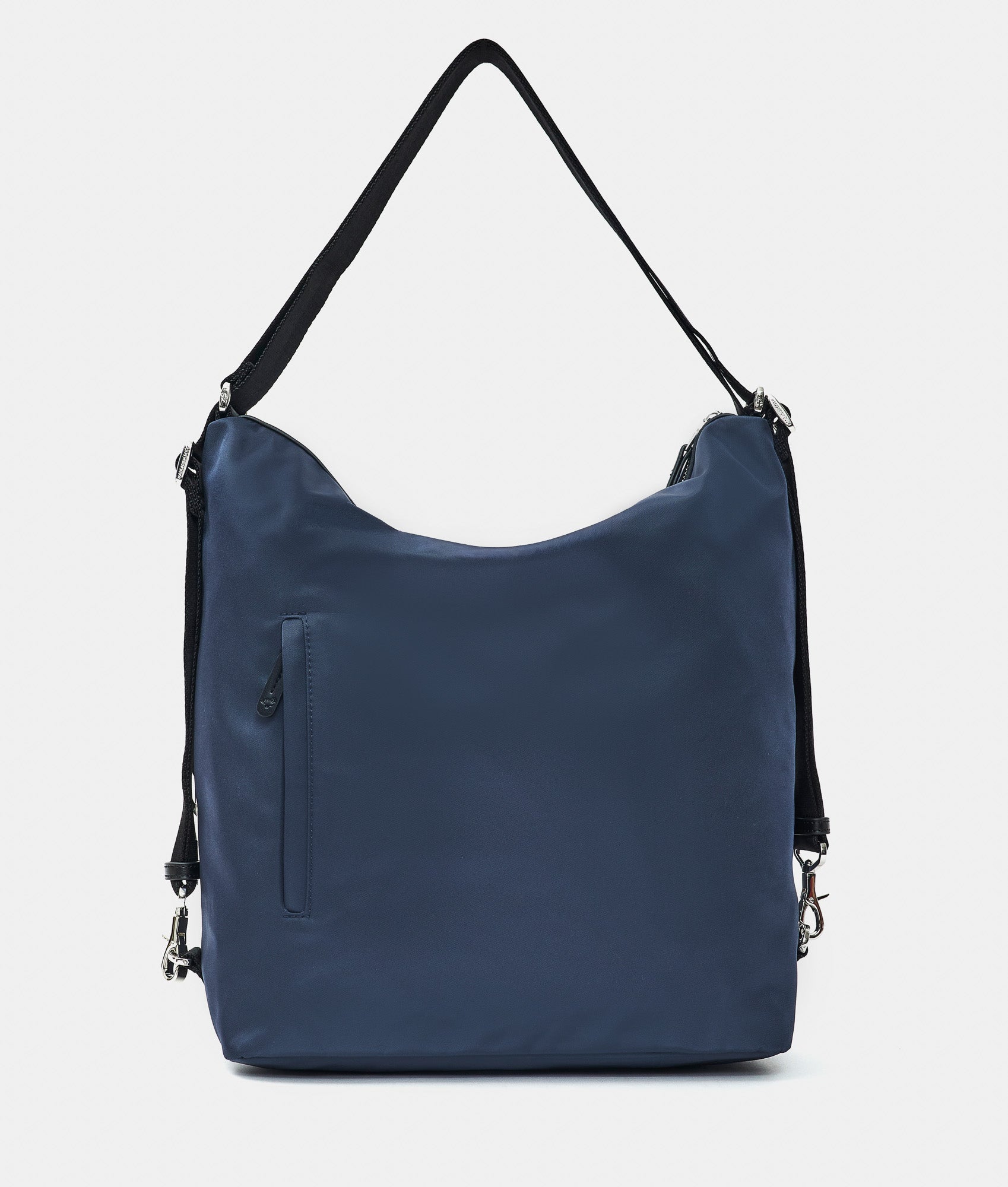 Multi-function bag with fabric zipper flat front pocket. Carrying options: shoulder, backpack, and hand. Smart internal pockets, custom details and adjustable jacquard strap.