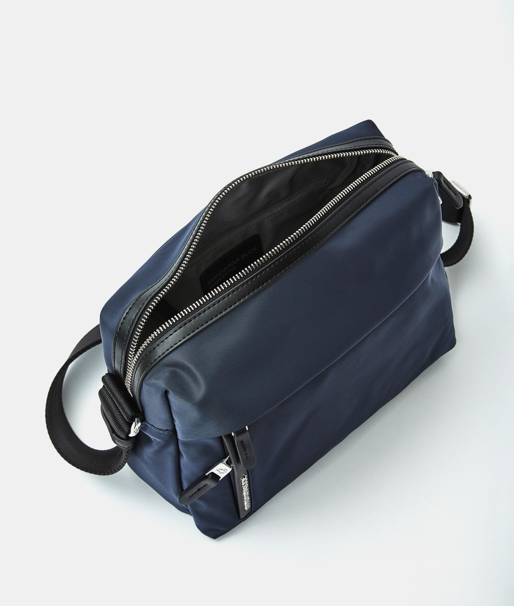 Medium crossbody bag with fabric zipper front pocket. Dual carrying options, smart front and internal pockets, custom details and adjustable jacquard strap.