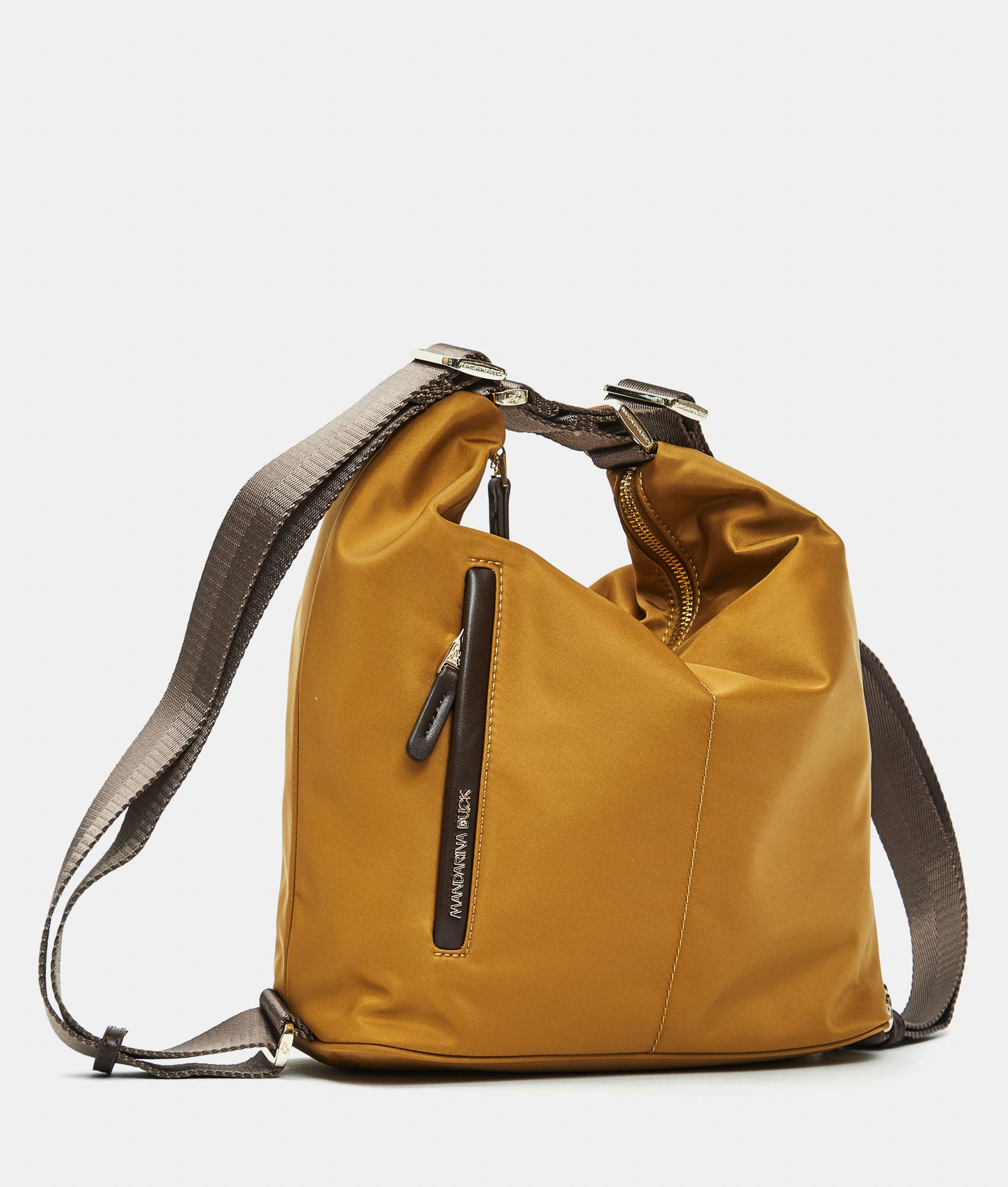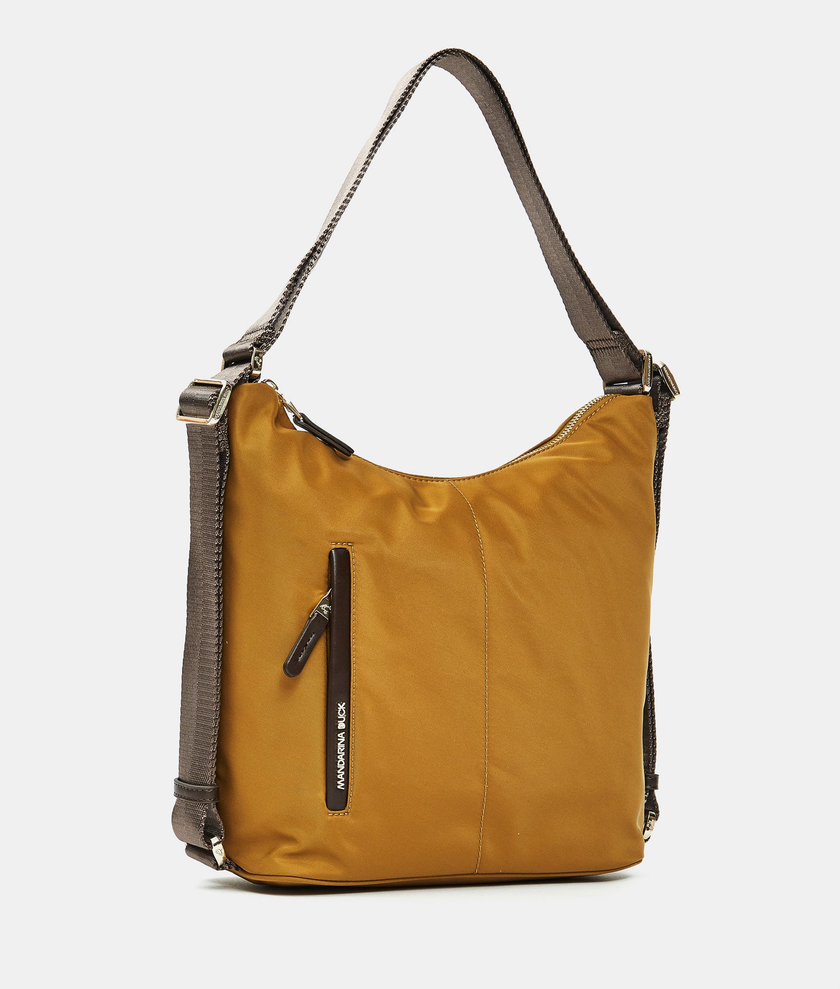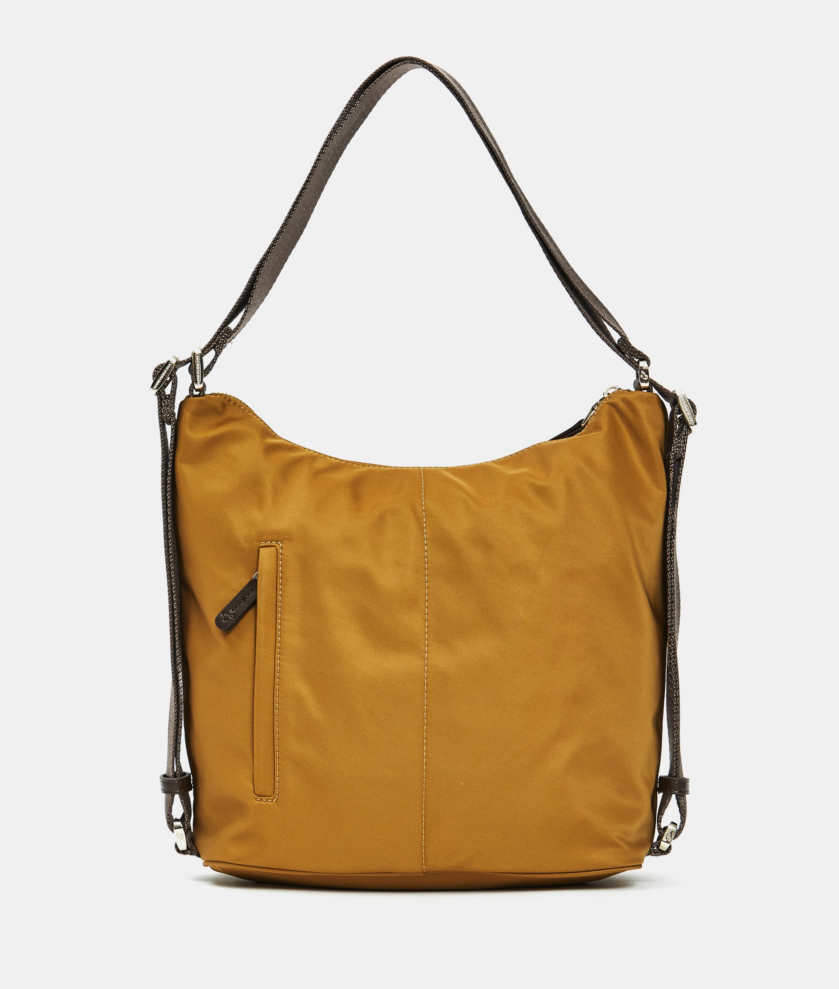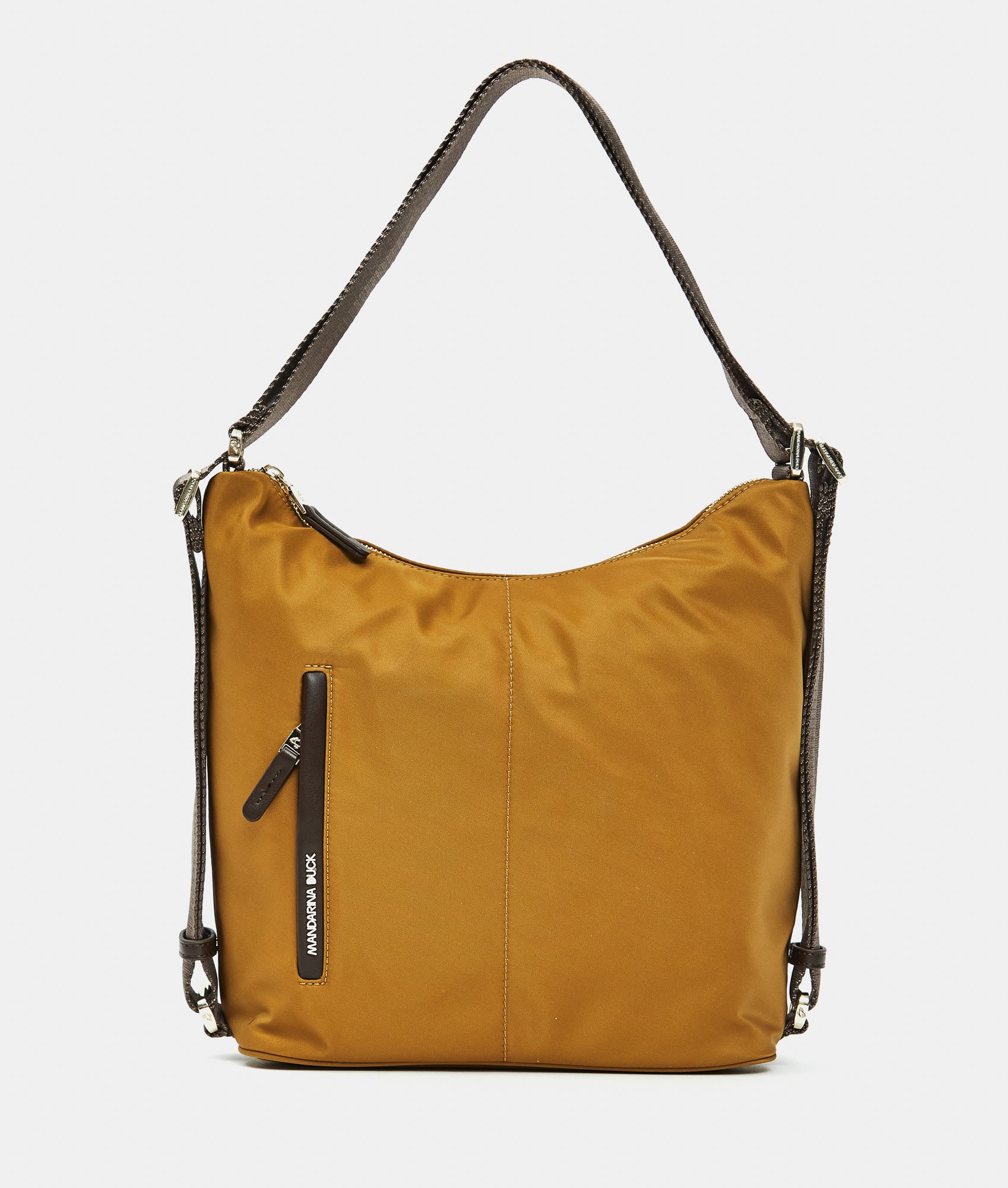 Borsa multifunzione media con tasca frontale piatta con zip in tessuto. Portabilità  a spalla, zaino e a mano, tasche smart interne, dettagli personalizzati e tracolla regolabile in jacquard.