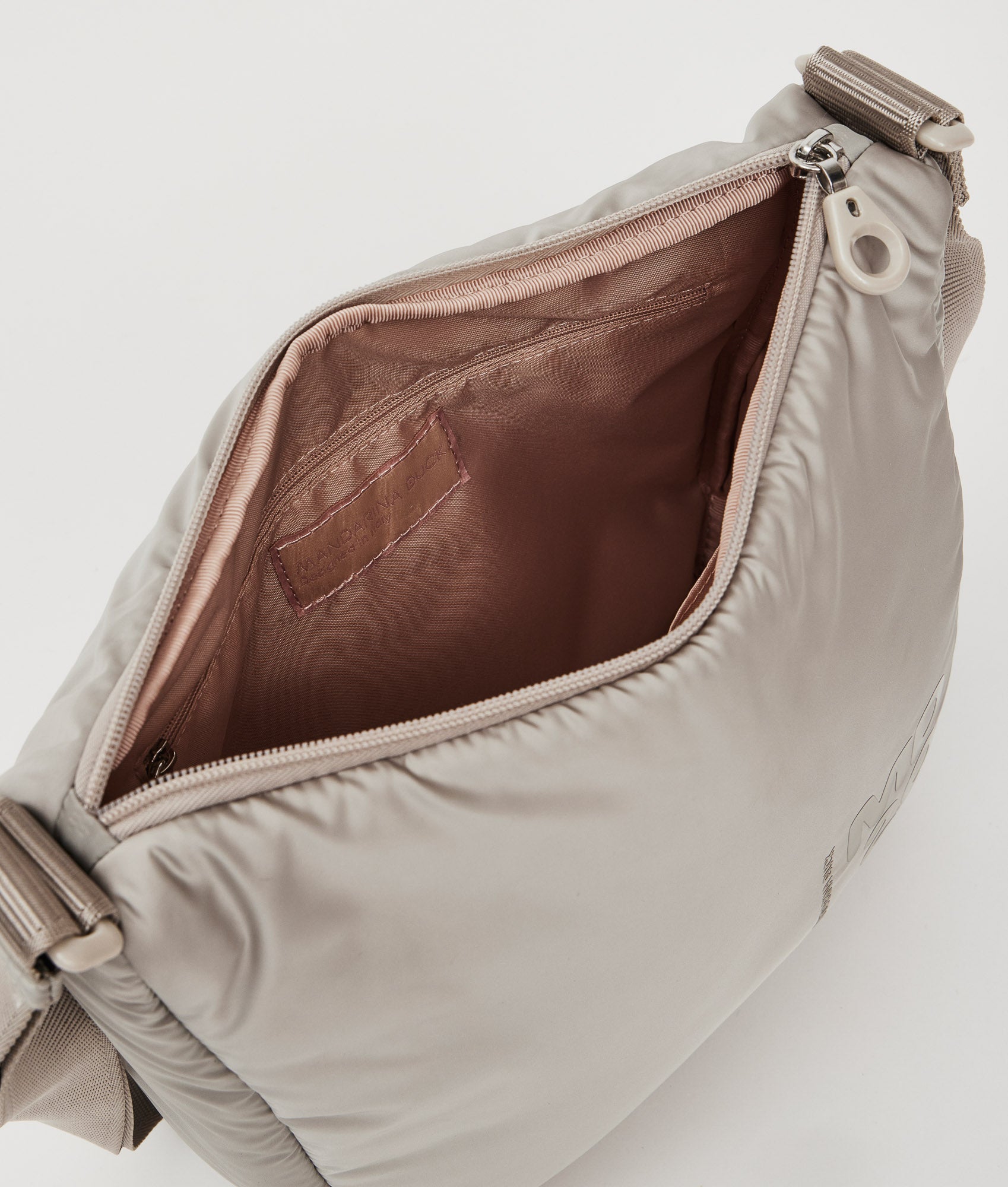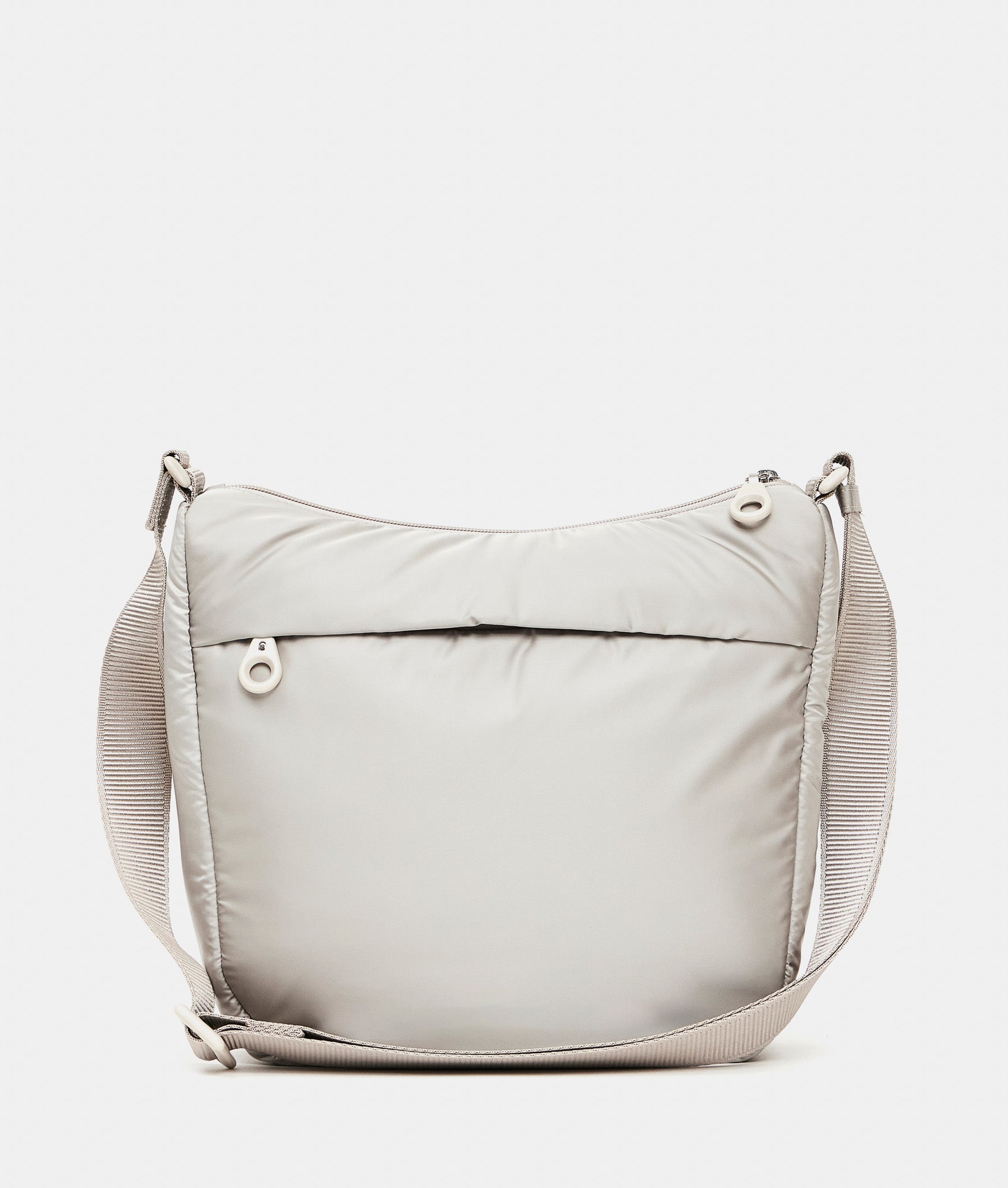 Borsa hobo a tracolla in nylon imbottito. Doppia portabilità, tasche smart interne ed esterne, dettagli personalizzati in resina e tracolla in jacquard regolabile.