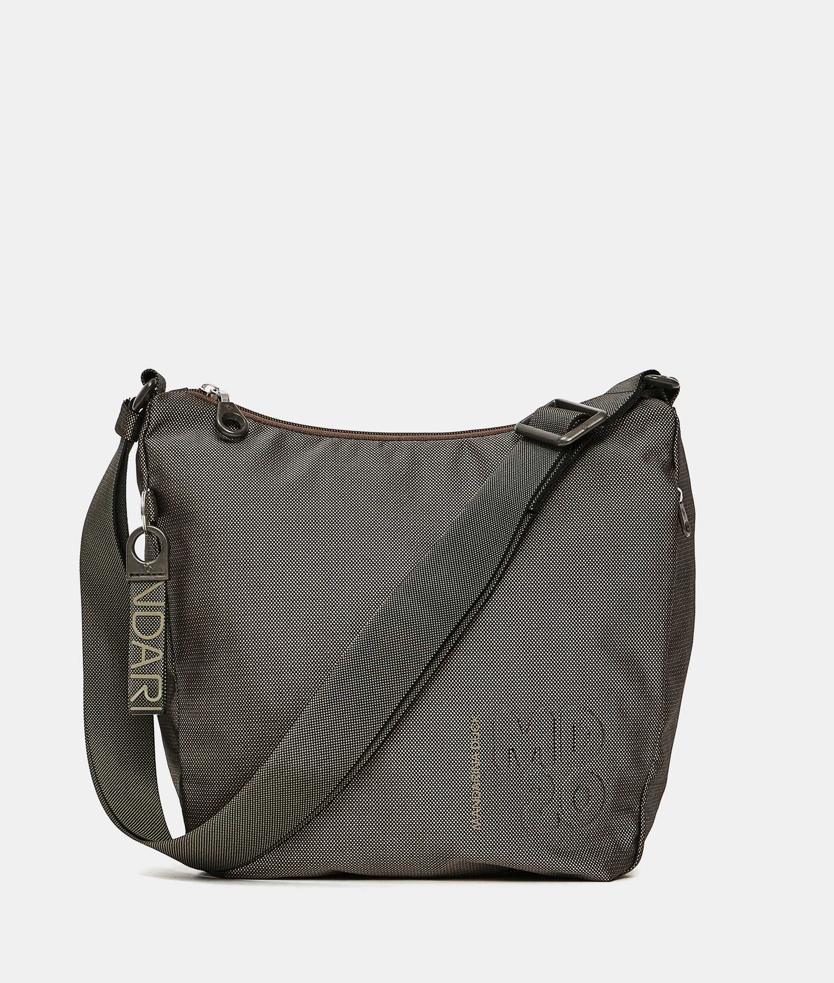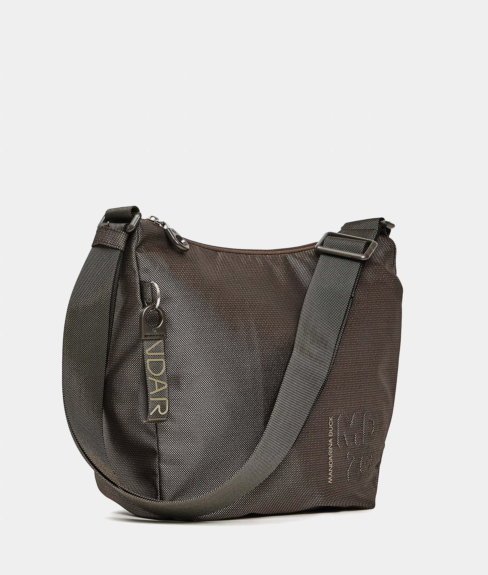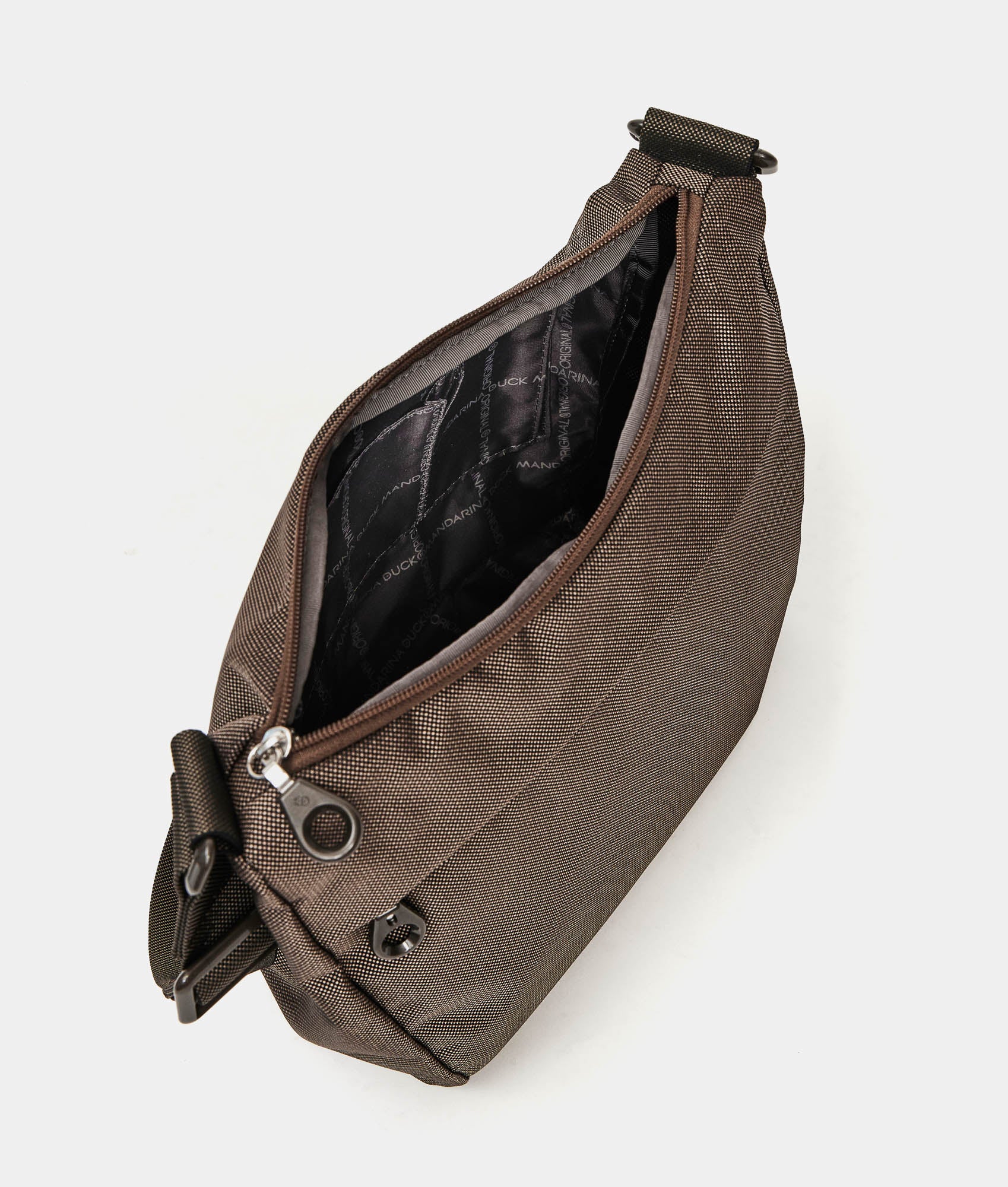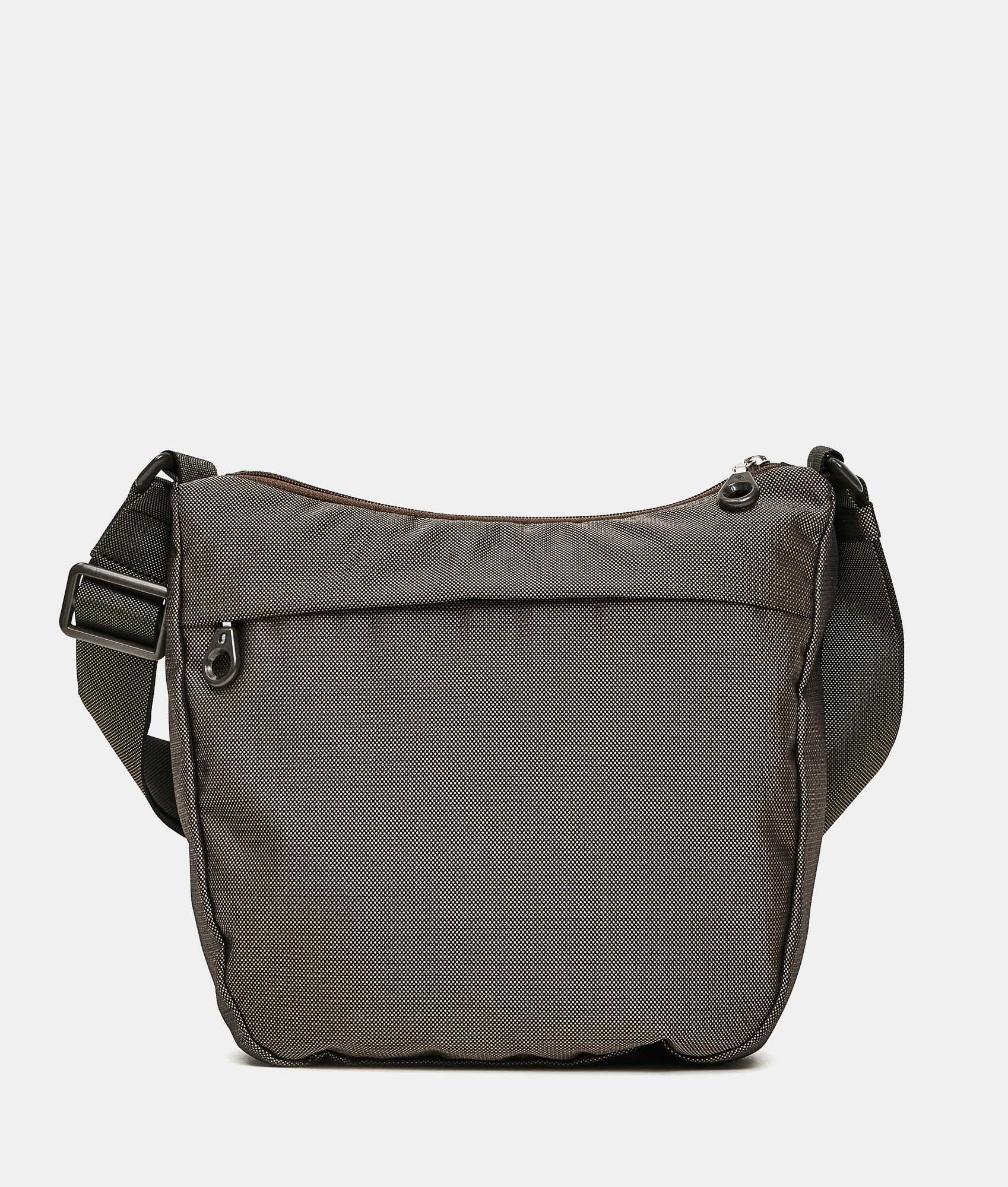 Borsa a tracolla media con tasca frontale piatta e zip laterale in tessuto. Doppia portabilità, tasche smart frontali e interne, dettagli personalizzati e tracolla regolabile in jacquard.
