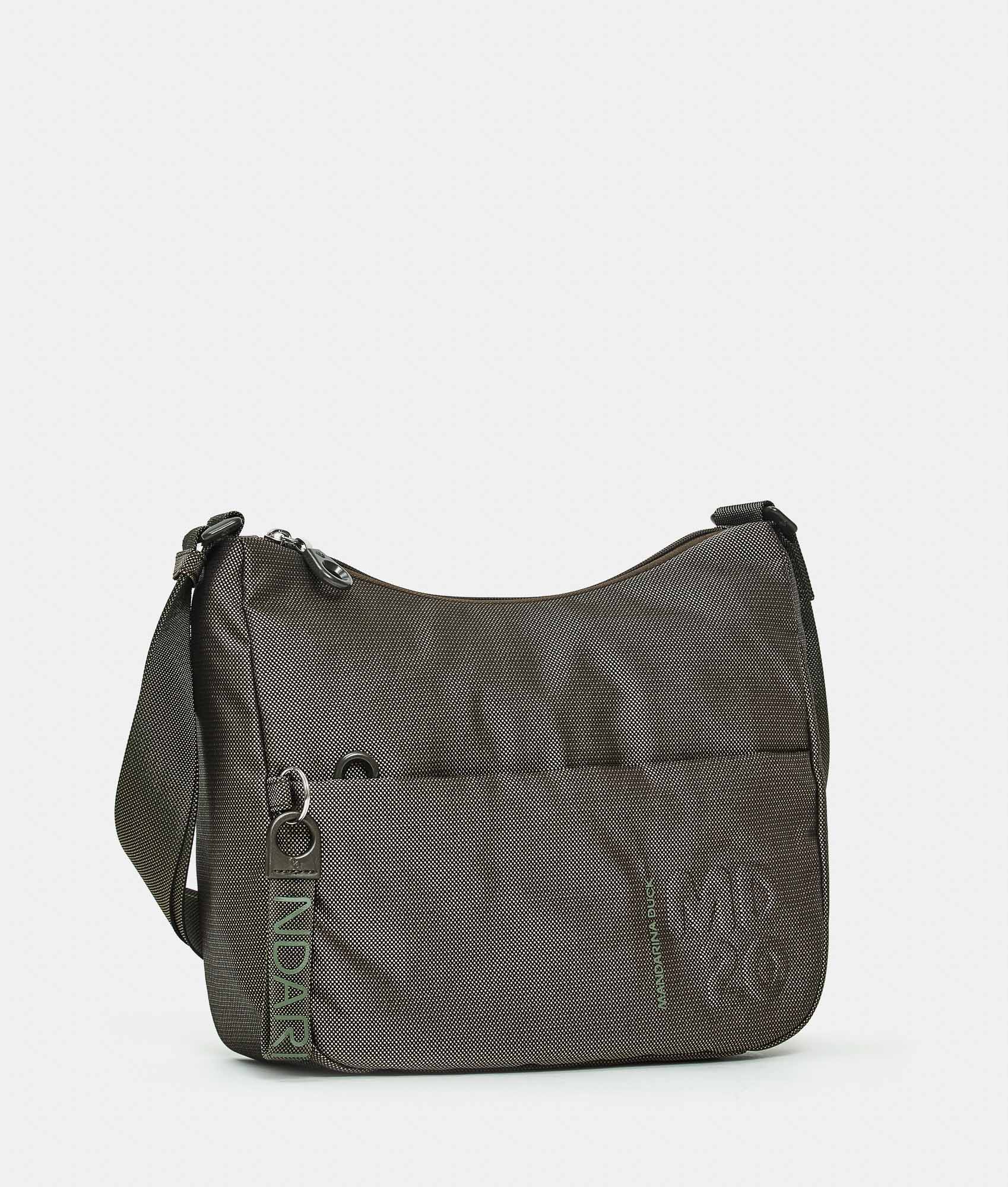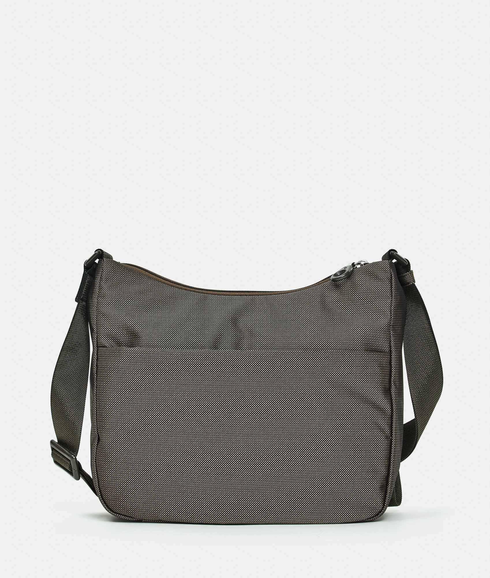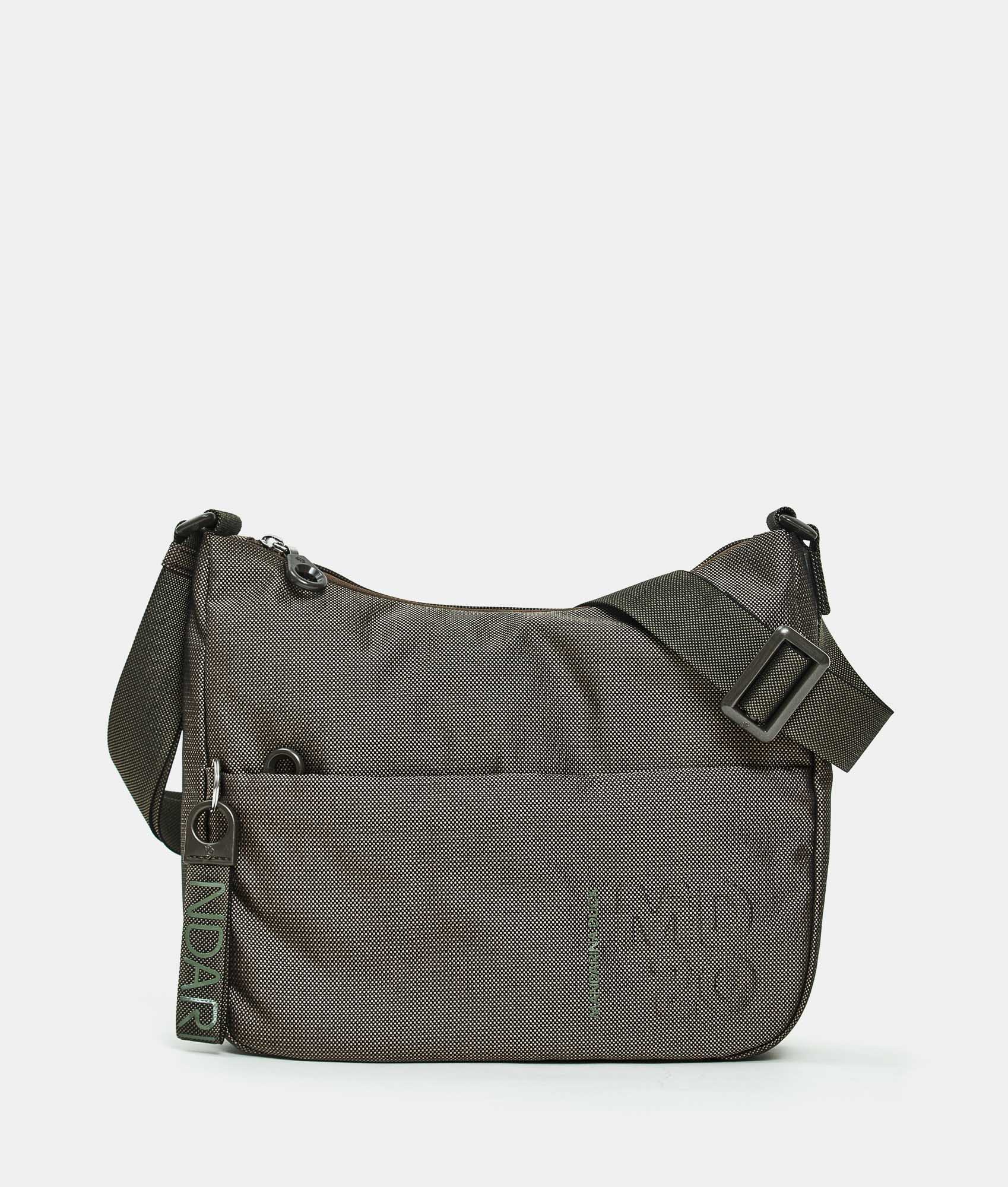 Borsa a tracolla media con tasca frontale piatta e zip in tessuto. Doppia portabilità, tasche smart frontali e interne, dettagli personalizzati e tracolla regolabile in jacquard.