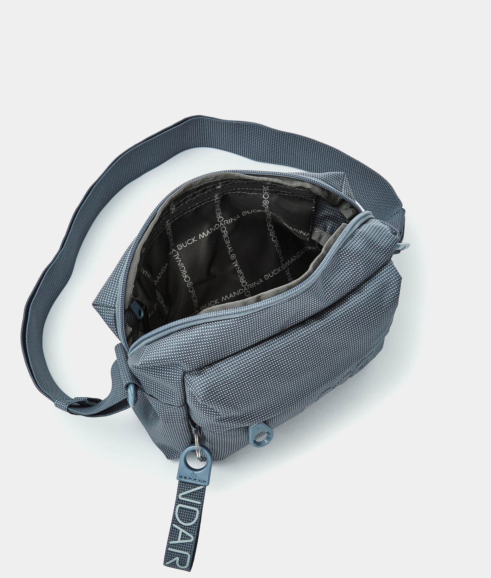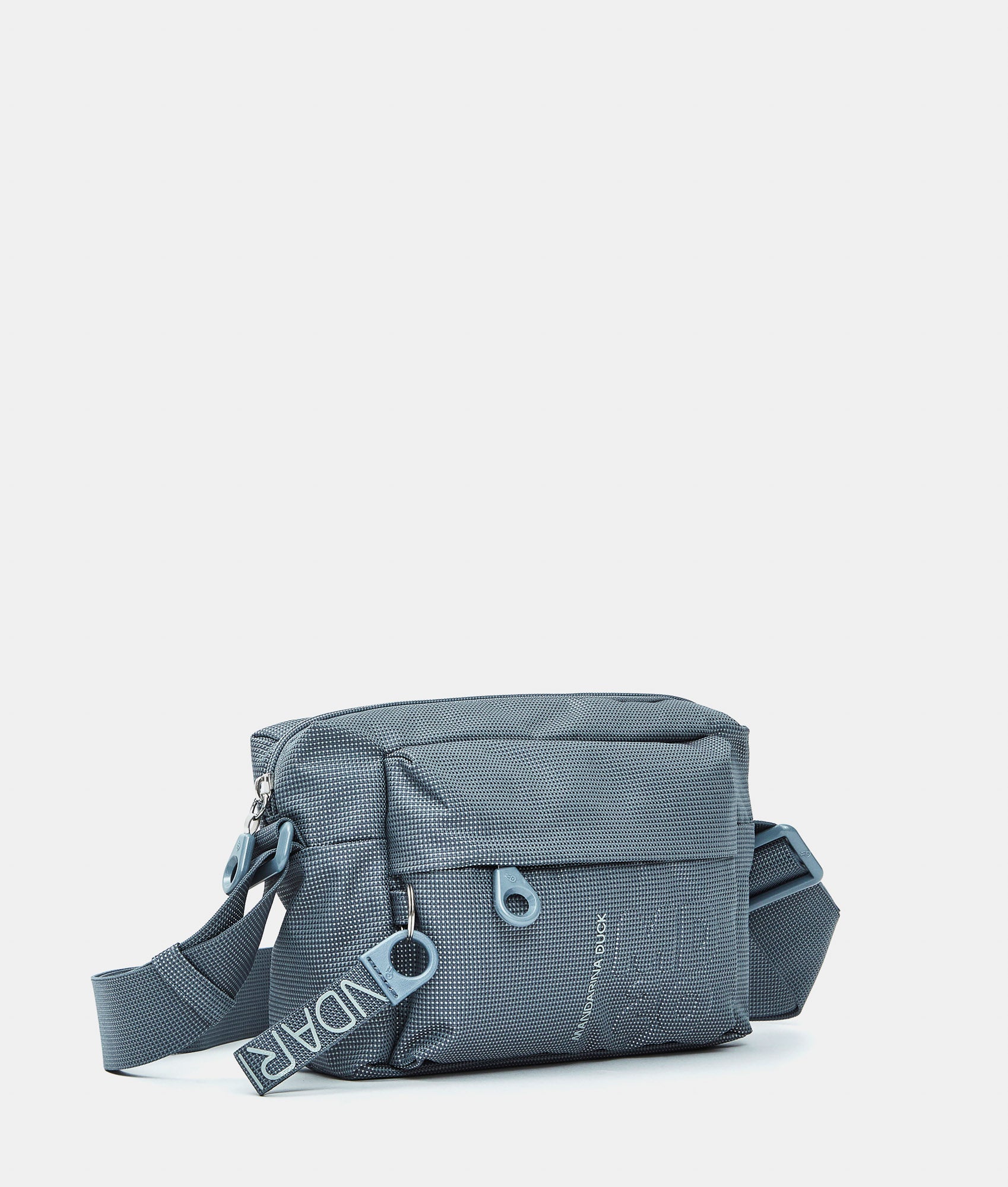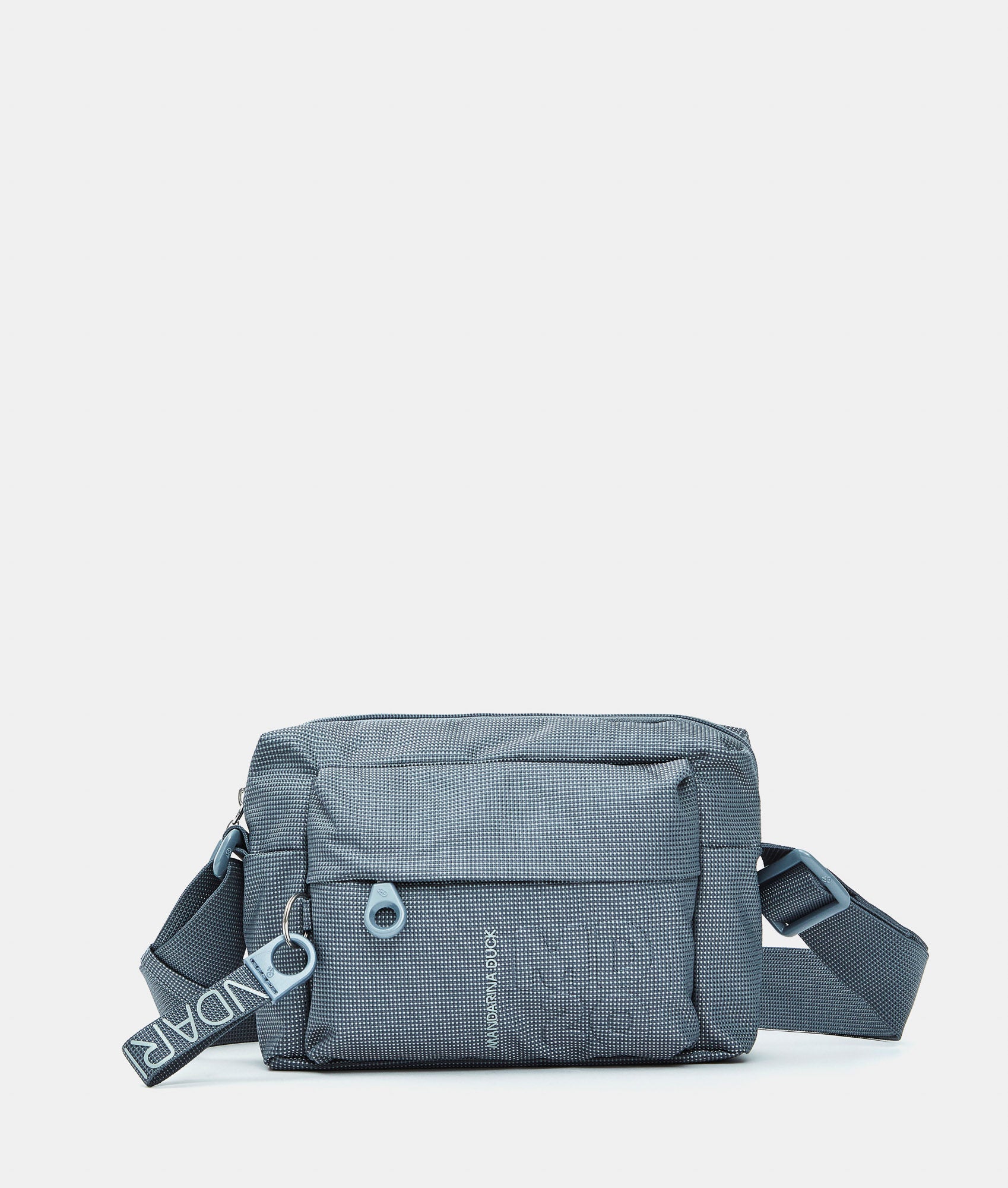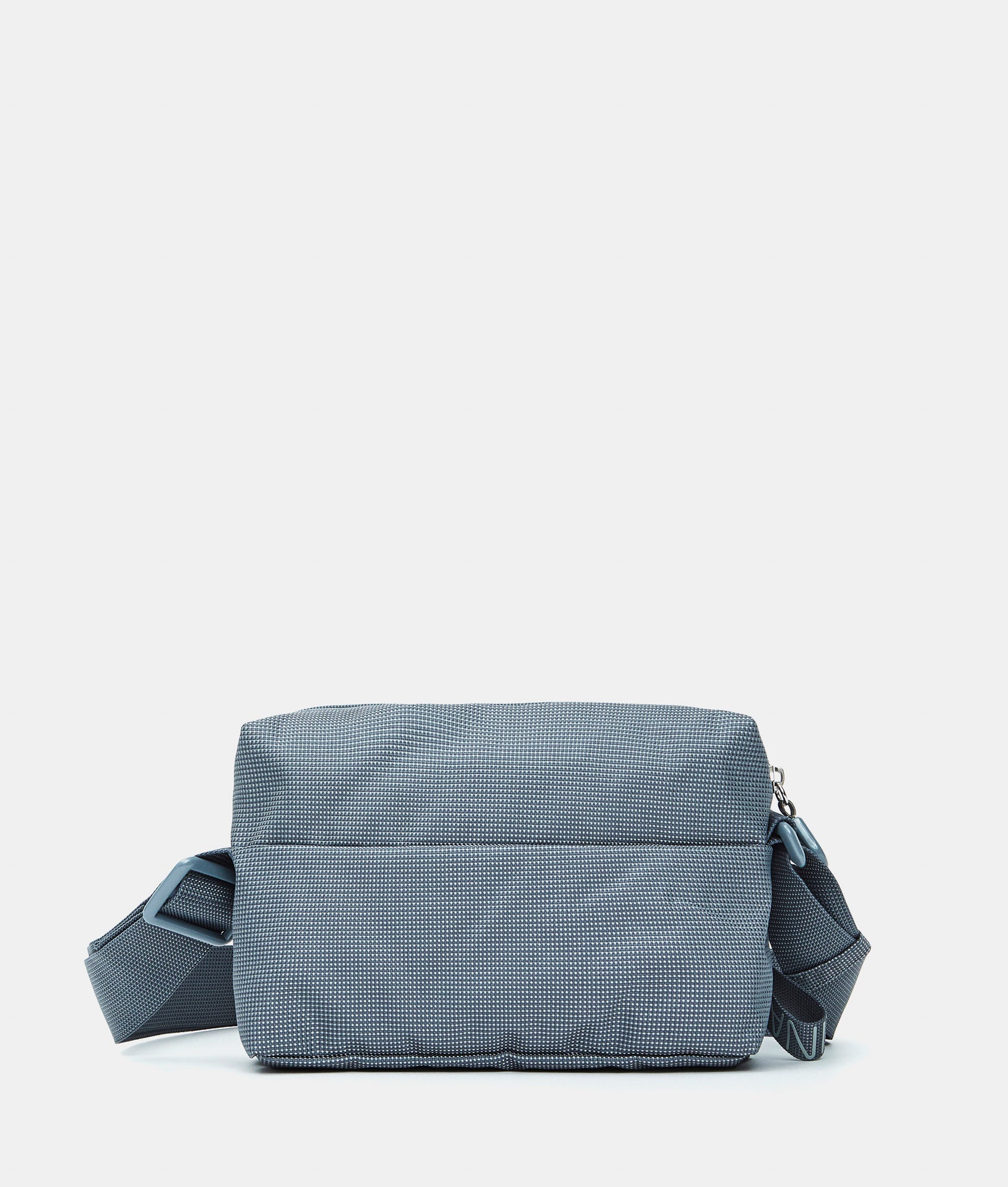 Borsa a tracolla piccola con tasca frontale in tessuto. Doppia portabilità, tasche smart frontali e interne, dettagli personalizzati e tracolla regolabile in jacquard.