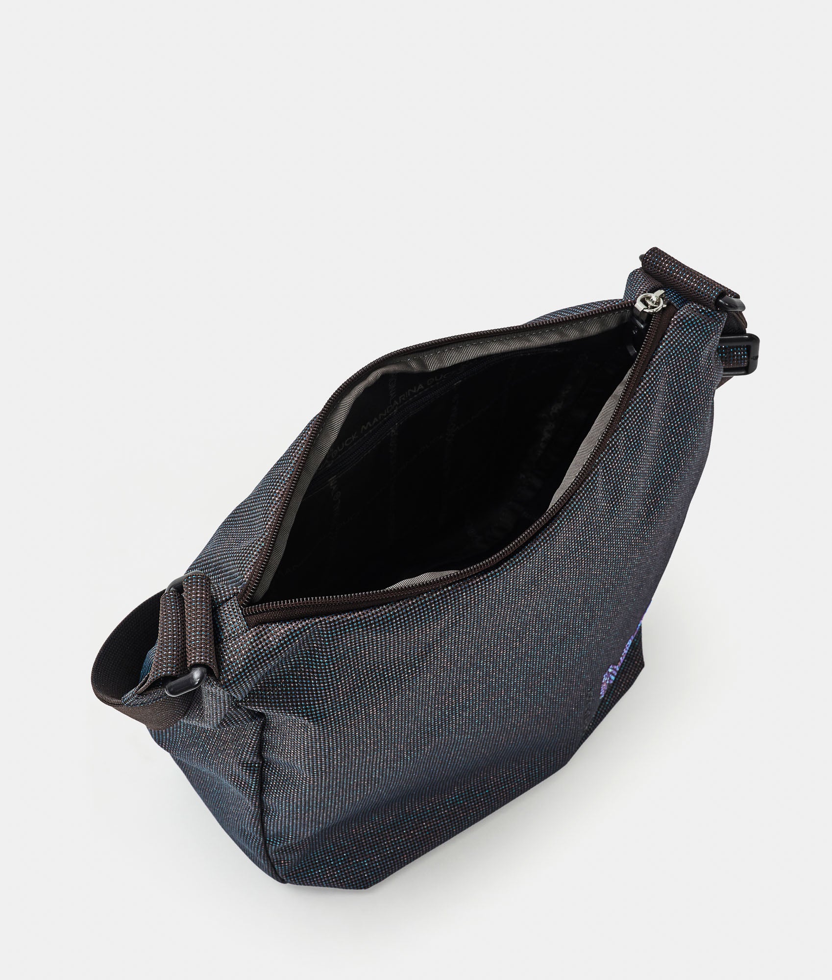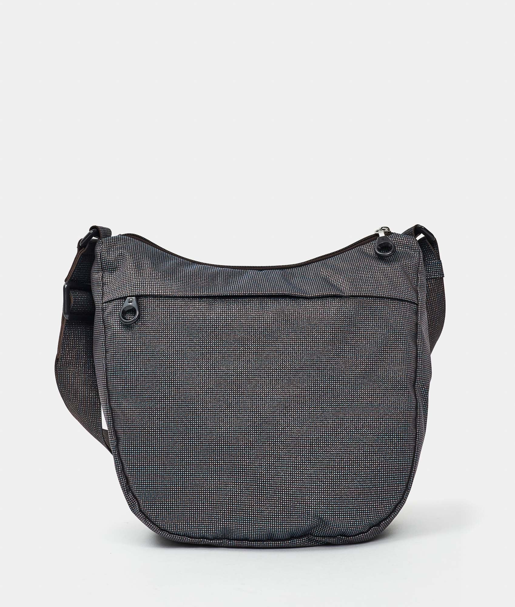 Borsa a tracolla media con tasca frontale piatta e zip laterale in tessuto. Doppia portabilità, tasche smart frontali e interne, dettagli personalizzati e tracolla regolabile in jacquard.