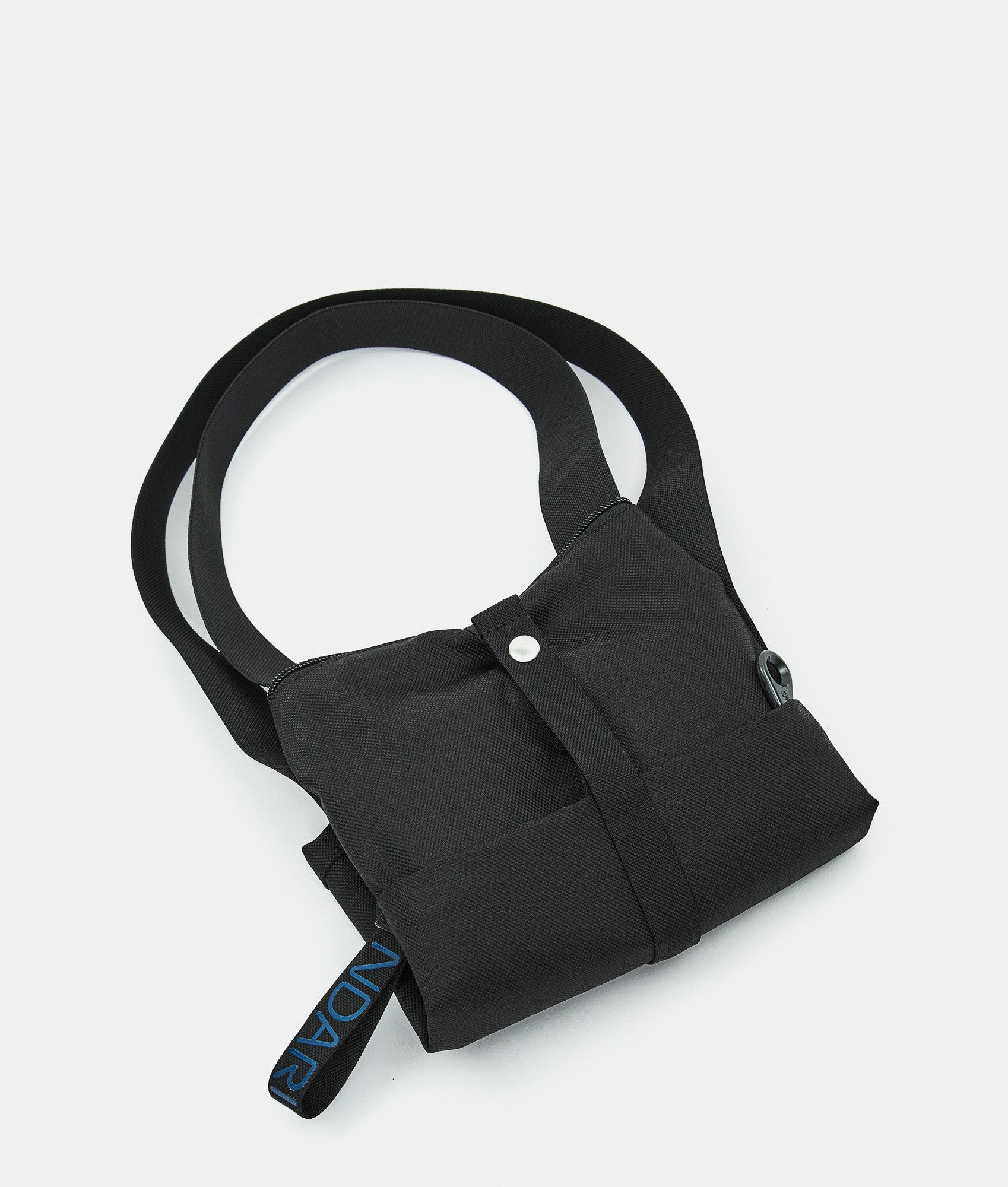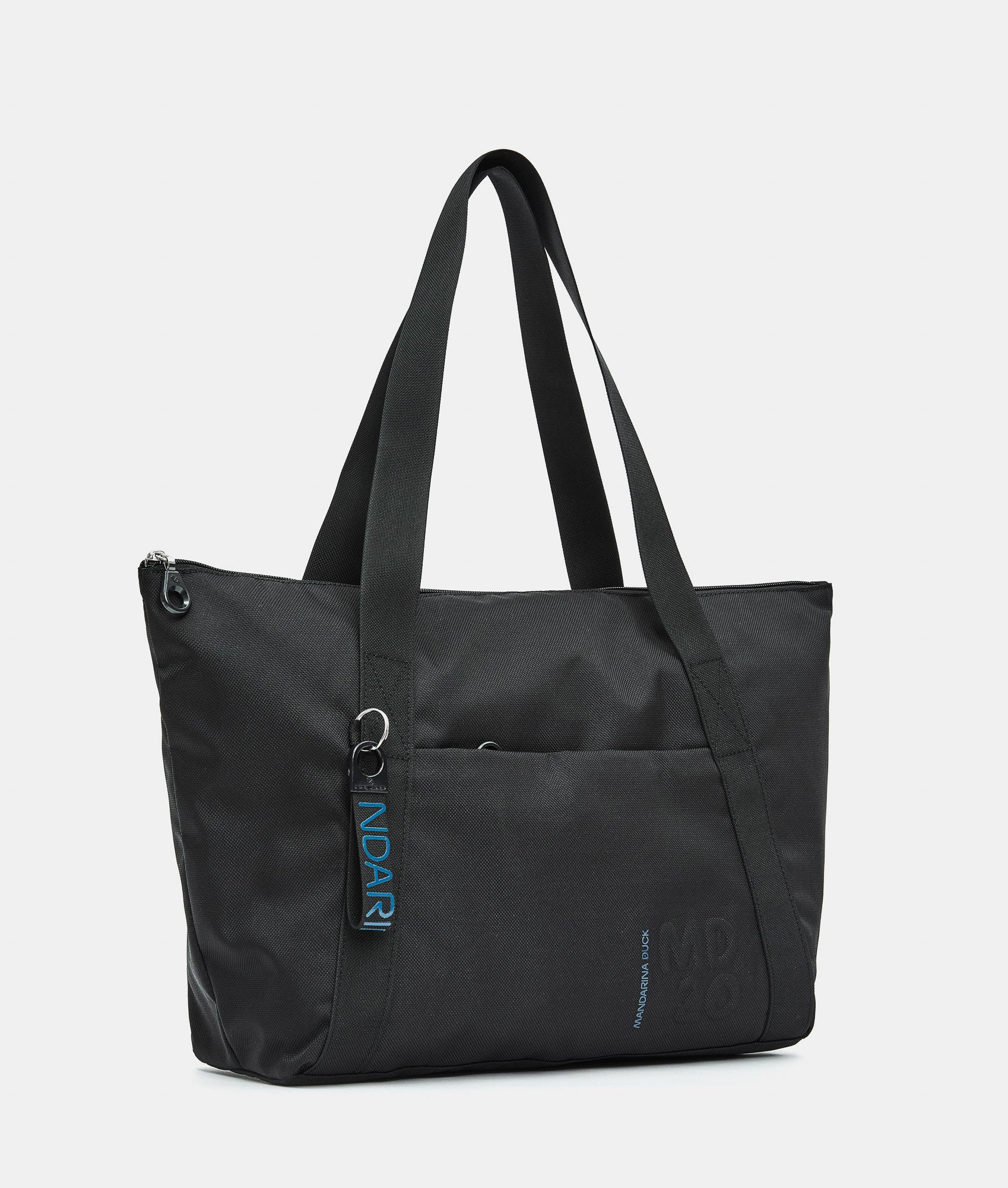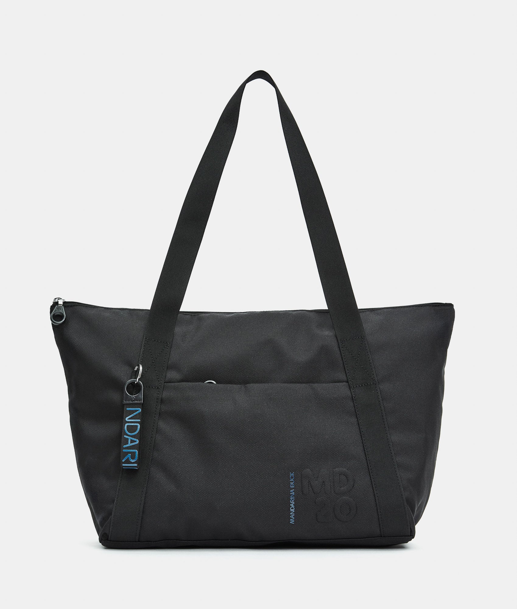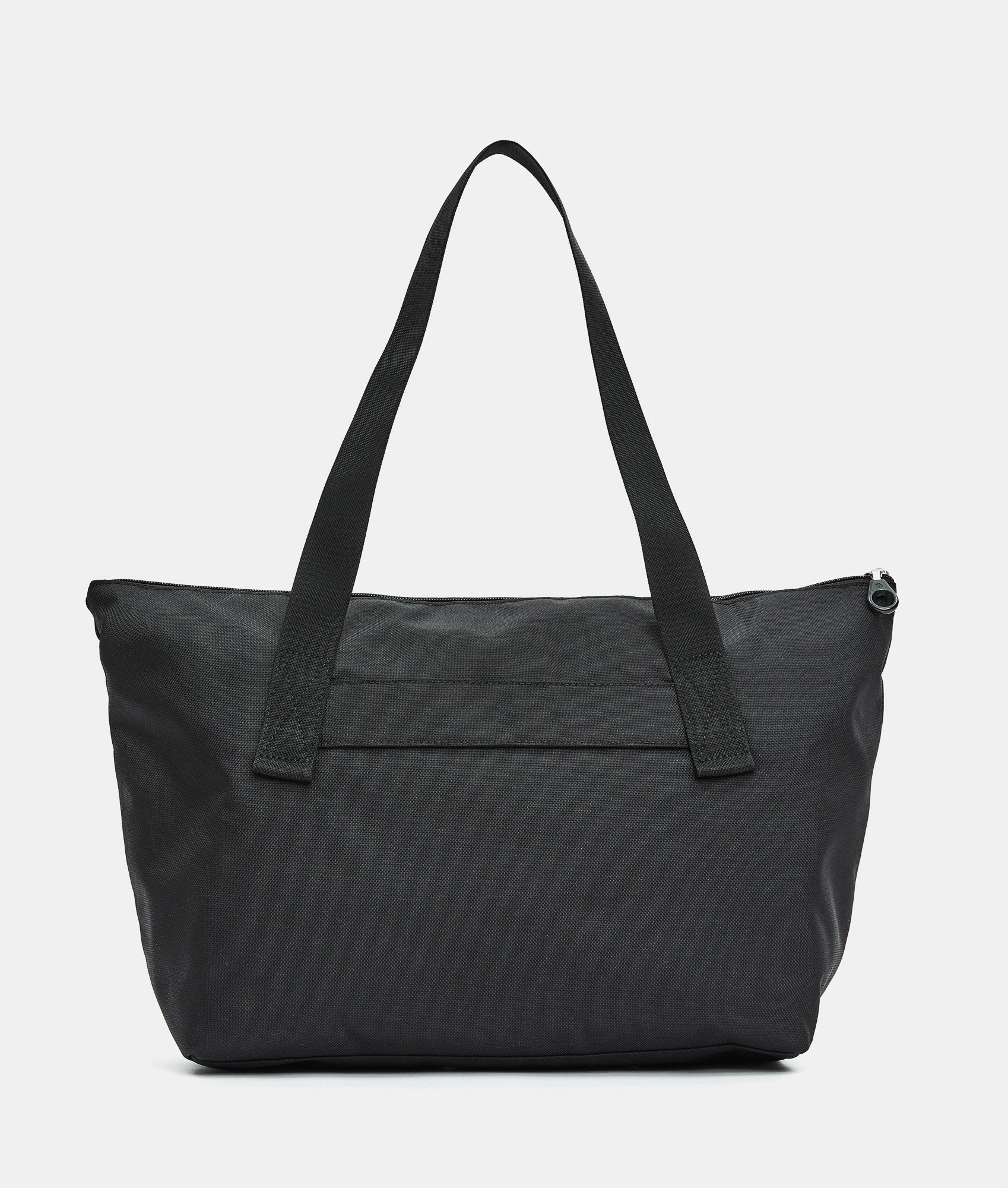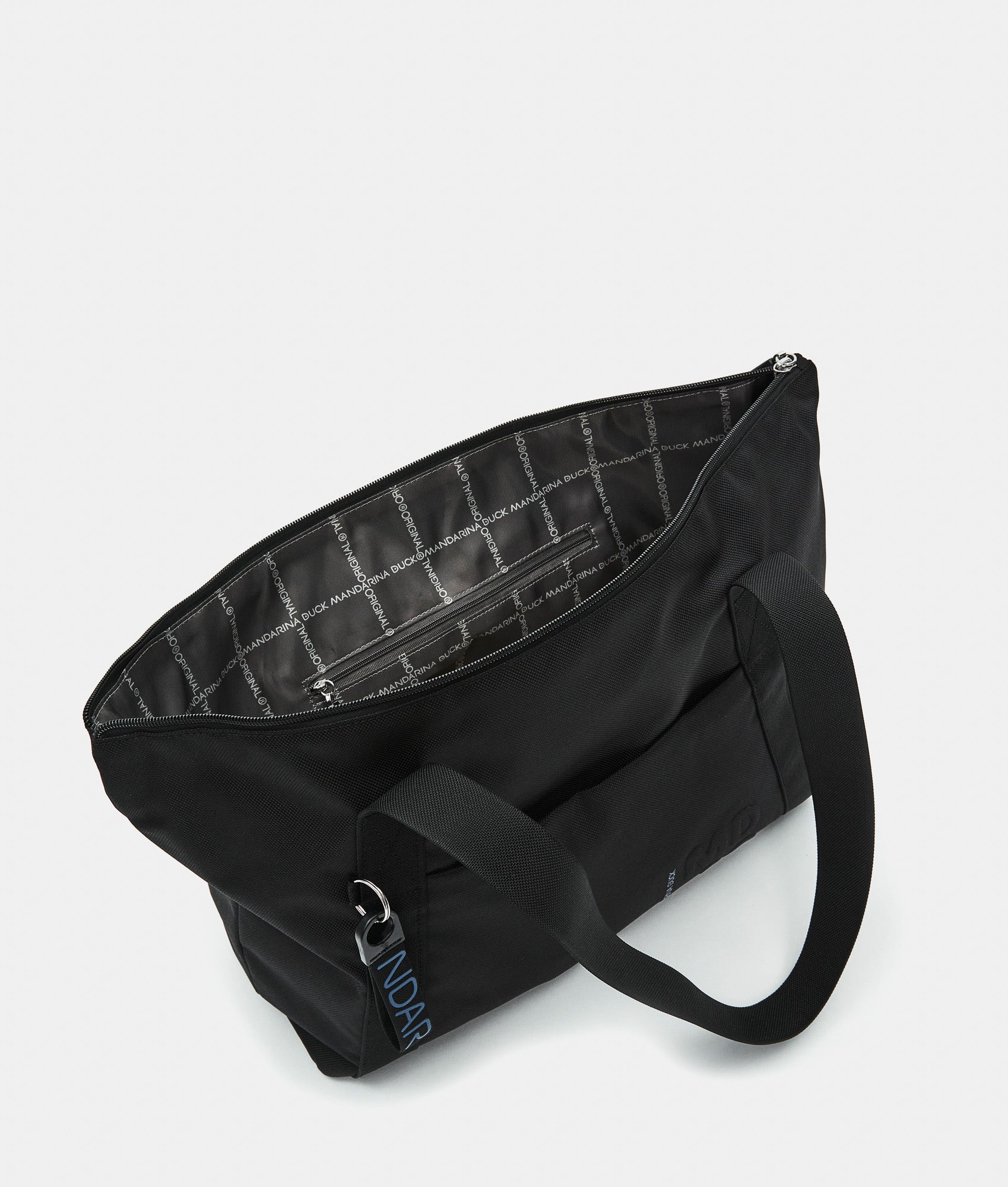 Shopper pieghevole con tasca frontale con zip in tessuto. Tasche intelligenti, dettagli personalizzati, nastro interno per ripiegarla e cinghia posteriore per inserimento nel trolley.