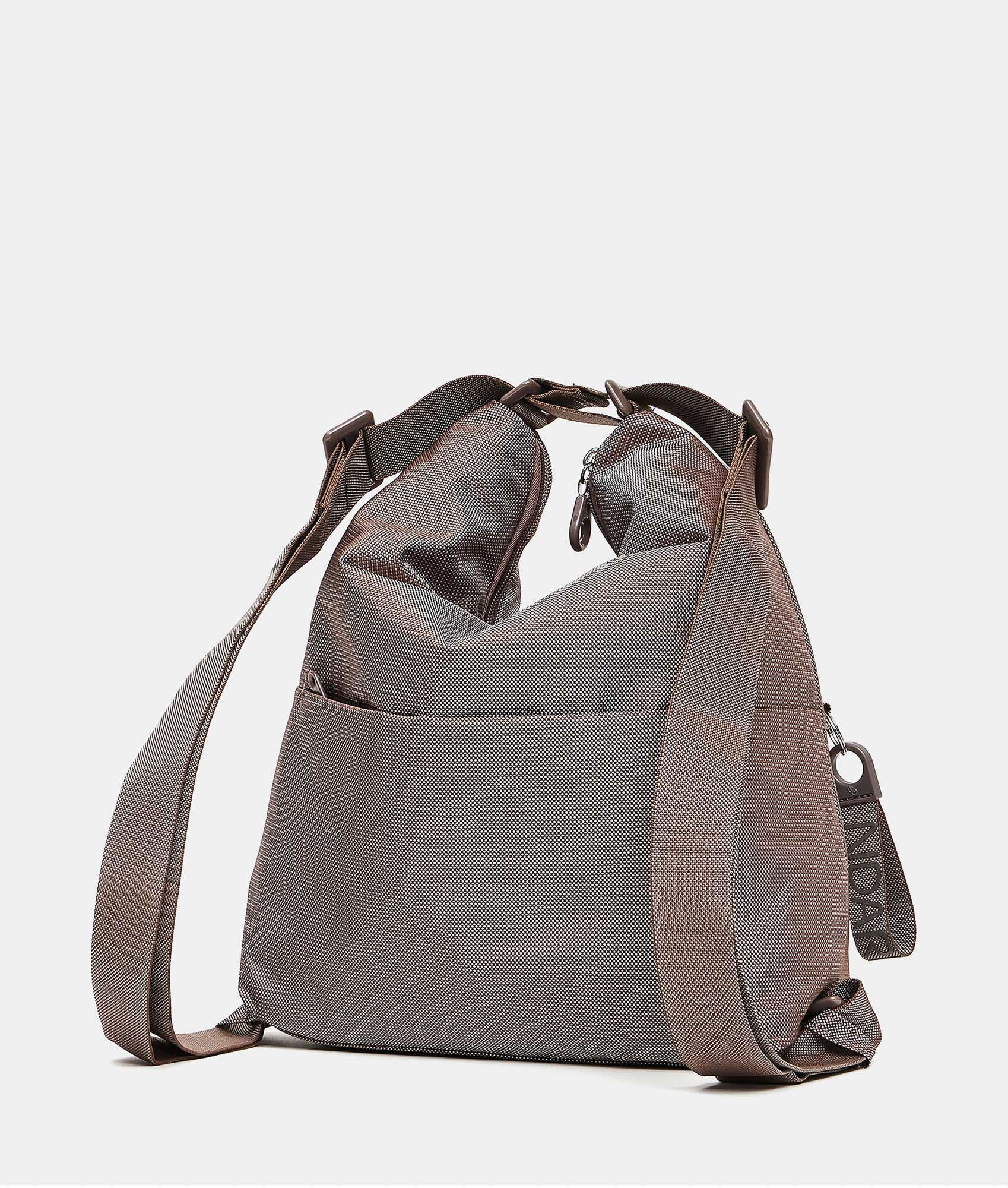 Borsa a tracolla multifunzione piccola con tasca esterna frontale in tessuto. Portabilità  a spalla, zaino e a mano, tasche smart interne, dettagli personalizzati e tracolla regolabile in jacquard.