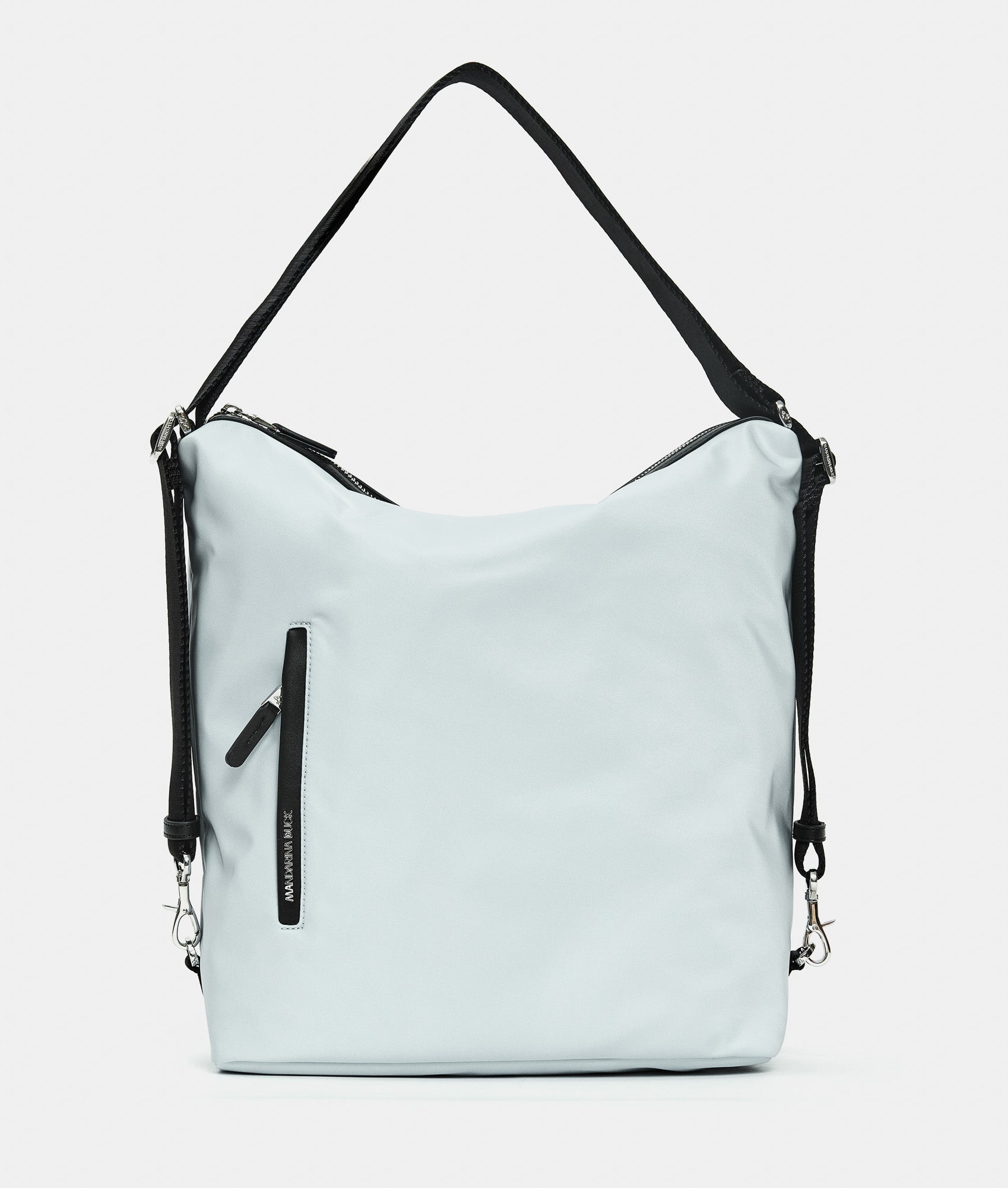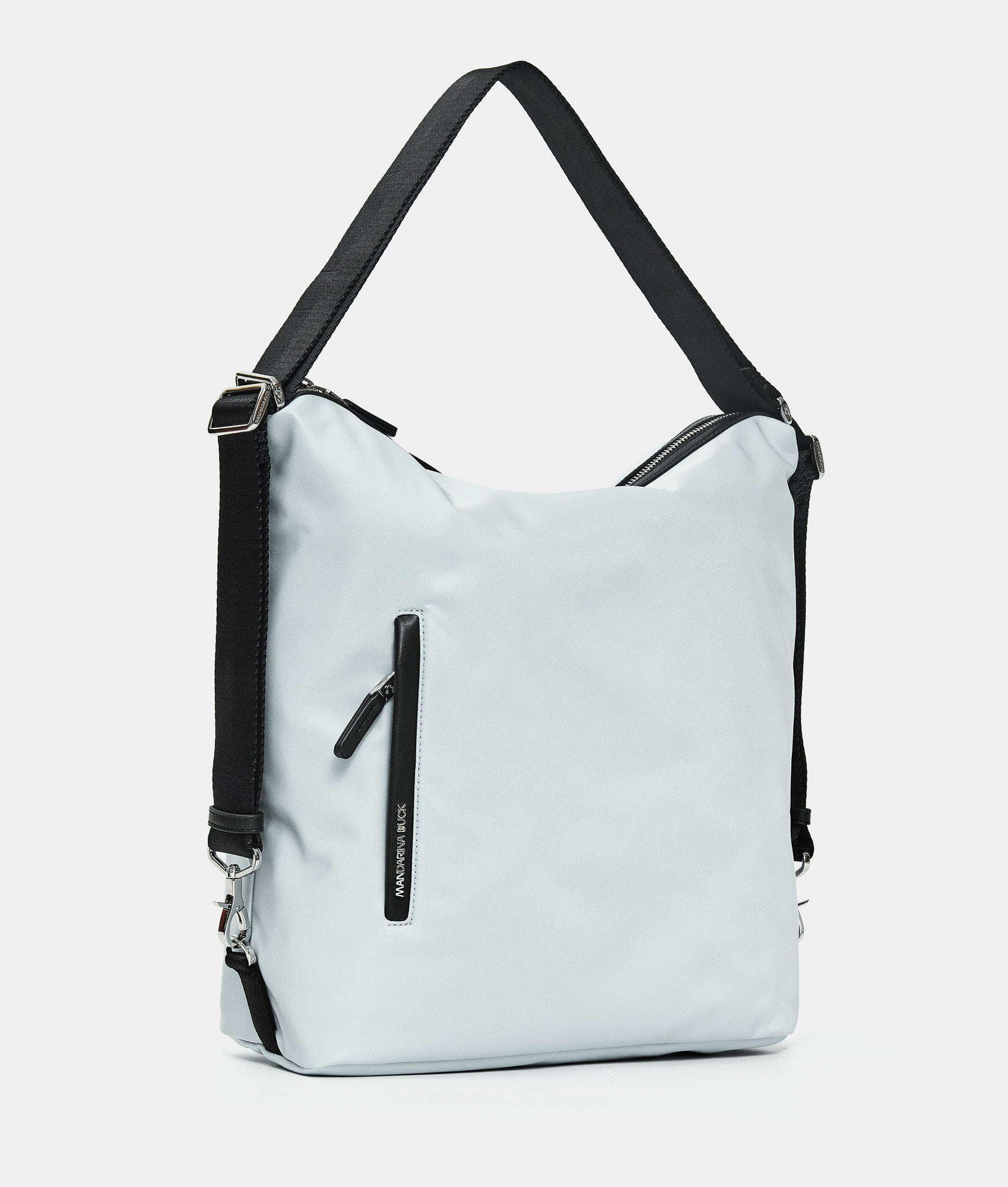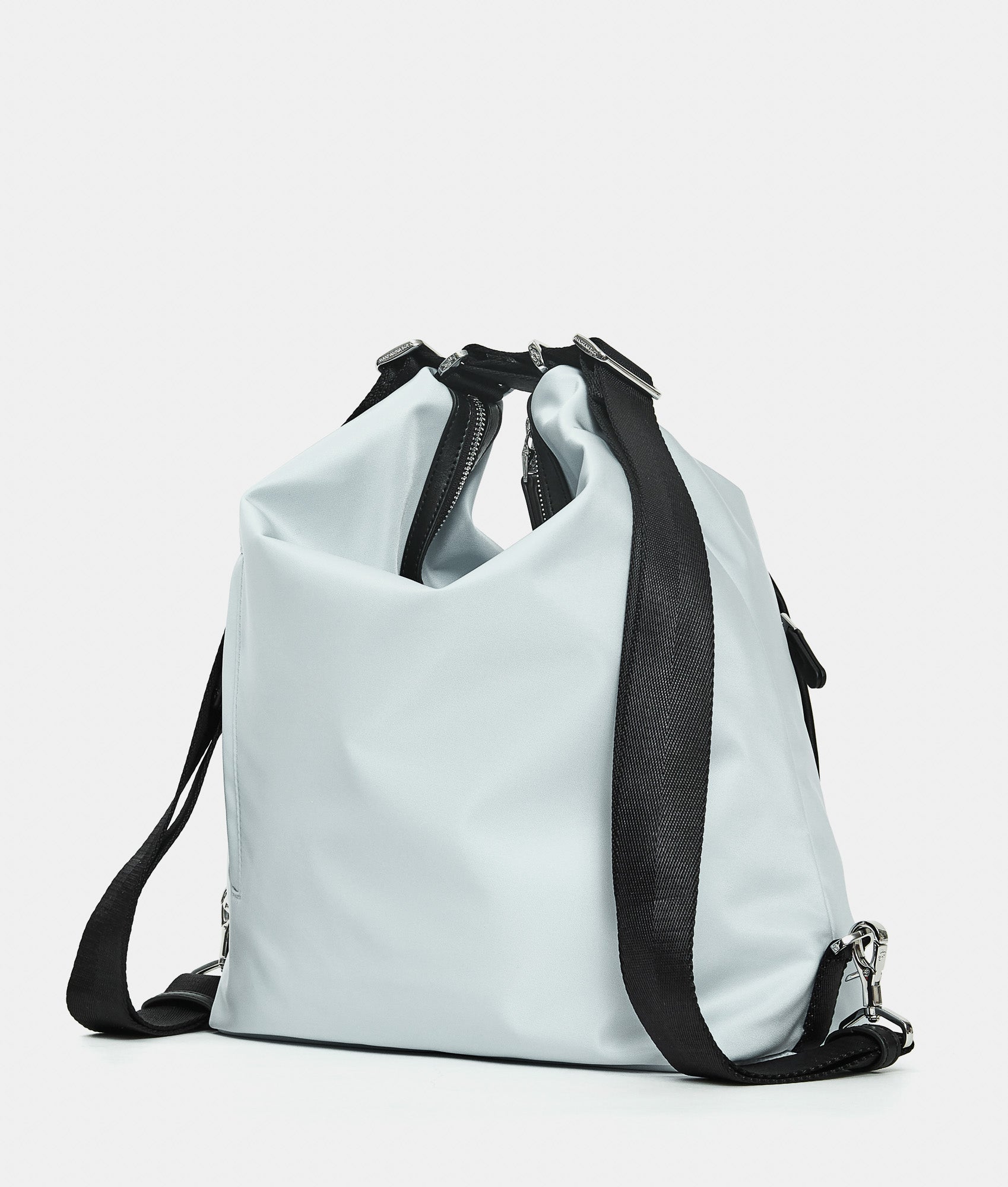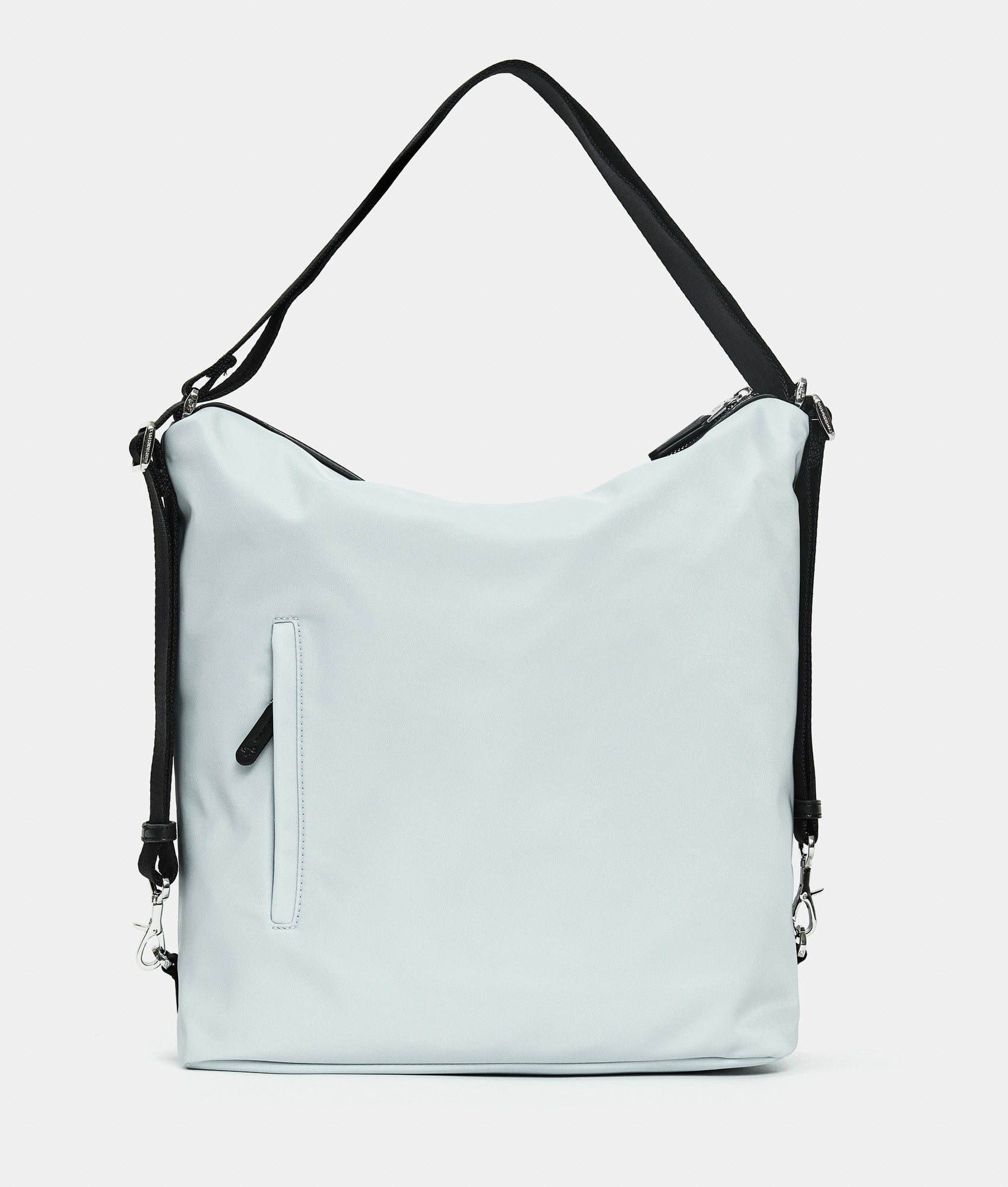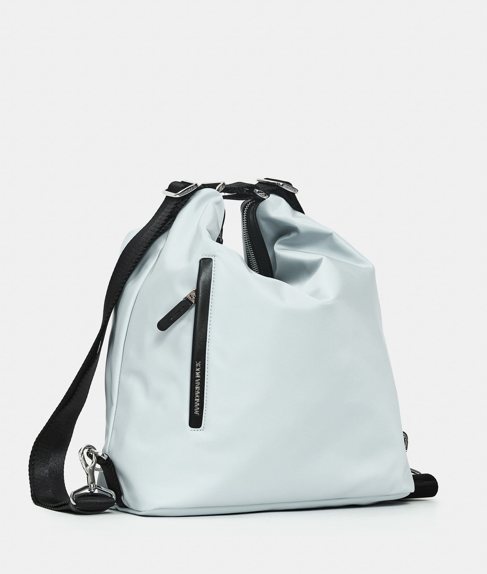 Borsa multifunzione con tasca frontale piatta con zip in tessuto. Portabilità  a spalla, zaino e a mano, tasche smart interne, dettagli personalizzati e tracolla regolabile in jacquard.