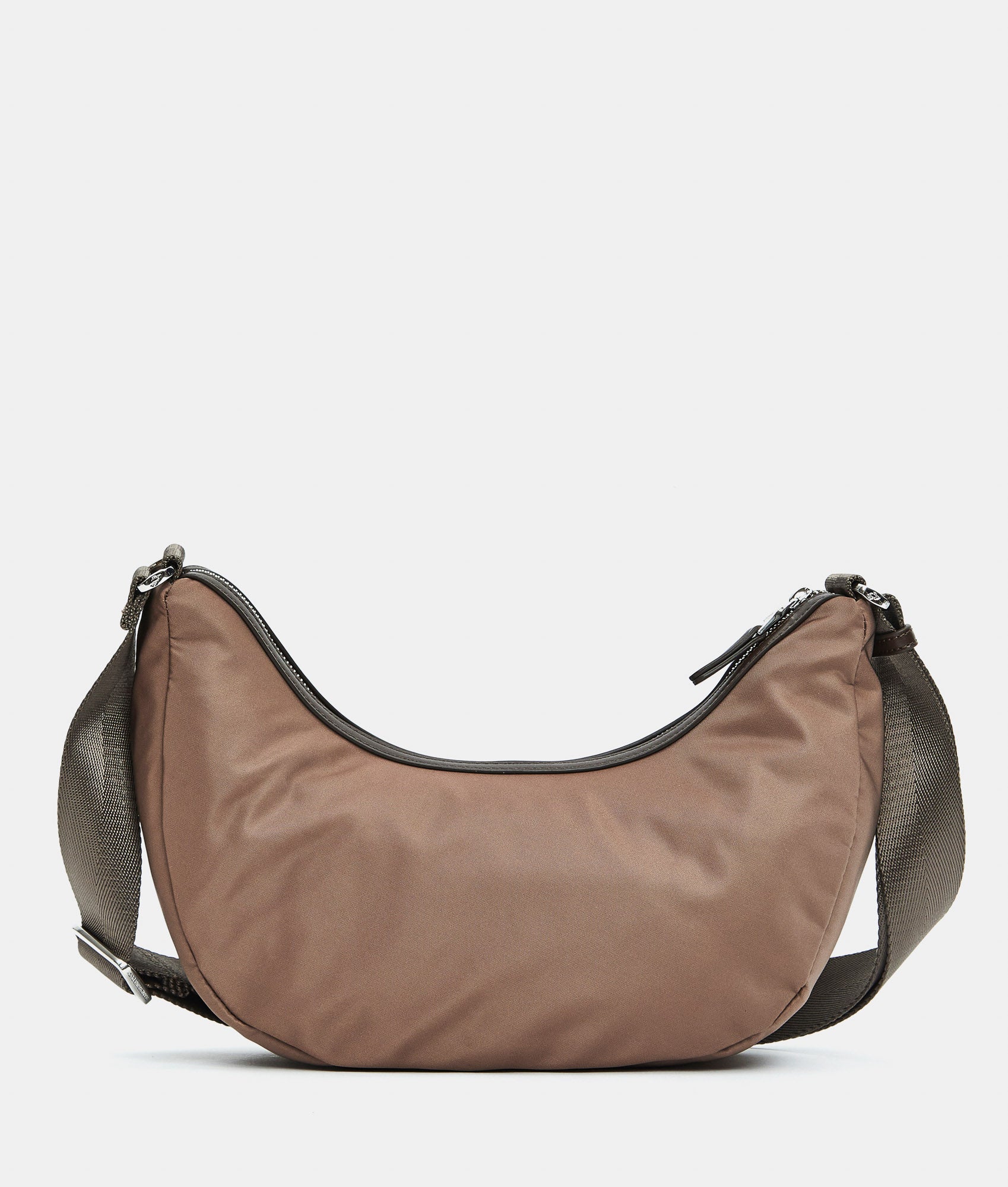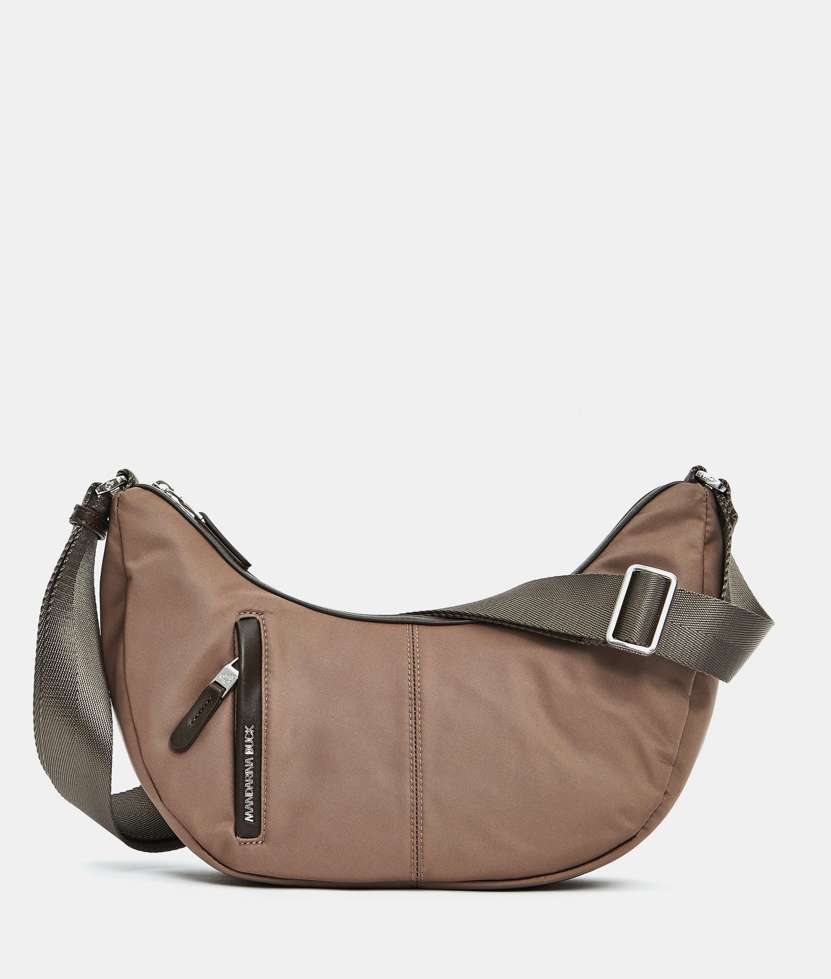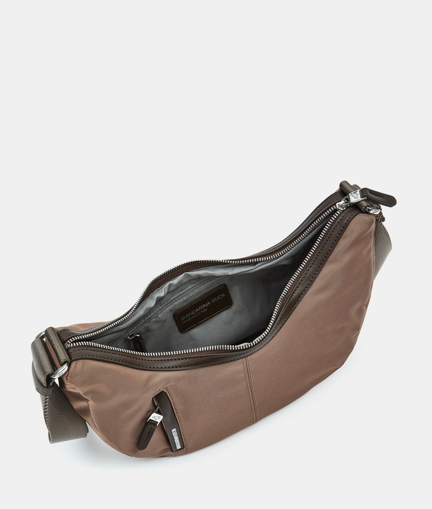 Borsa hobo a tracolla piccola con tasca frontale piatta con zip in tessuto. Doppia portabilità, dettagli personalizzati e tracolla e regolabile in jacquard.