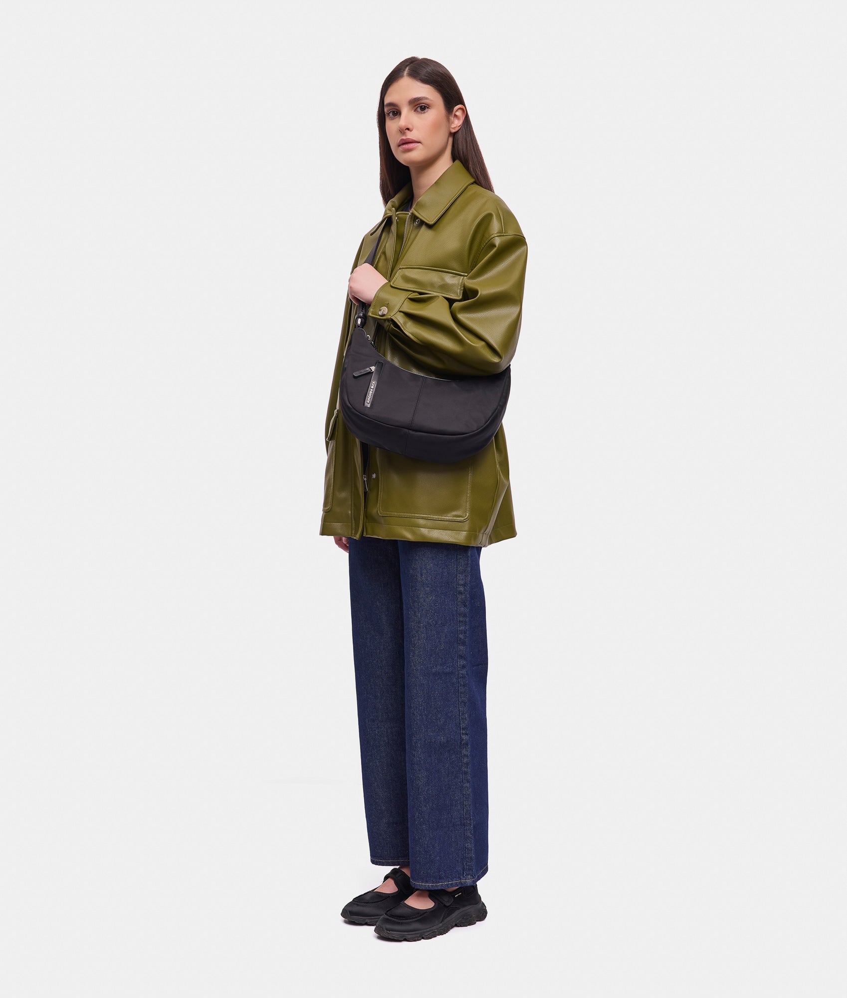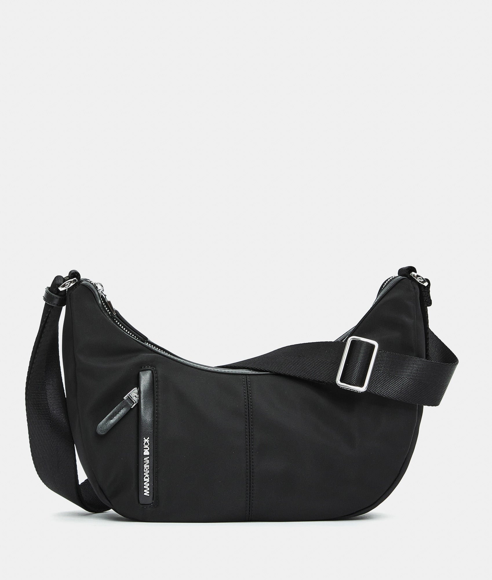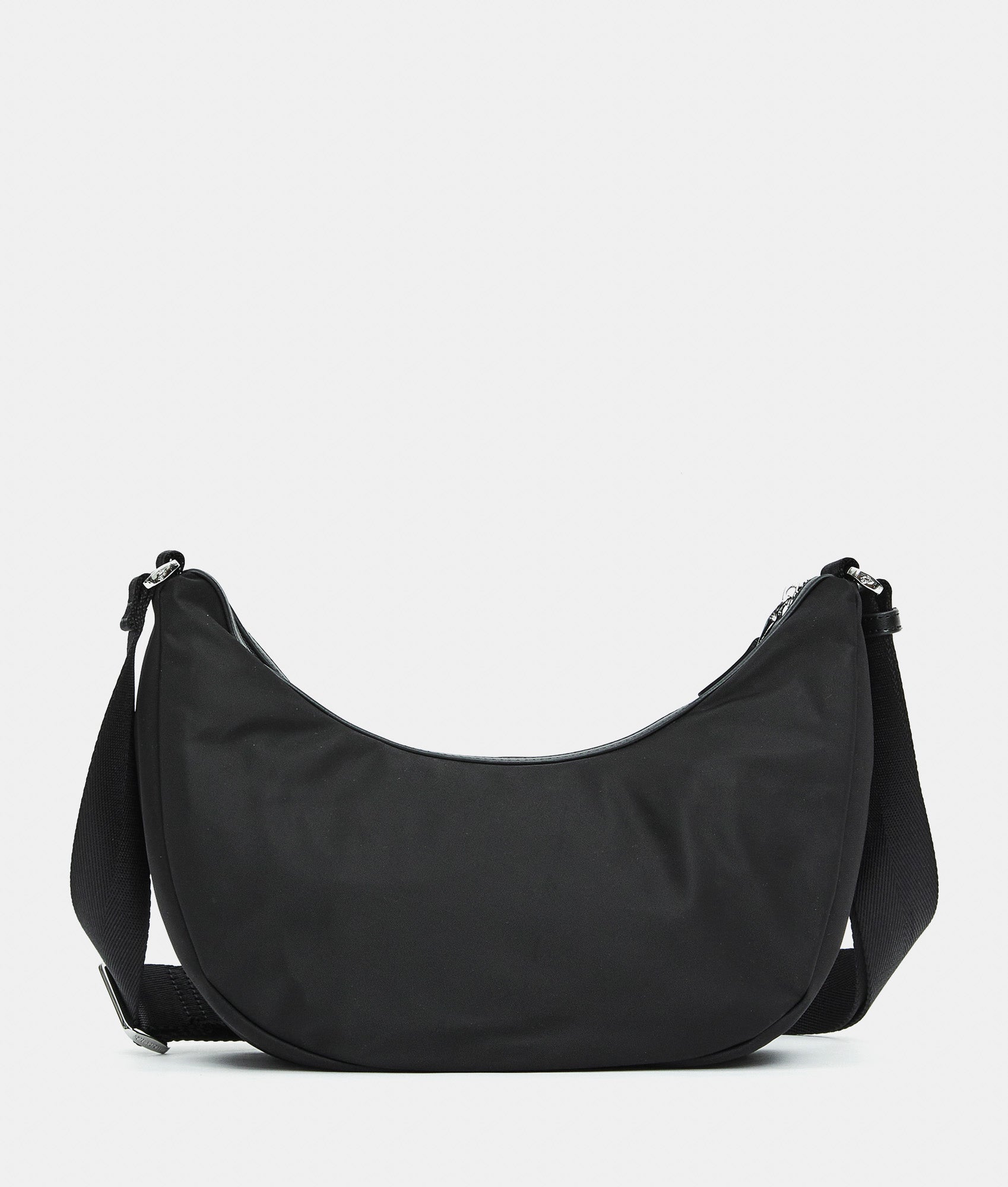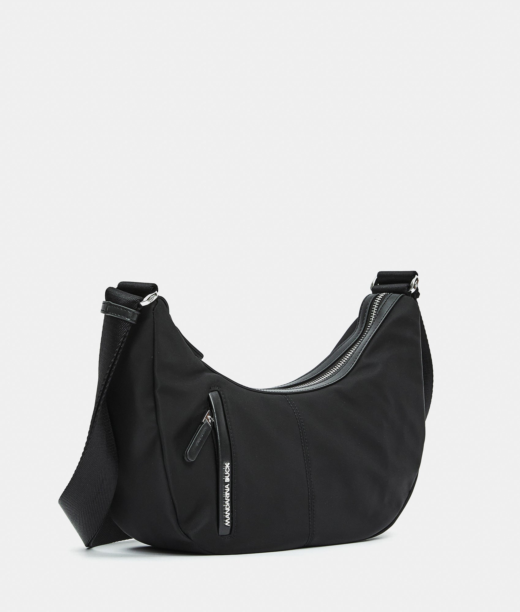 Borsa hobo a tracolla piccola con tasca frontale piatta con zip in tessuto. Doppia portabilità, dettagli personalizzati e tracolla e regolabile in jacquard.