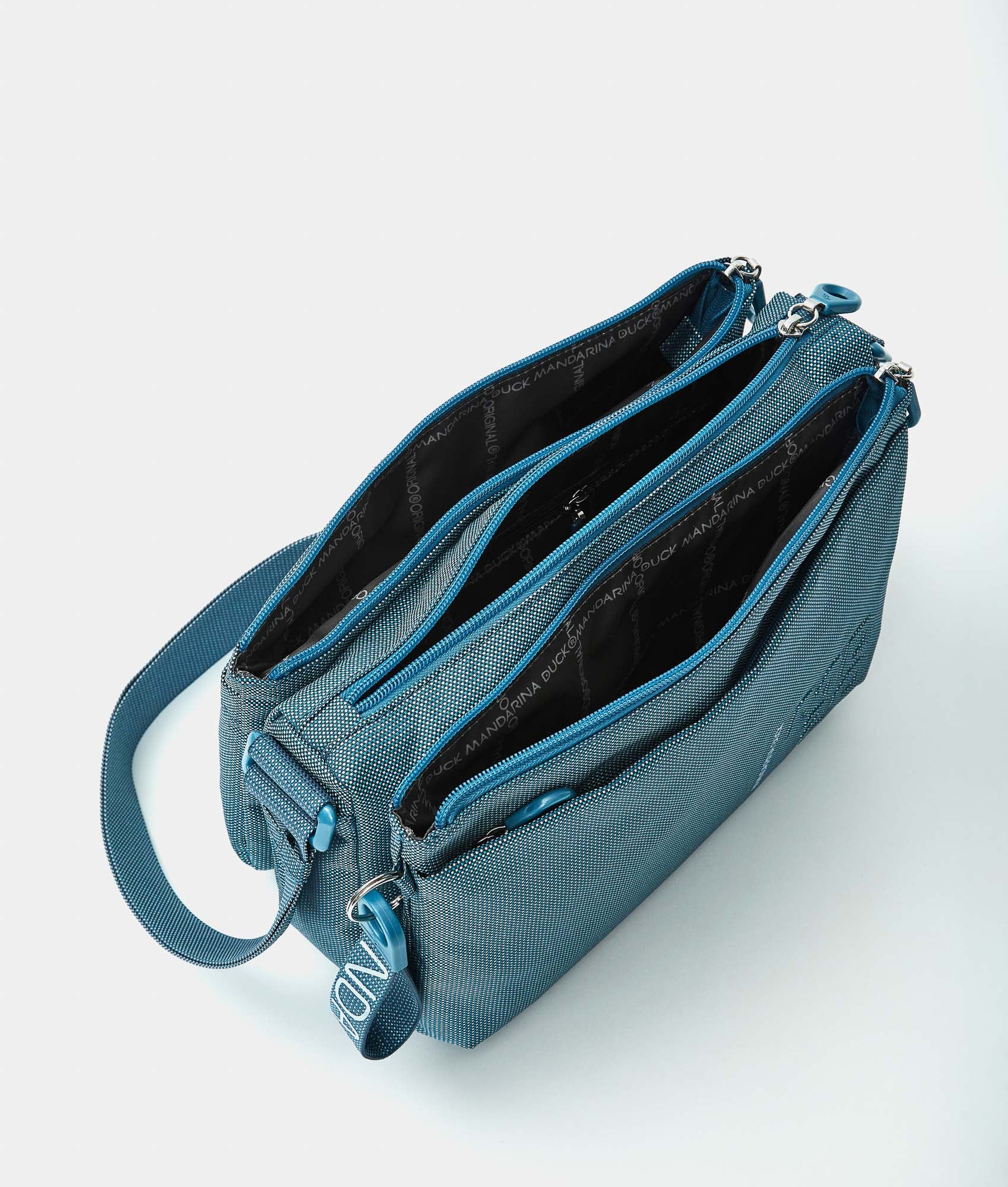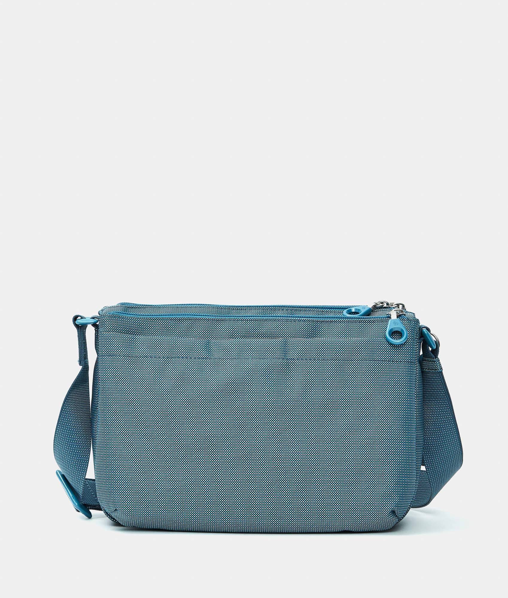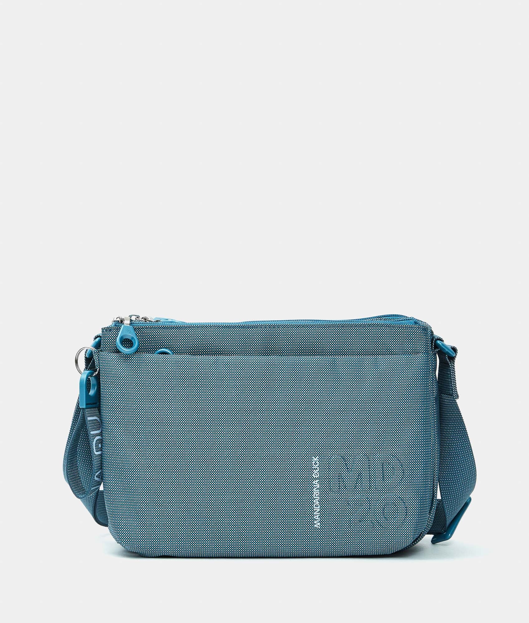 Medium Crossbody bag with triple internal compartments in fabric. Double portability, personalized details, and adjustable jacquard shoulder strap.