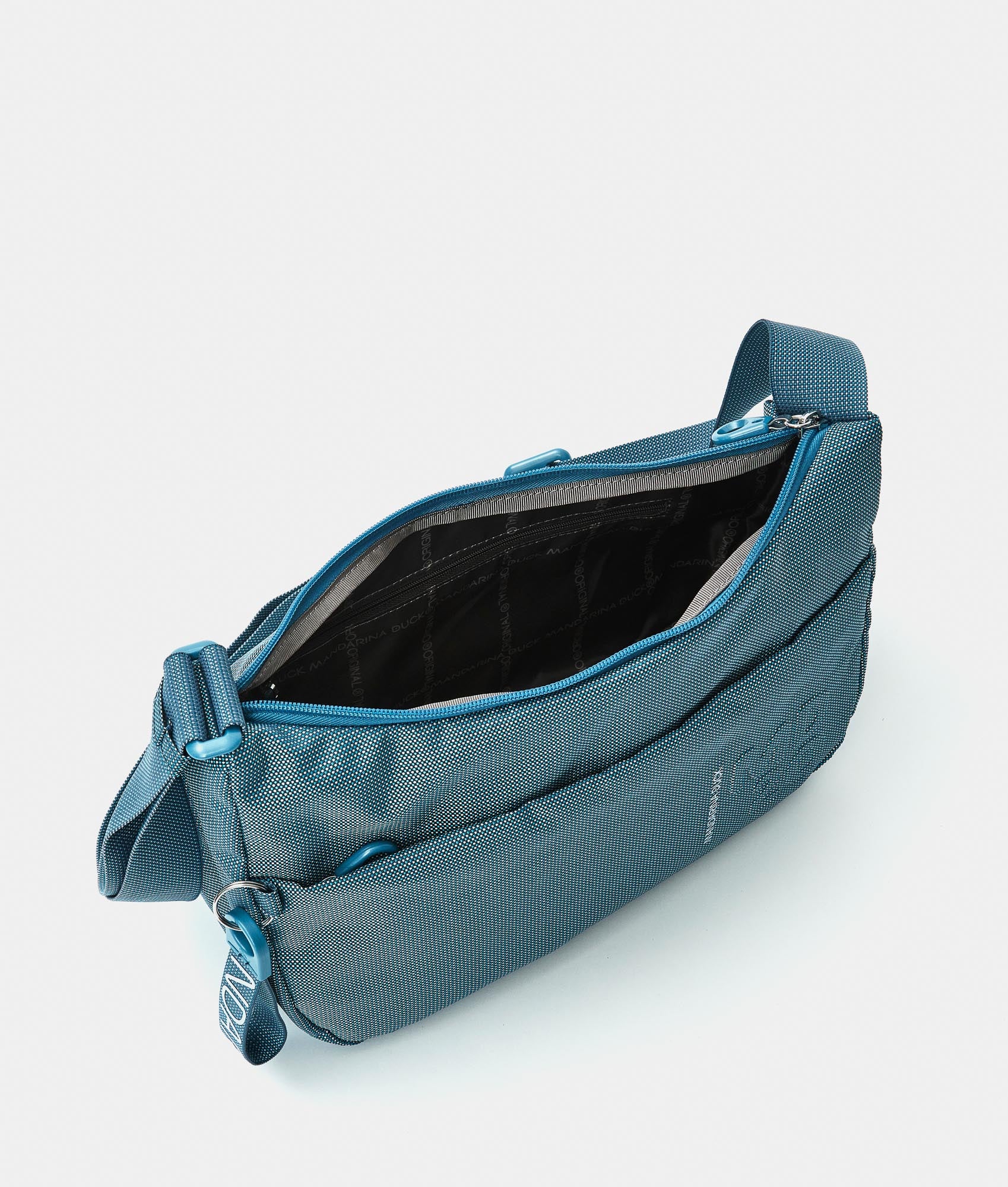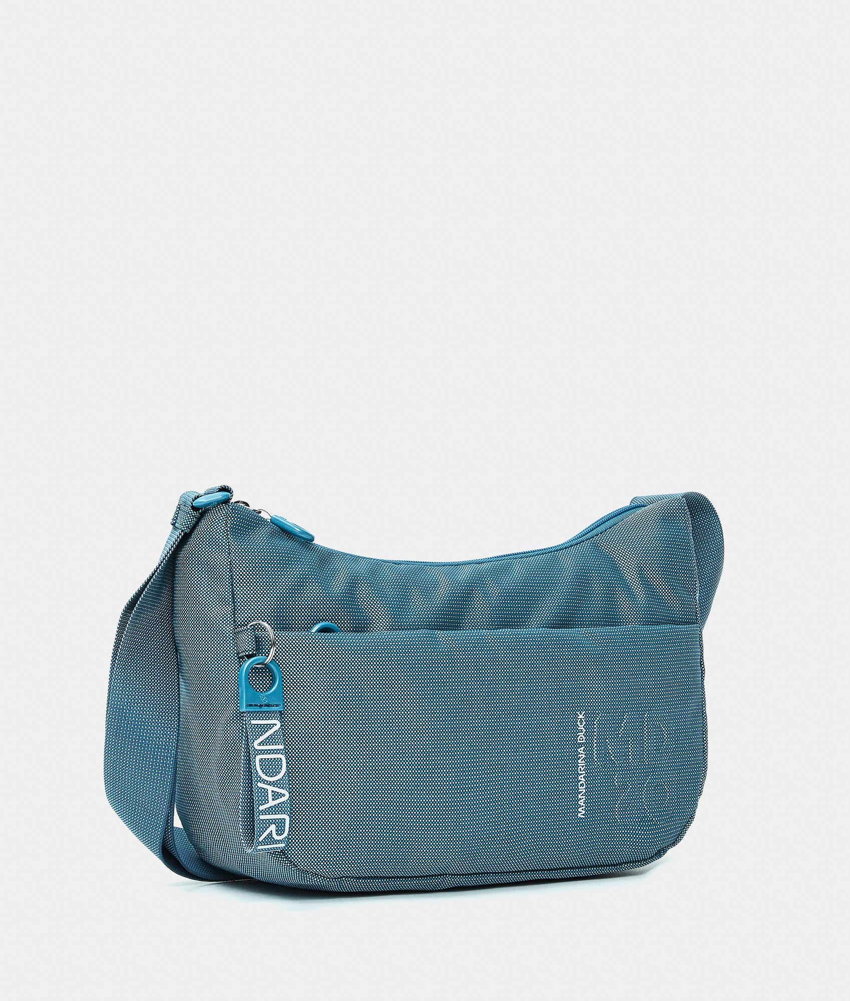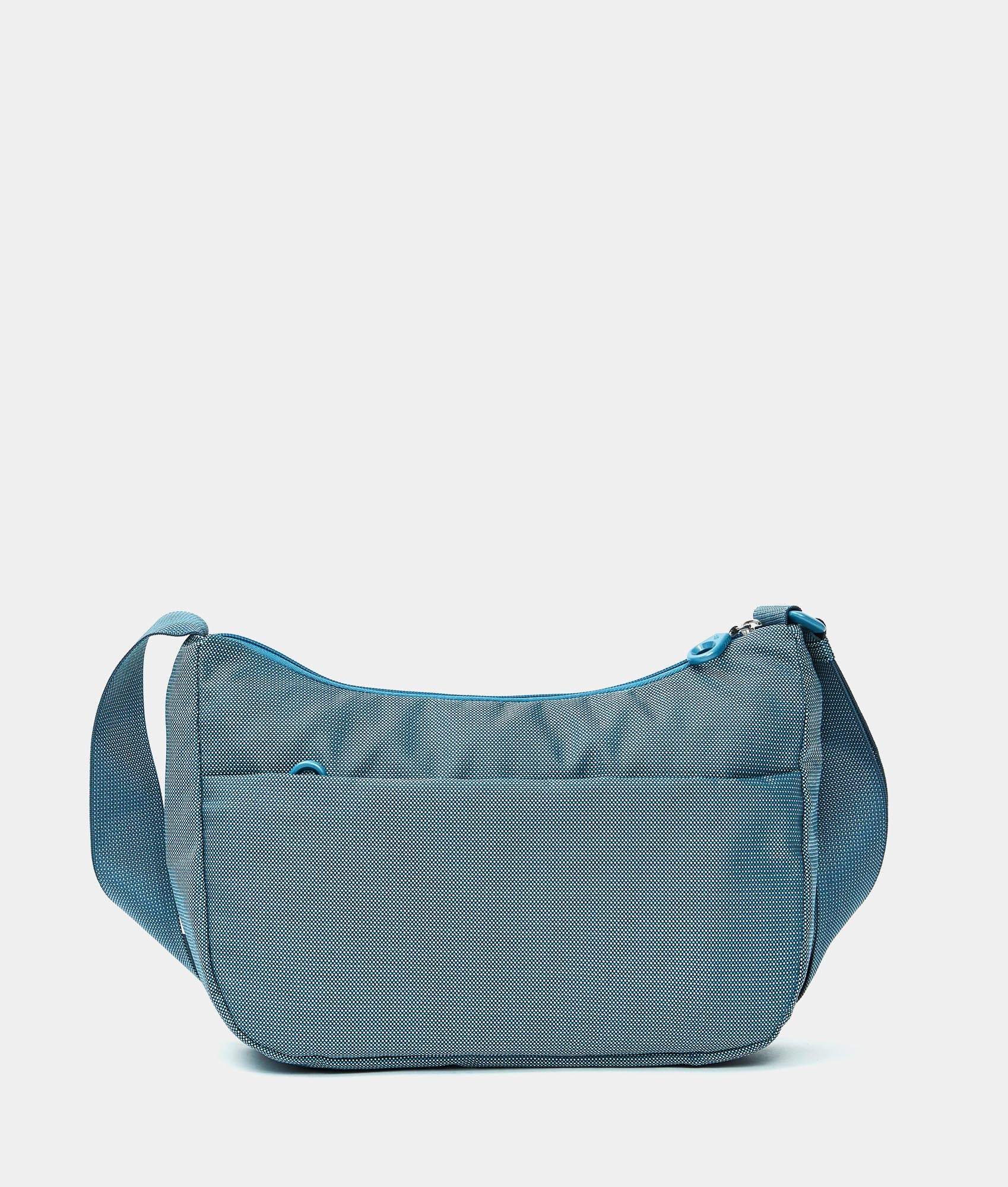 Medium crossbody bag with a flat pocket in fabric. Double portability, personalized detaills and adjustable jacquard shoulder strap.