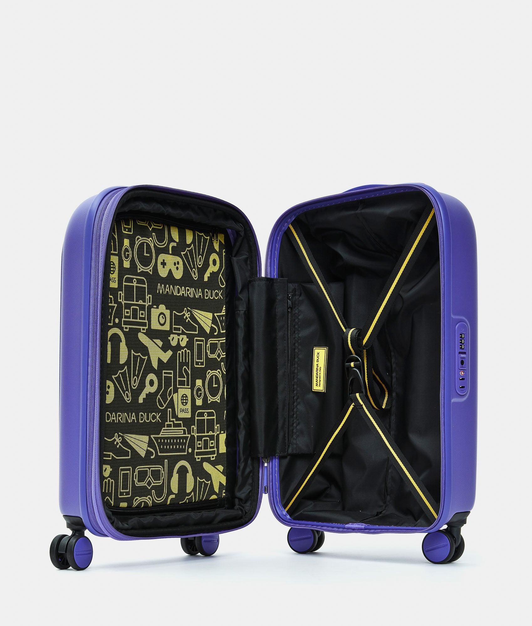 Organizzazione perfetta grazie alle cinghie elastiche incrociate nel comparto inferiore e al divisorio in fodera con tasca e rete con zip nel comparto superiore.